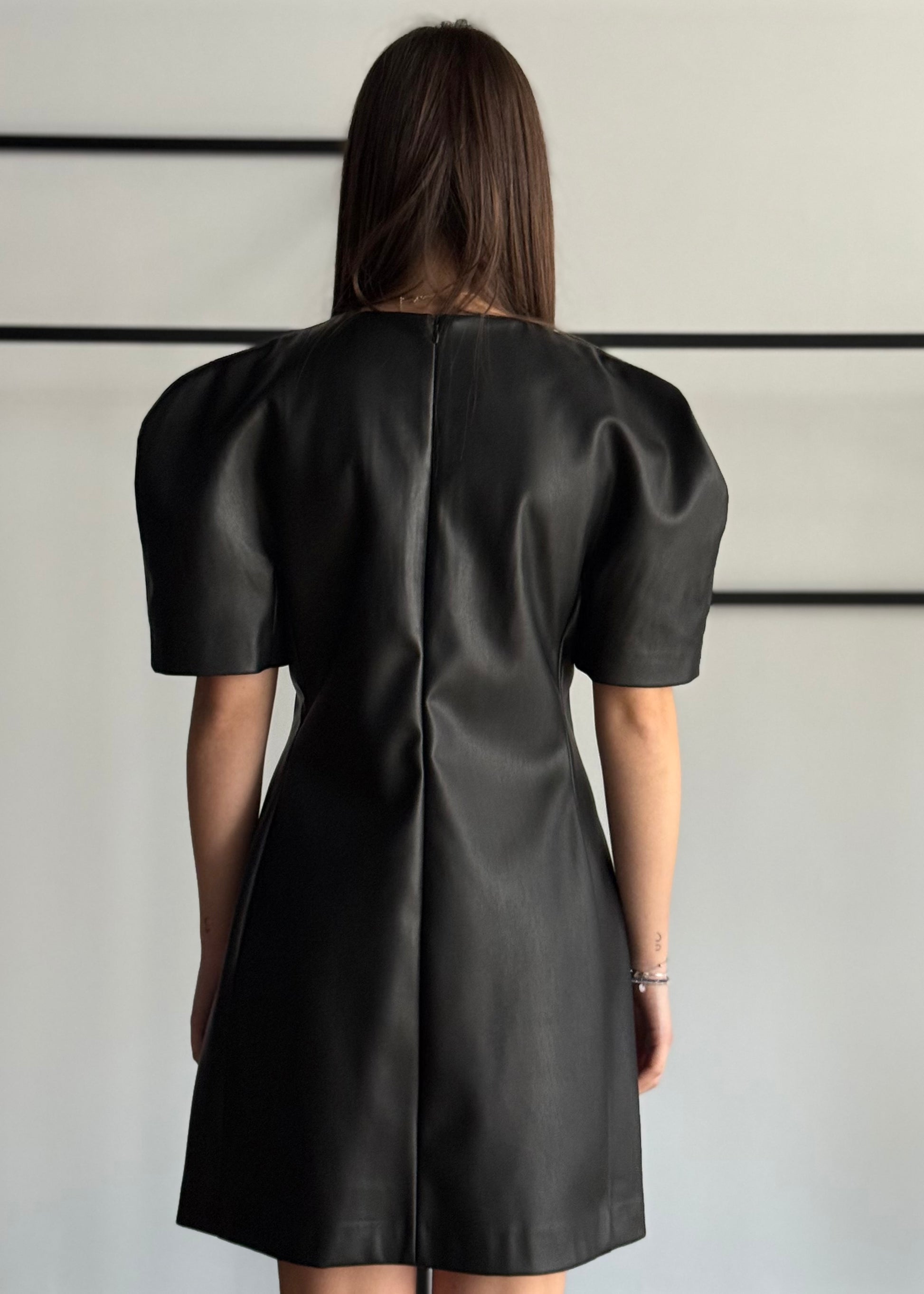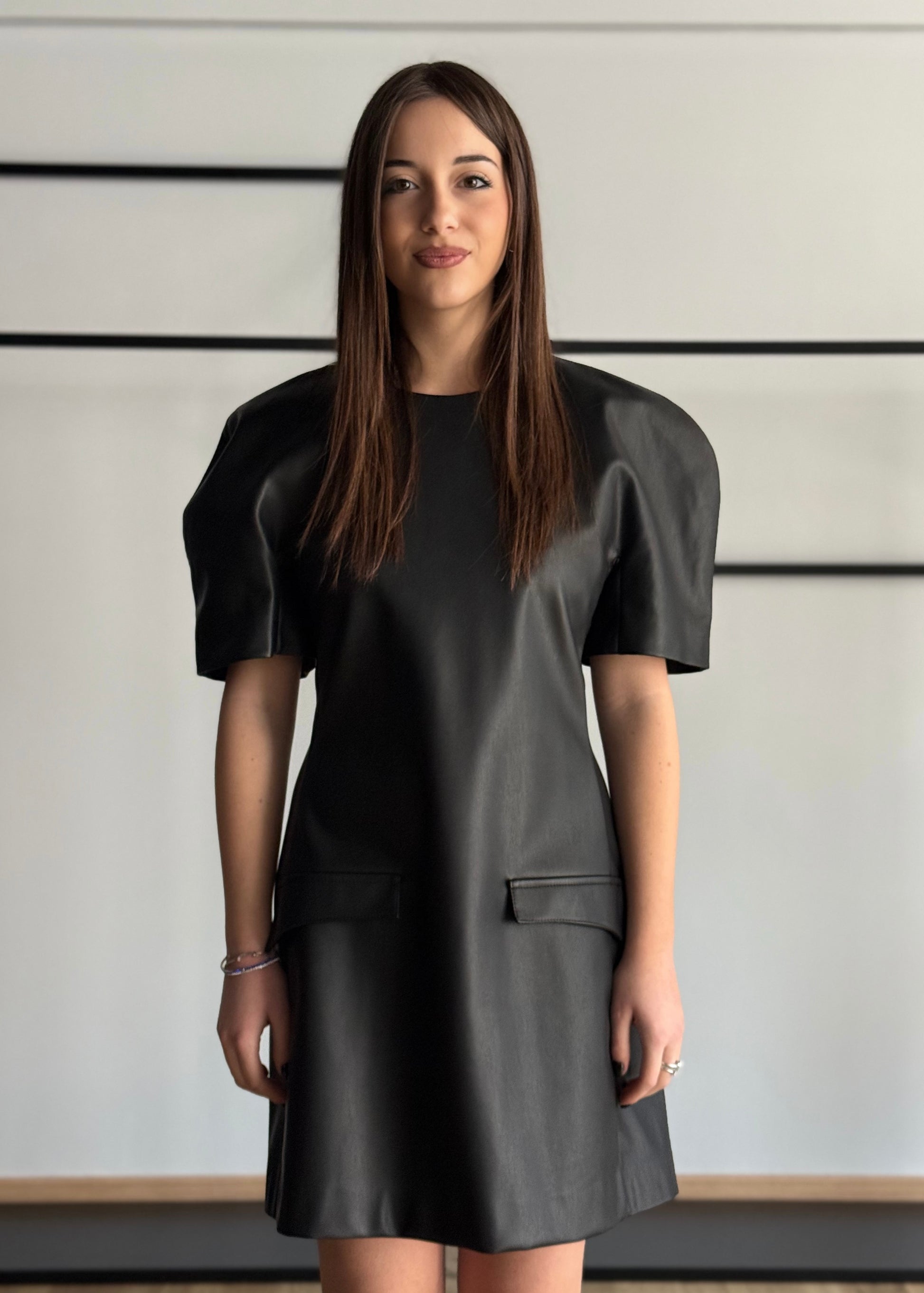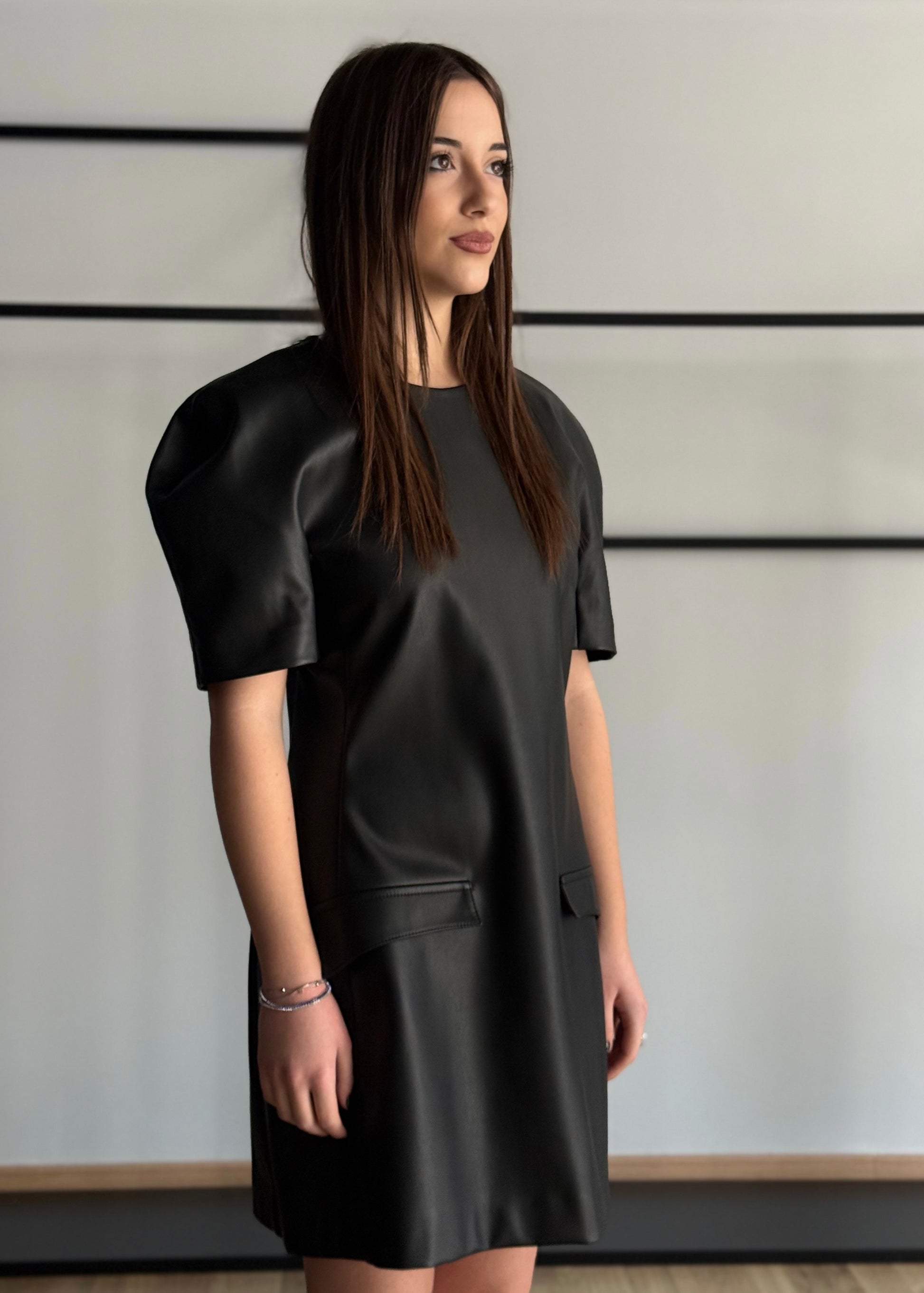 Un abito dal carattere deciso, perfetto per chi ama uno stile moderno e di forte impatto. Realizzato in ecopelle morbida, presenta una linea dritta che valorizza la silhouette senza fasciare. Le maniche strutturate, vero dettaglio distintivo, donano volume e un’estetica contemporanea da passerella.