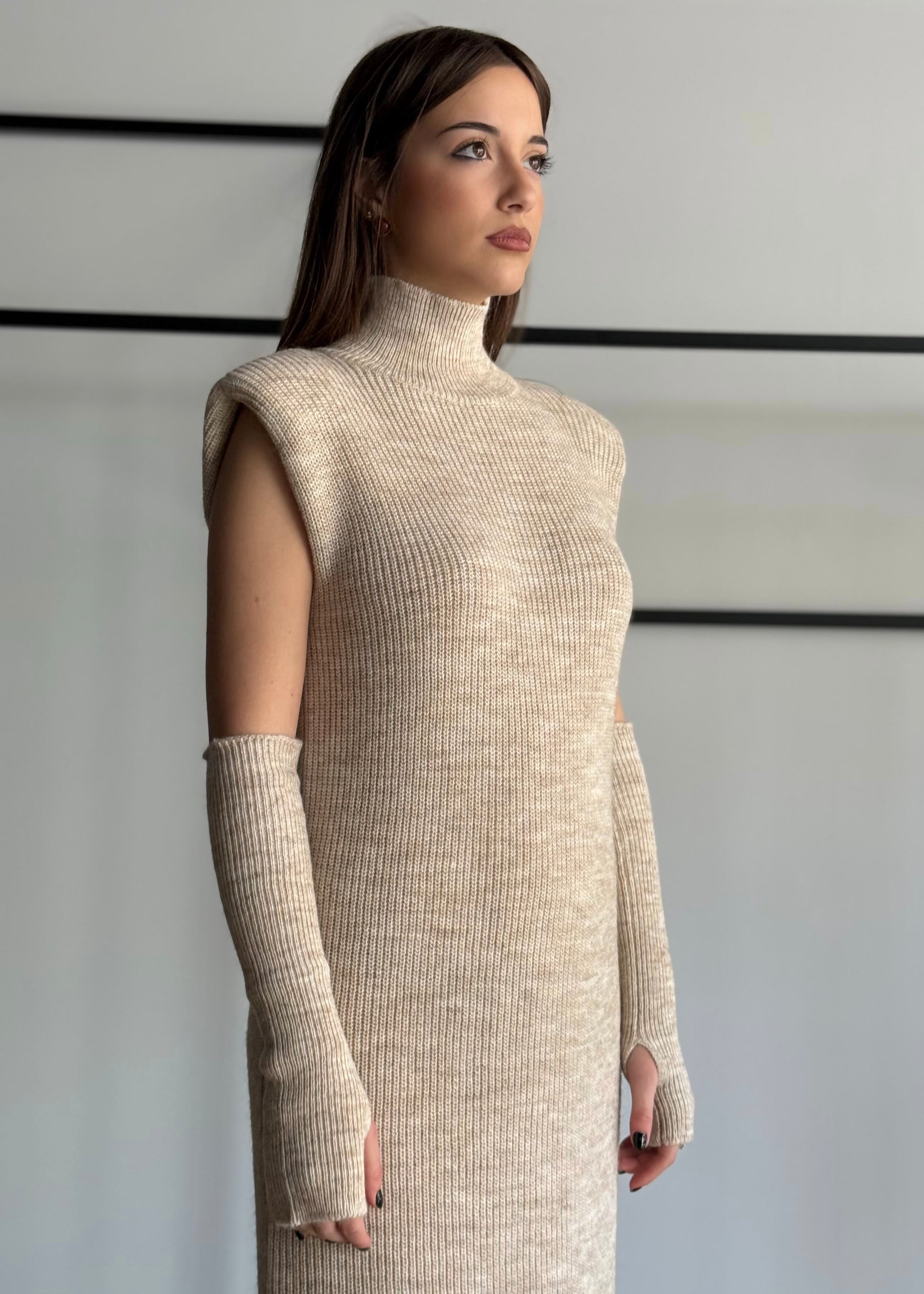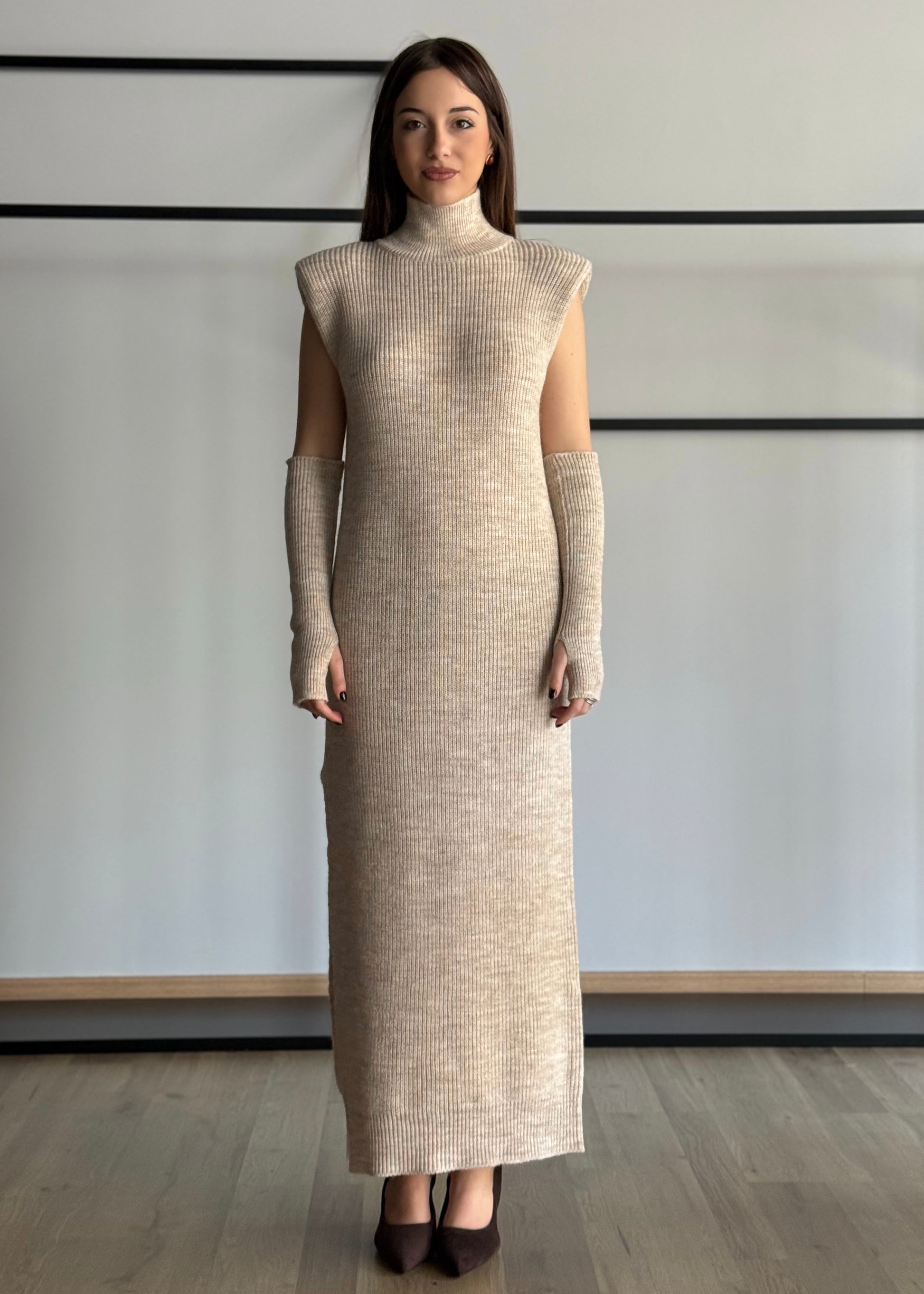 Un capo sofisticato e moderno, perfetto per l’inverno: questo abito maglia lungo unisce minimalismo e carattere grazie alla sua struttura in maglia compatta e al design pulito. Il collo alto conferisce un tocco raffinato, mentre le spalle scolpite donano una silhouette decisa e contemporanea.