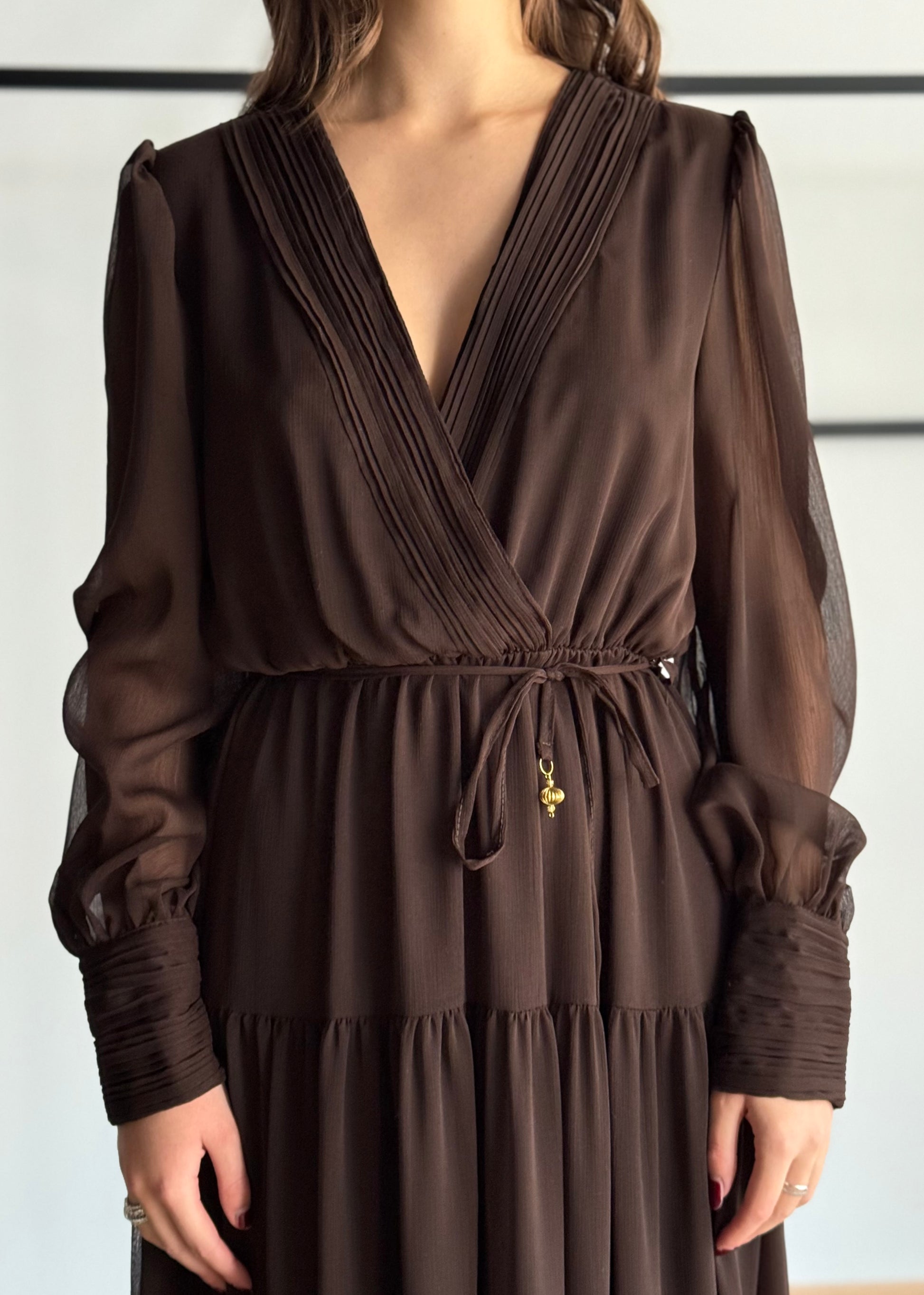 Abito lungo in chiffon leggero con scollo a V incrociato e dettagli plissé sul corpetto. Maniche lunghe con polsini arricciati, taglio in vita con cintura sottile e gonna a balze fluide. Elegante e femminile, perfetto per cerimonie o serate speciali.