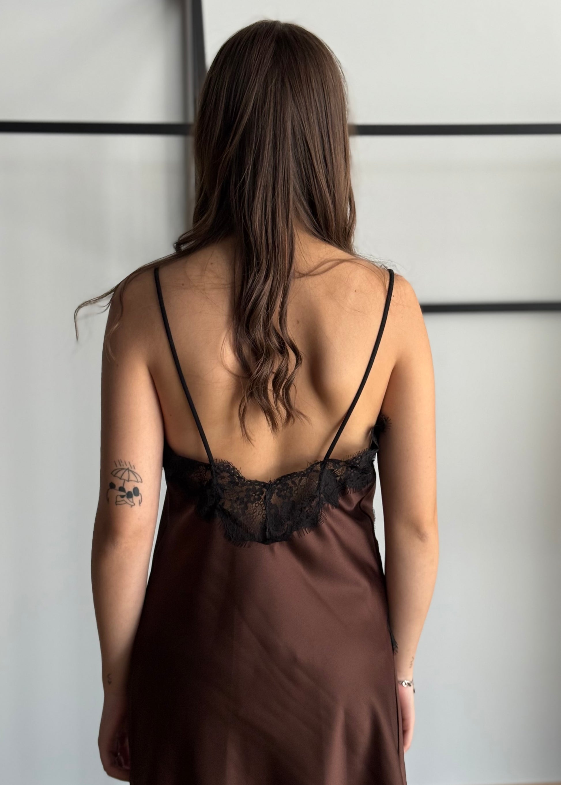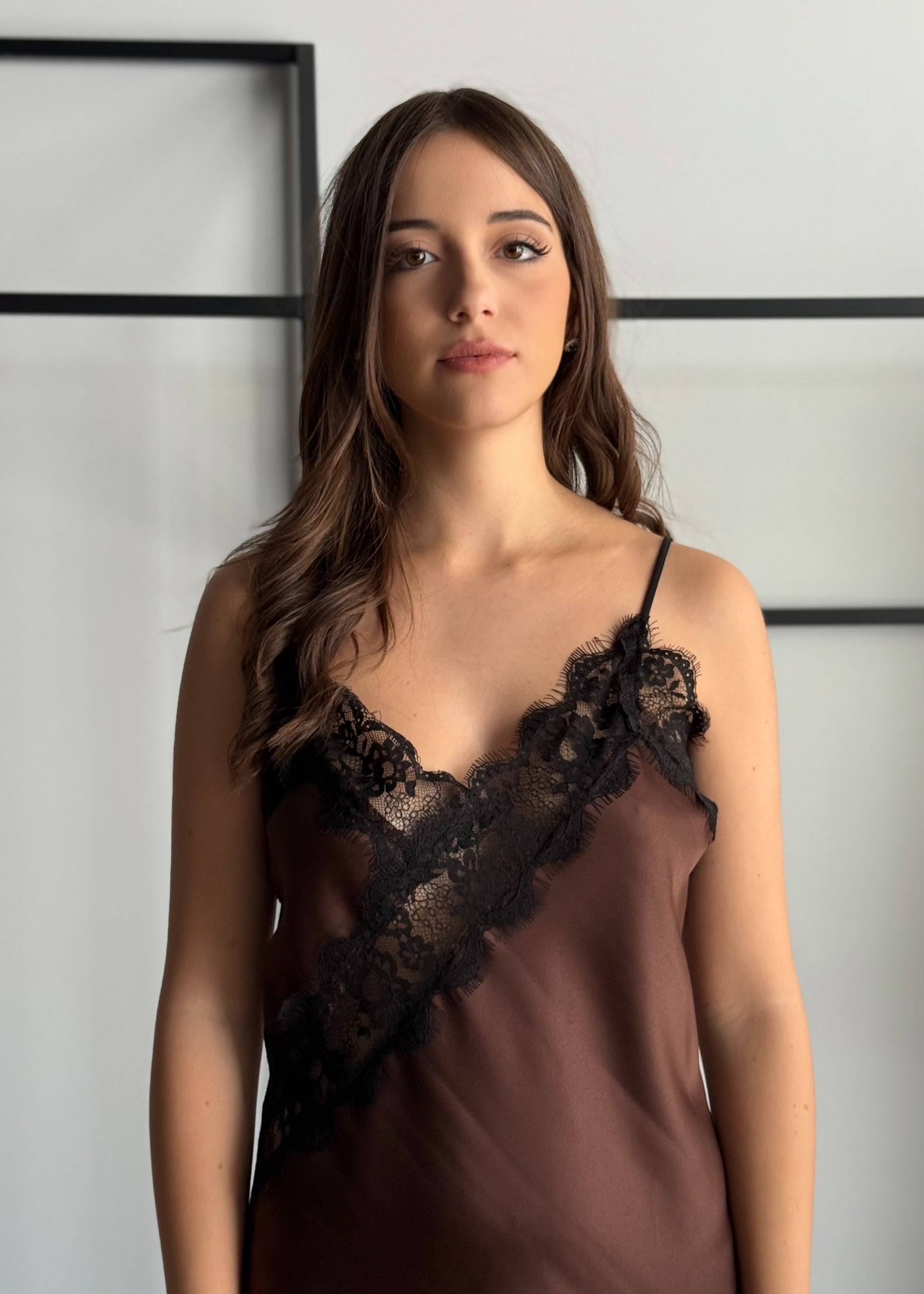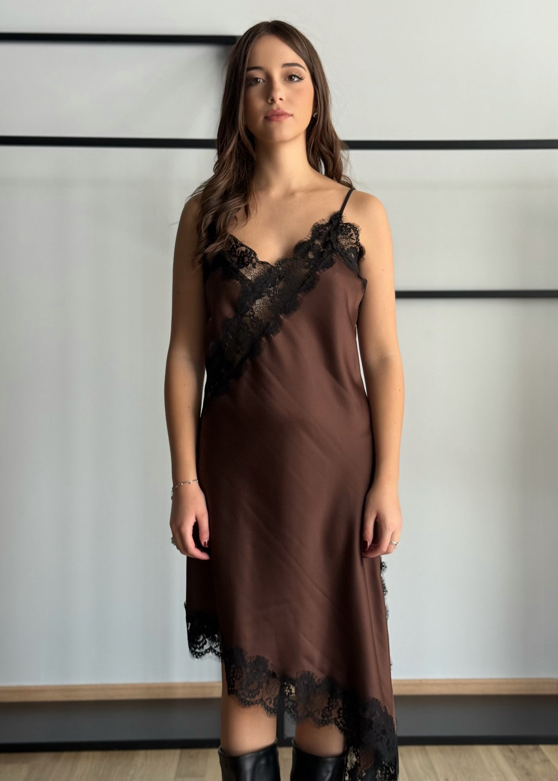 Abito sottoveste in raso con inserti in pizzo nero a contrasto, scollo a V e spalline sottili. Il fondo è rifinito con pizzo e presenta un taglio asimmetrico che esalta la silhouette. Elegante e sensuale, perfetto per serate speciali o look da occasione.