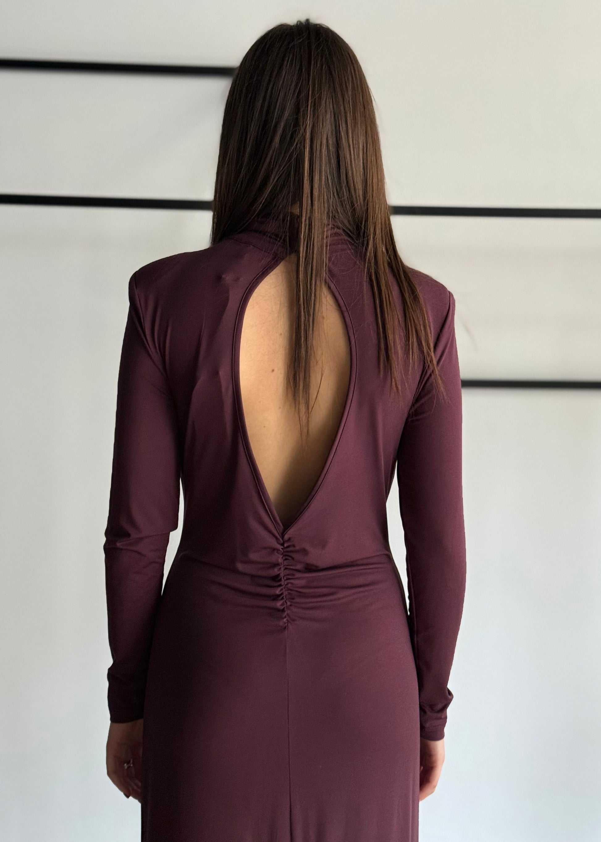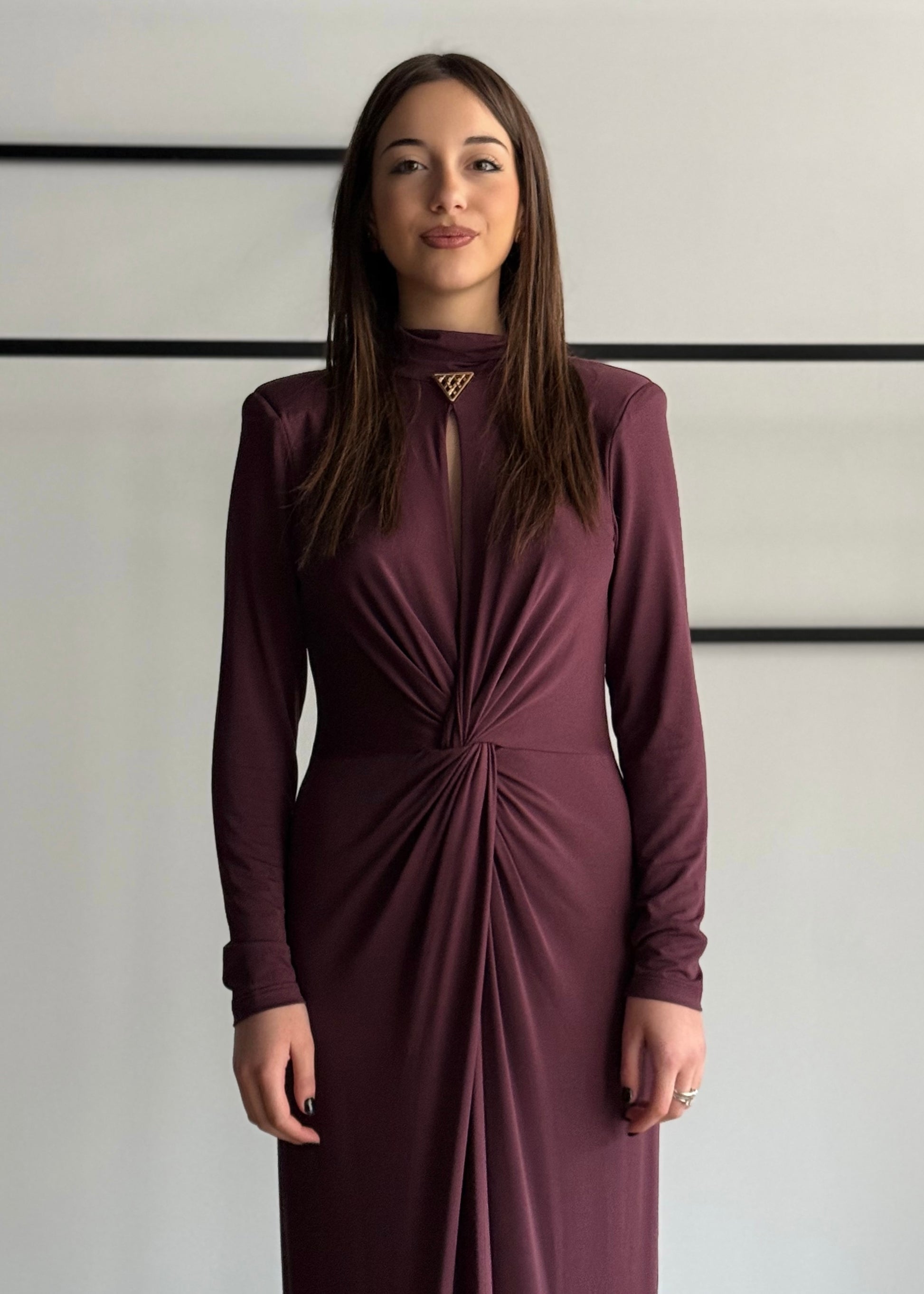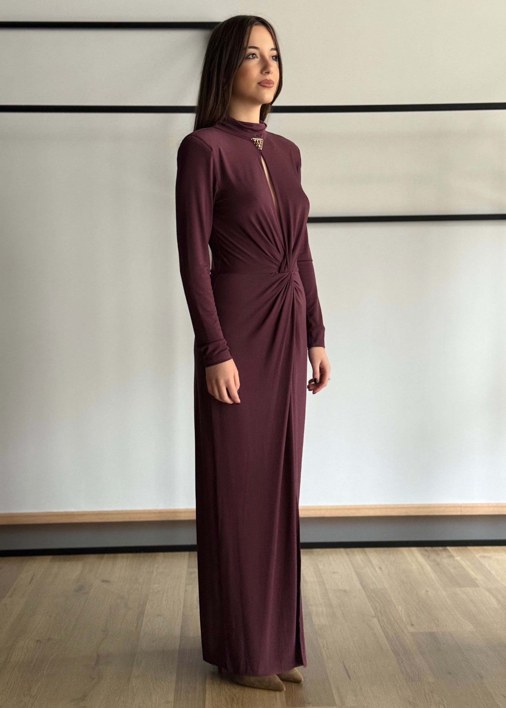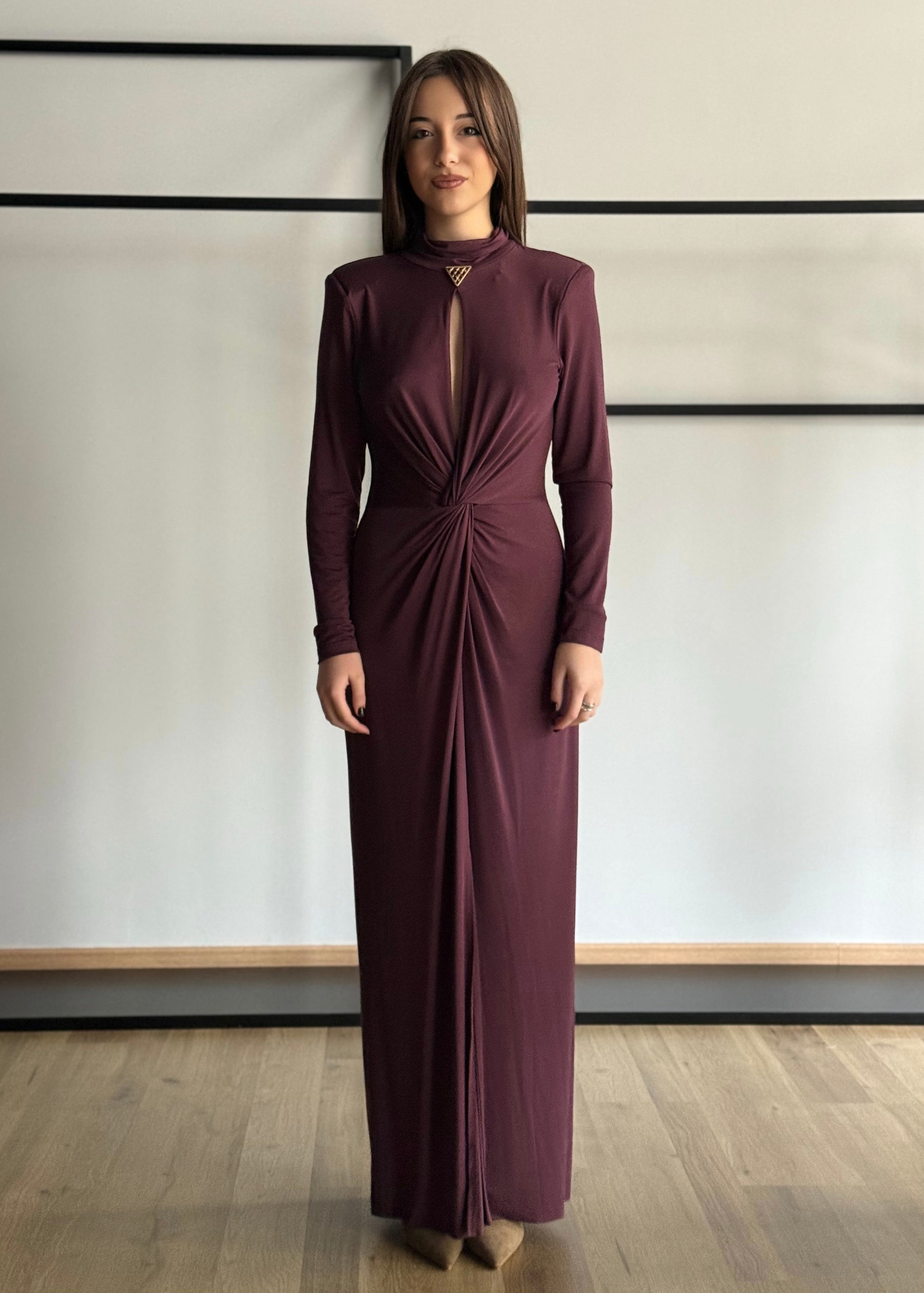 Questo abito lungo in tonalità prugna conquista con la sua eleganza sensuale e la linea morbidamente avvolgente. Il design è caratterizzato da un raffinato drappeggio frontale che valorizza la silhouette, arricchito da un’apertura centrale discreta ma d’impatto. Il collo alto è impreziosito da un dettaglio gioiello che illumina il look senza bisogno di ulteriori accessori.