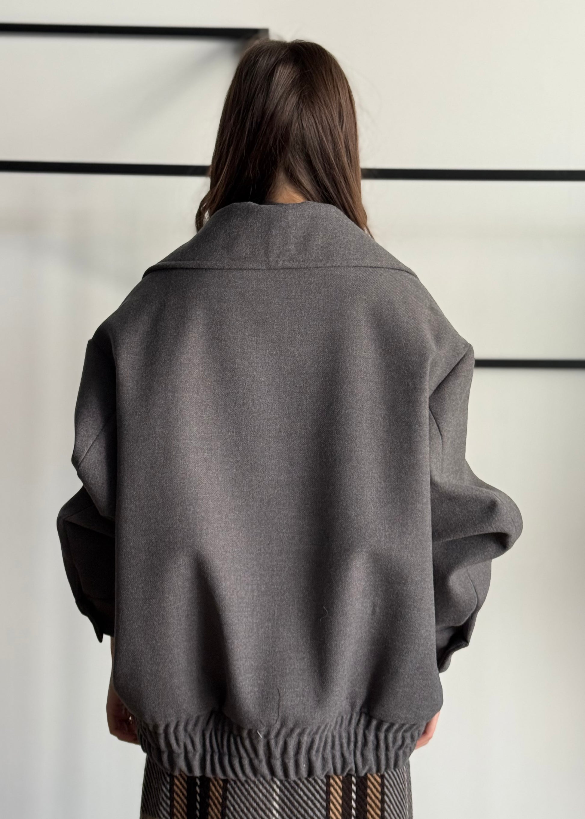 Un cappotto dall’eleganza decisa e contemporanea, perfetto per valorizzare ogni outfit con stile. Realizzato in un morbido tessuto effetto lana, questo modello doppiopetto presenta una silhouette oversize e linee strutturate, con maxi rever e maniche drappeggiate che conferiscono un tocco couture.