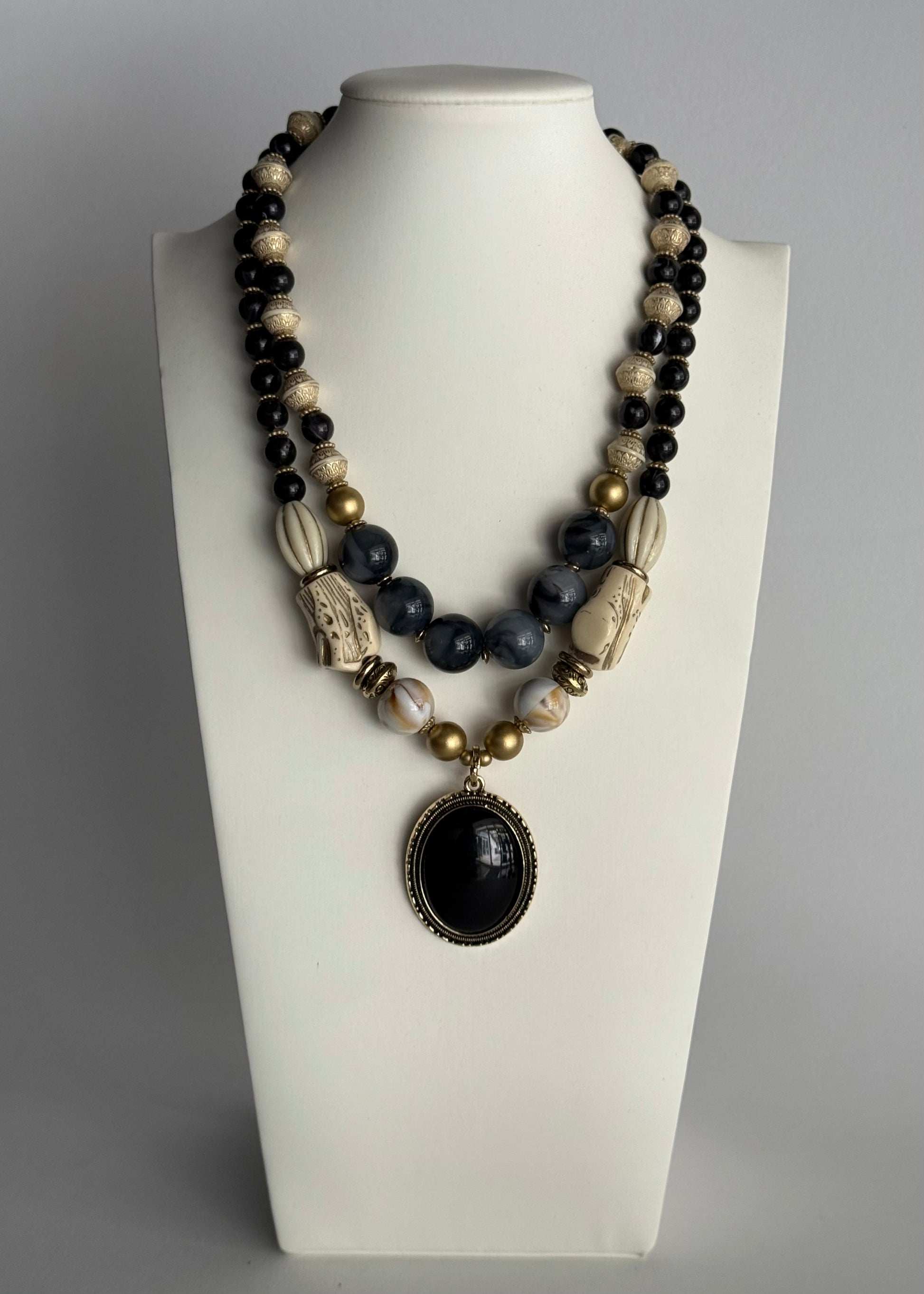 Collana artigianale a doppio filo con perle in tonalità nere, dorate e avorio, arricchita da elementi lavorati e maxi pendente ovale nero. Un gioiello dal carattere etnico-chic, ideale per dare personalità e stile a ogni outfit.