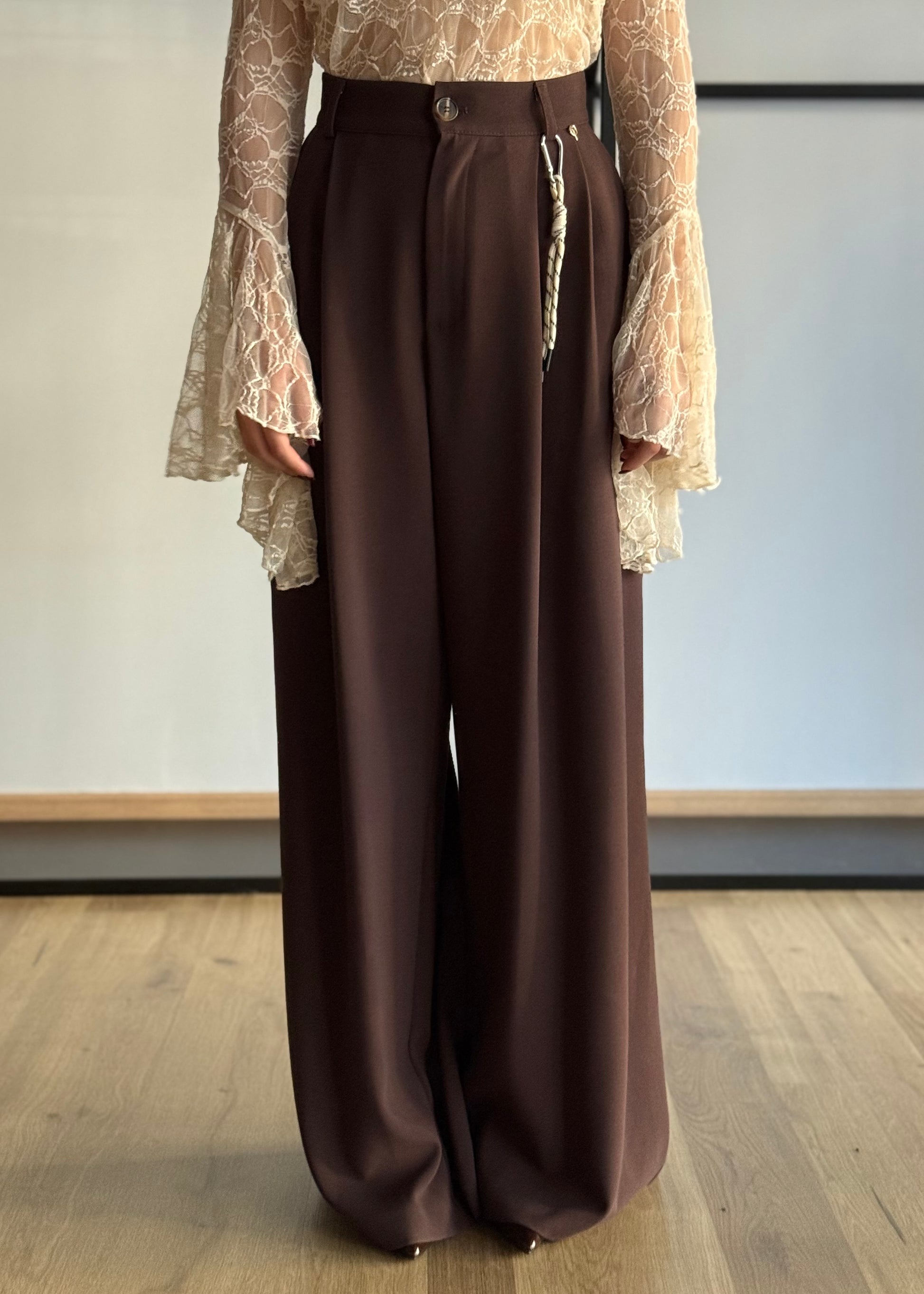 Un completo elegante e contemporaneo, composto da gilet e pantalone palazzo in tessuto fluido color cioccolato. Il gilet, con scollo a V e bottoni frontali, valorizza la silhouette con un taglio sartoriale e moderno. I pantaloni a vita alta presentano pinces frontali e gamba ampia per un fit comodo e sofisticato, perfetti da indossare sia in ufficio che per un’occasione speciale.