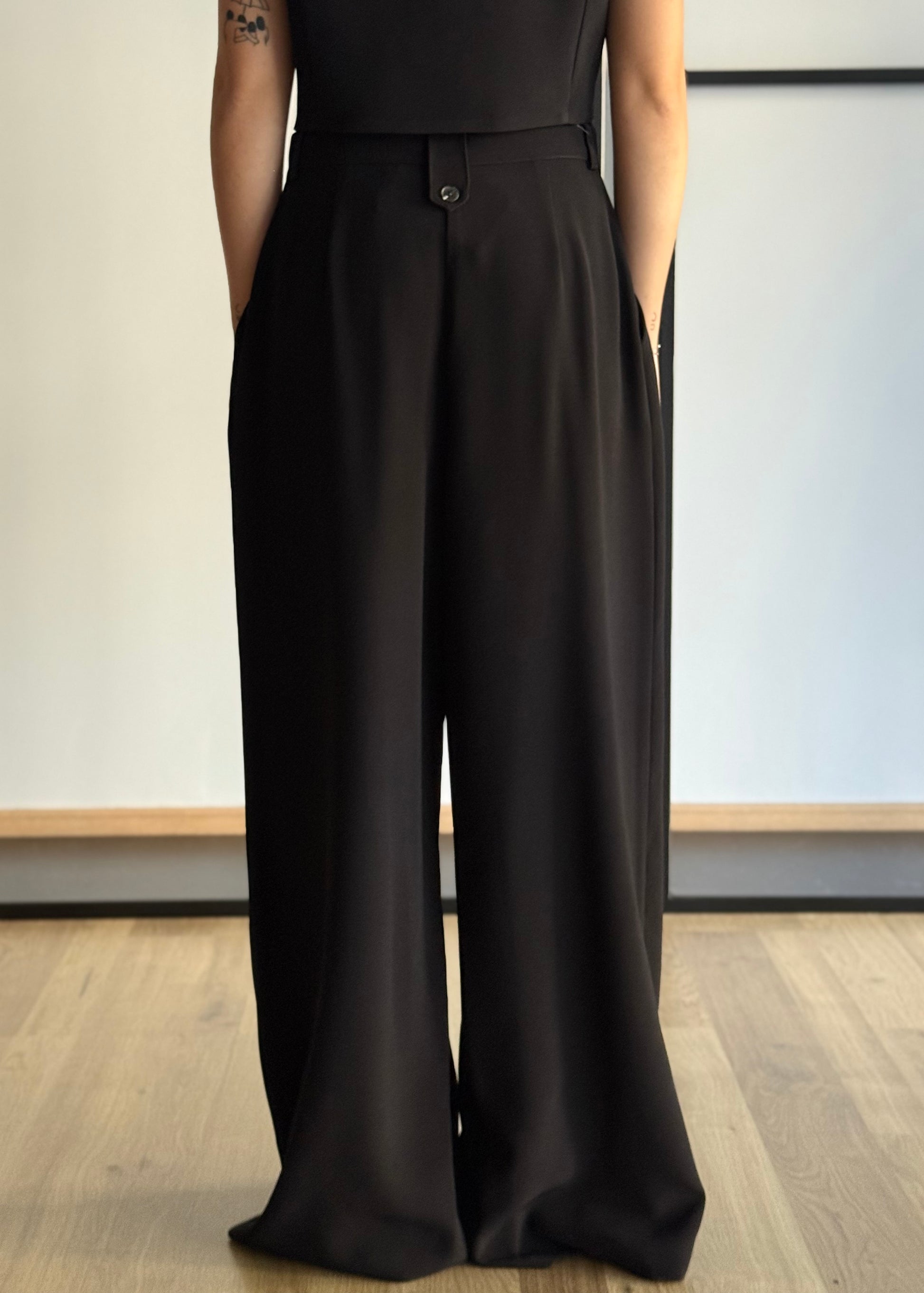 Un completo elegante e contemporaneo, composto da gilet e pantalone palazzo in tessuto fluido color nero. Il gilet, con scollo a V e bottoni frontali, valorizza la silhouette con un taglio sartoriale e moderno. I pantaloni a vita alta presentano pinces frontali e gamba ampia per un fit comodo e sofisticato, perfetti da indossare sia in ufficio che per un’occasione speciale.