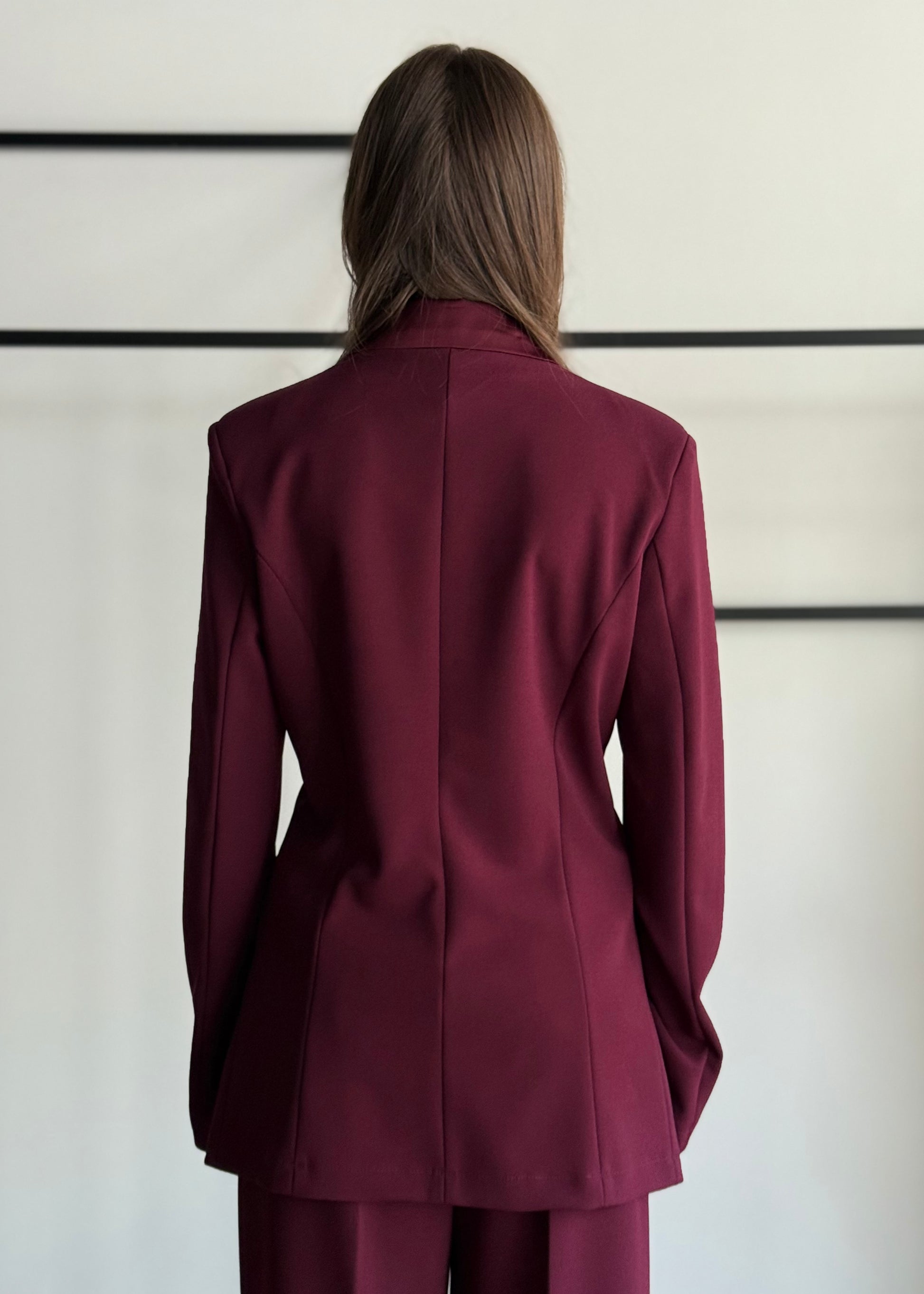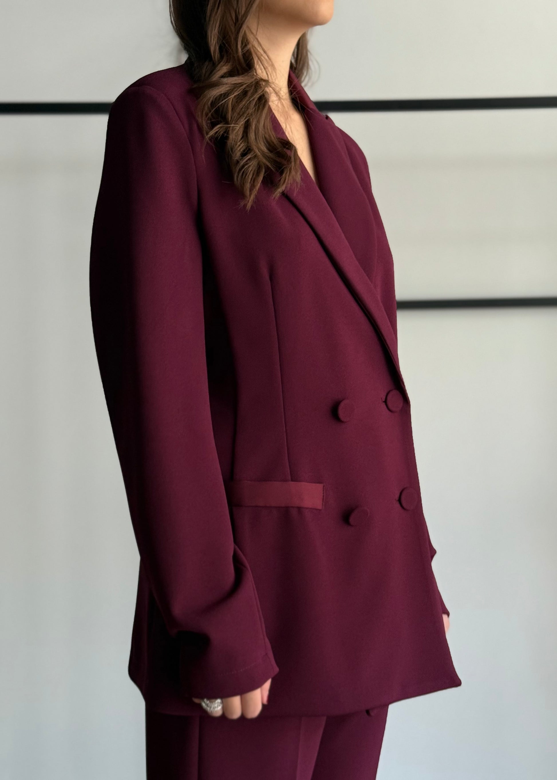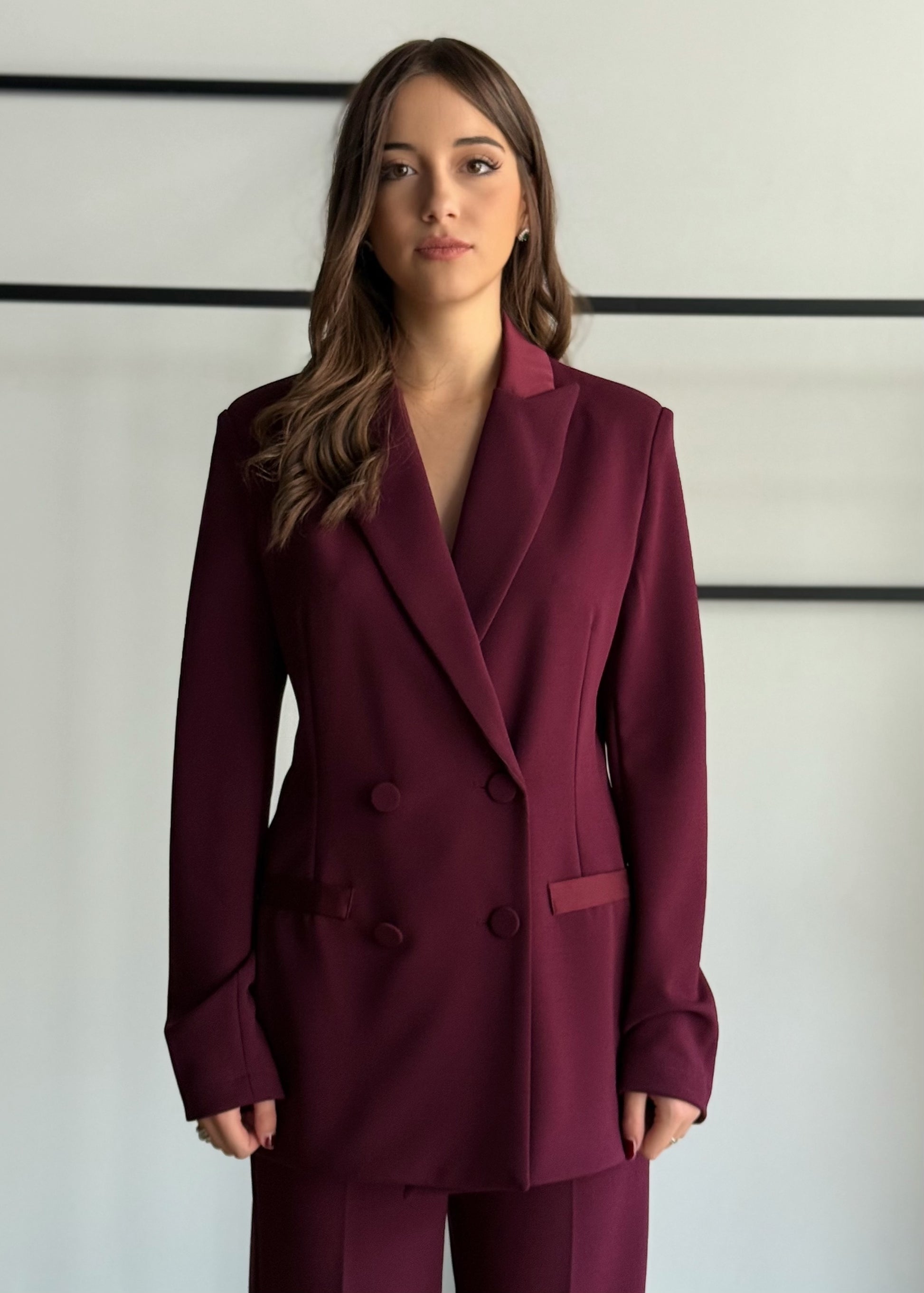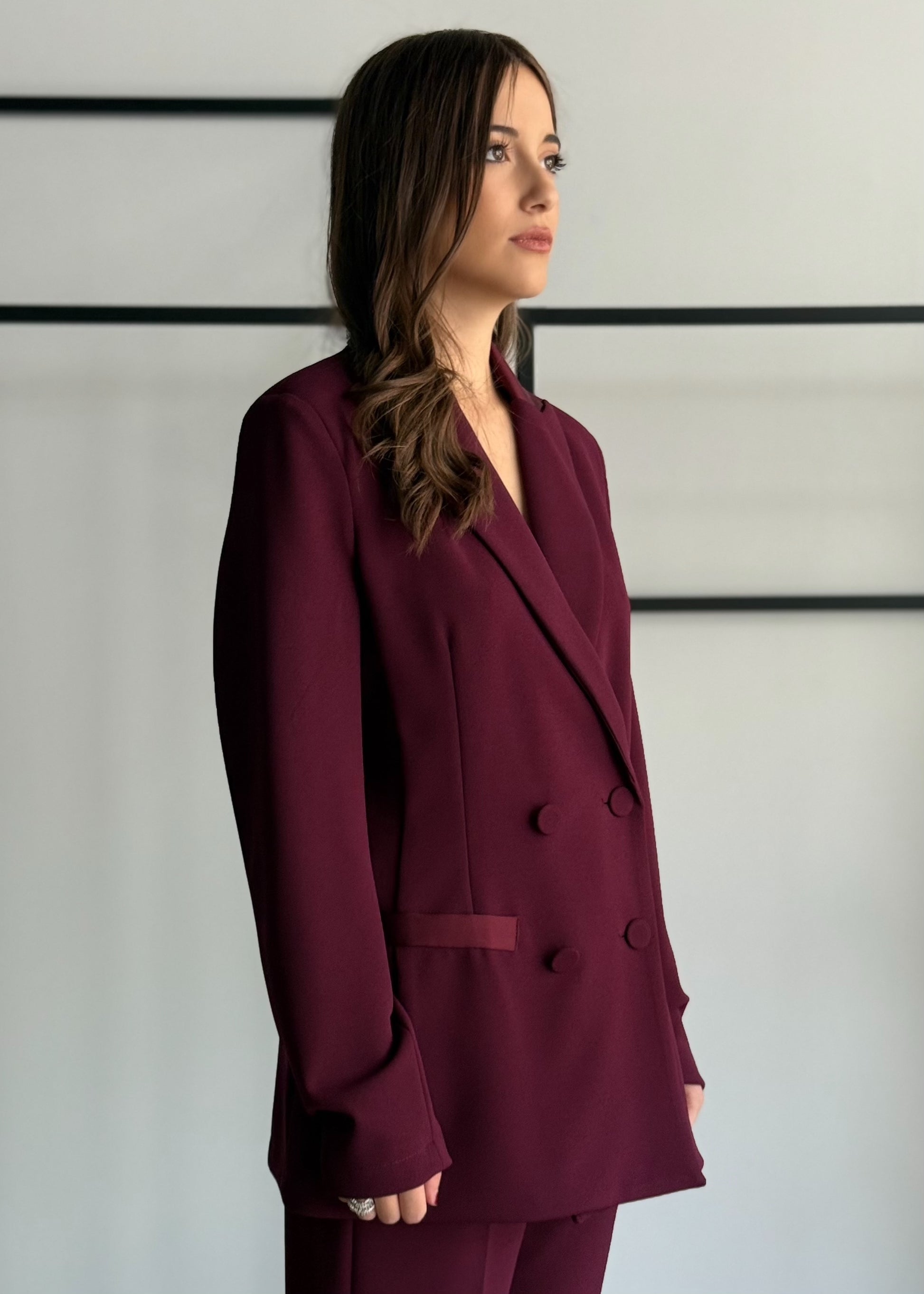 Giacca doppiopetto in tessuto strutturato color bordeaux, con bottoni rivestiti tono su tono e tasche frontali. Il taglio sartoriale e la linea leggermente svasata la rendono un capo versatile, ideale sia per look formali che per outfit più casual chic.