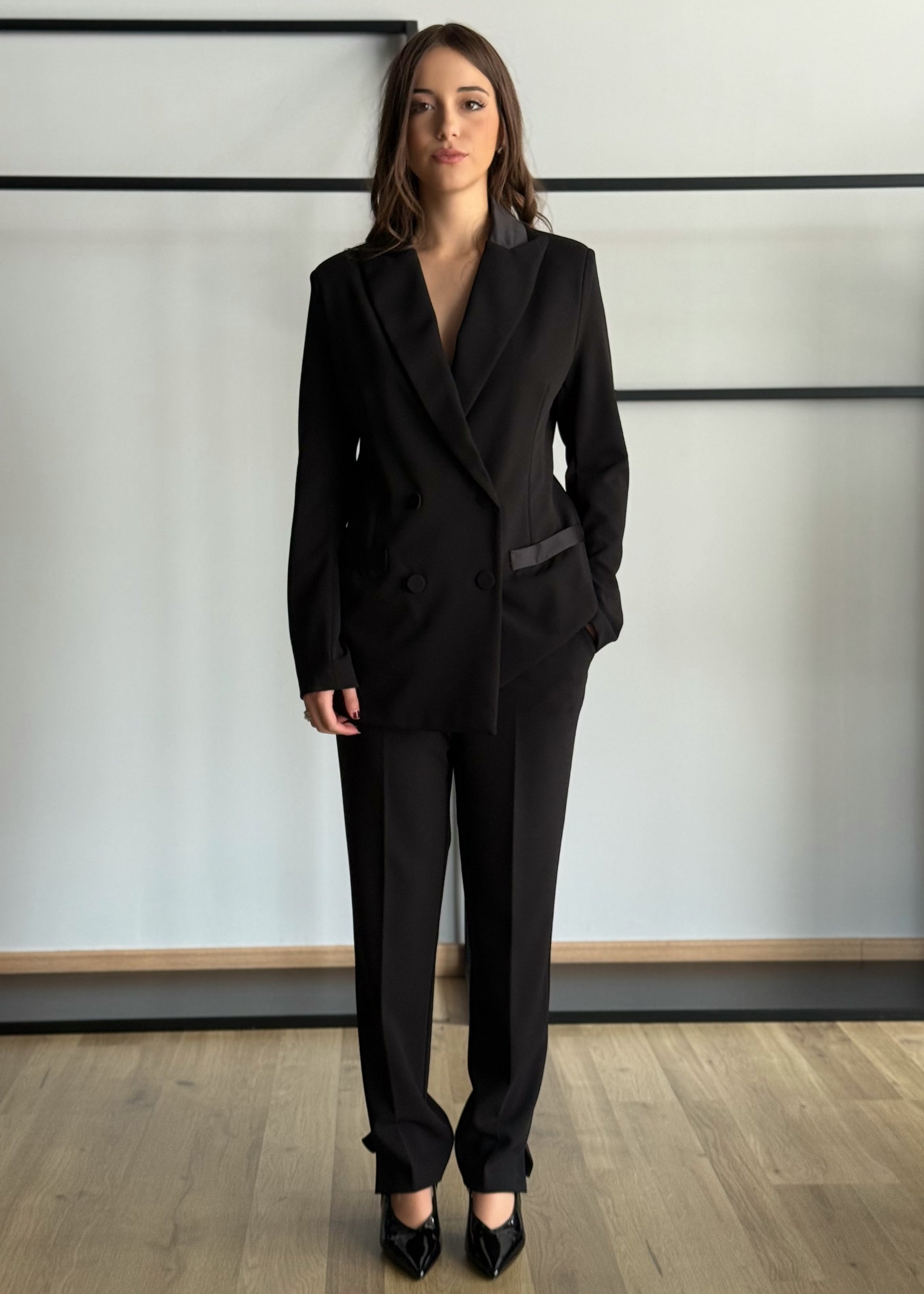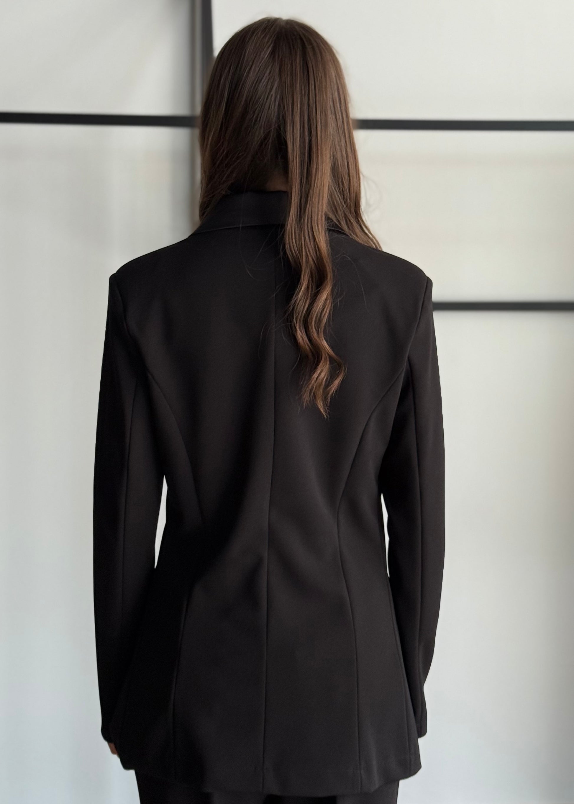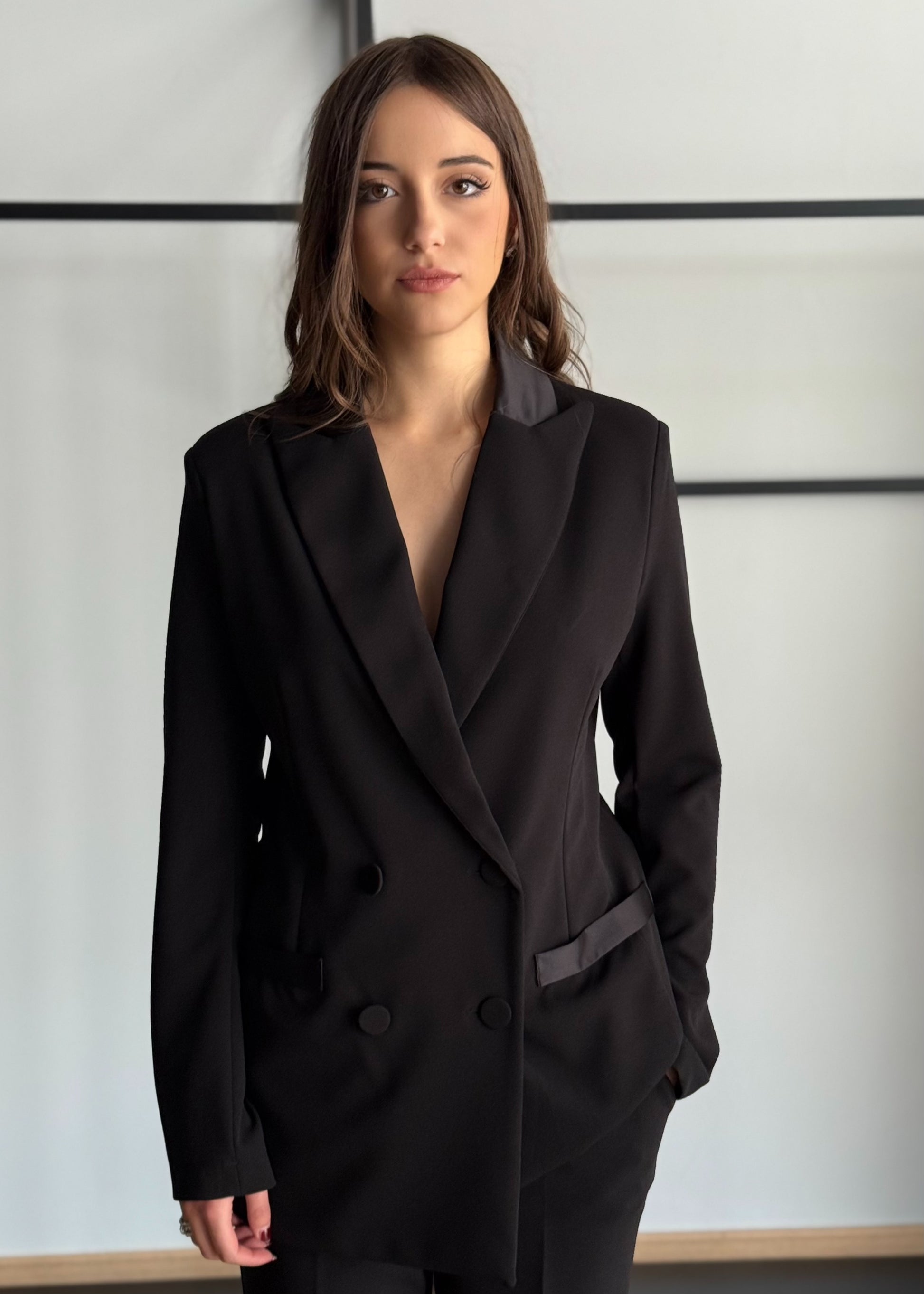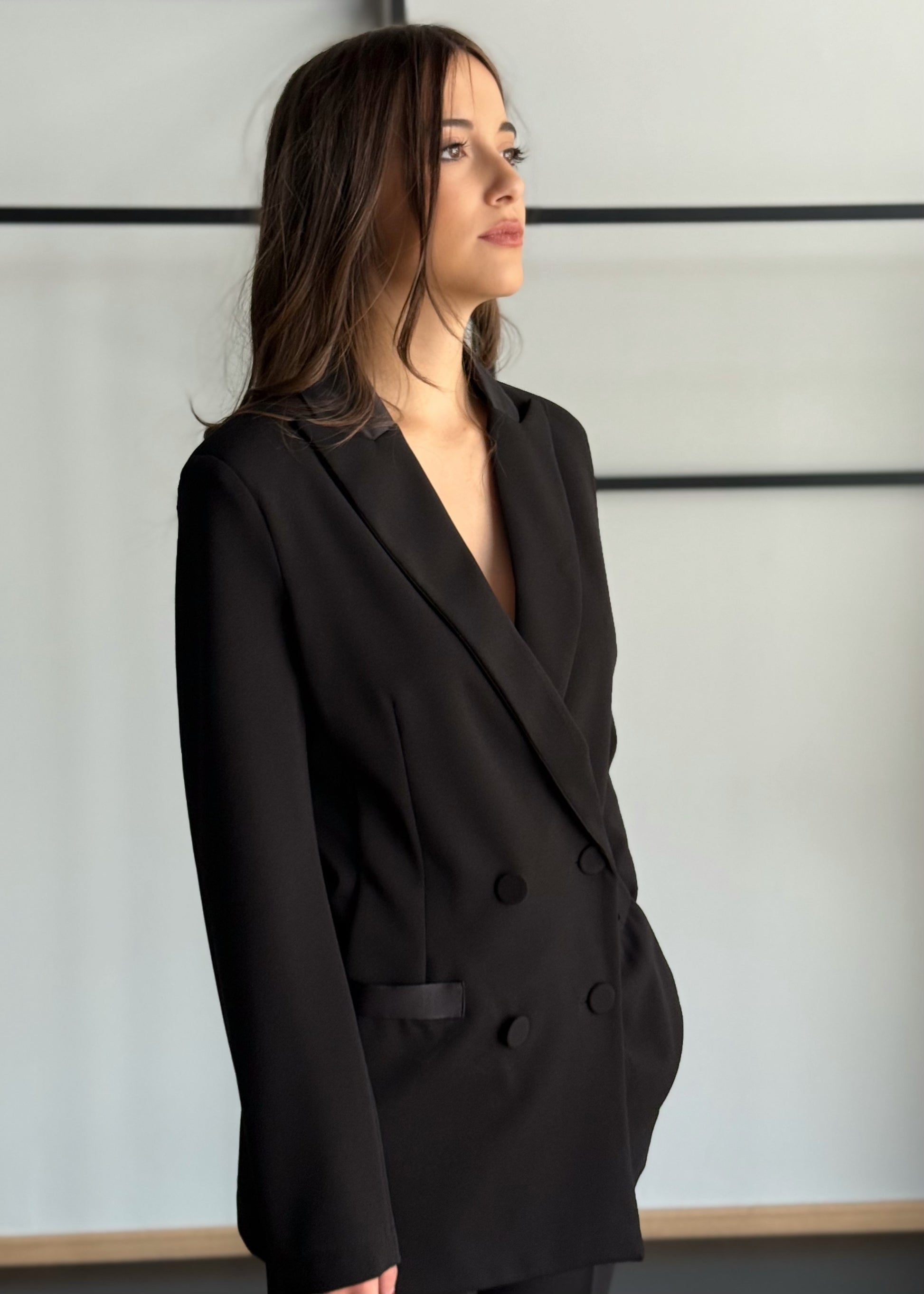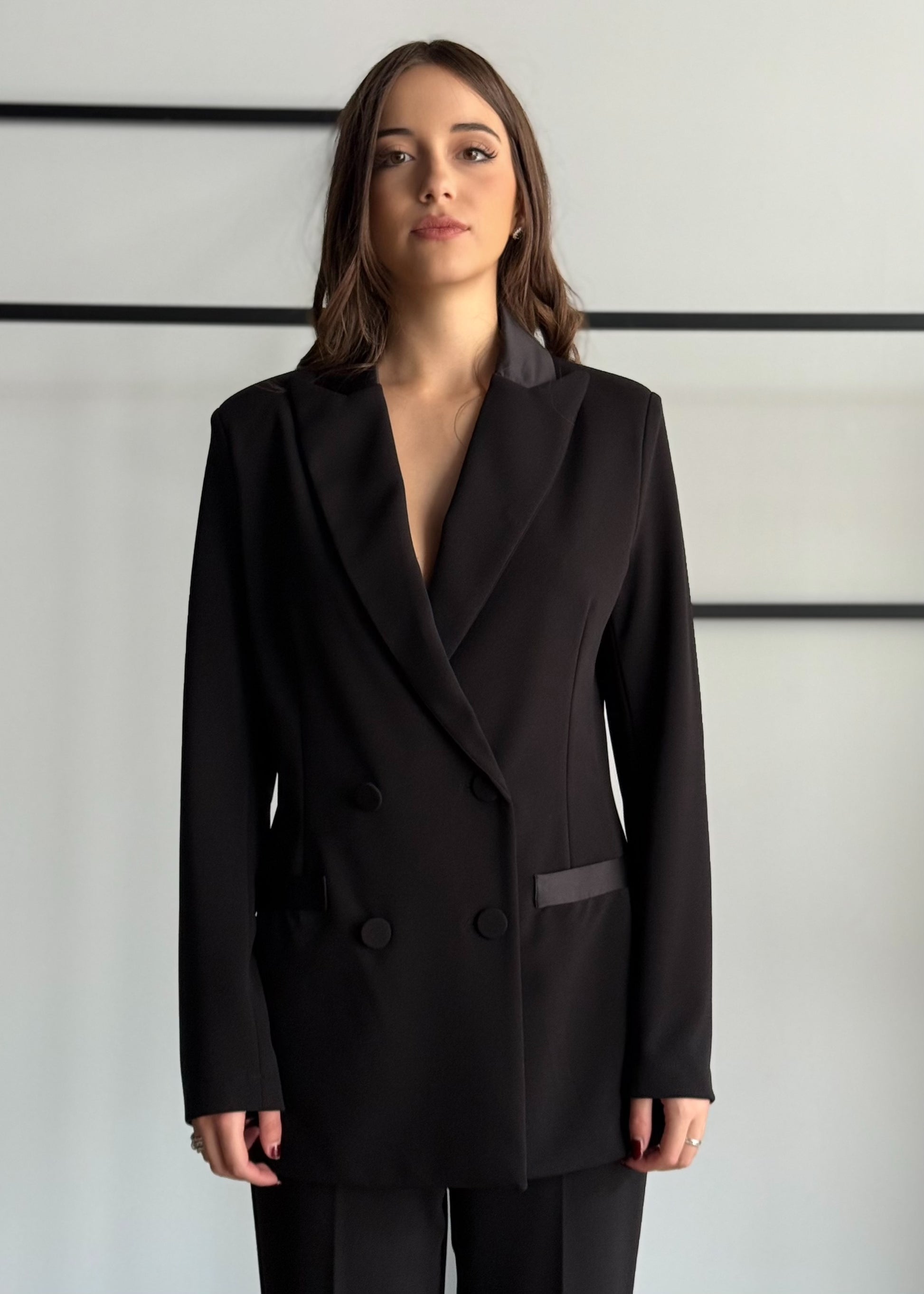 Giacca doppiopetto in tessuto strutturato color nero, con bottoni rivestiti tono su tono e tasche frontali. Il taglio sartoriale e la linea leggermente svasata la rendono un capo versatile, ideale sia per look formali che per outfit più casual chic.