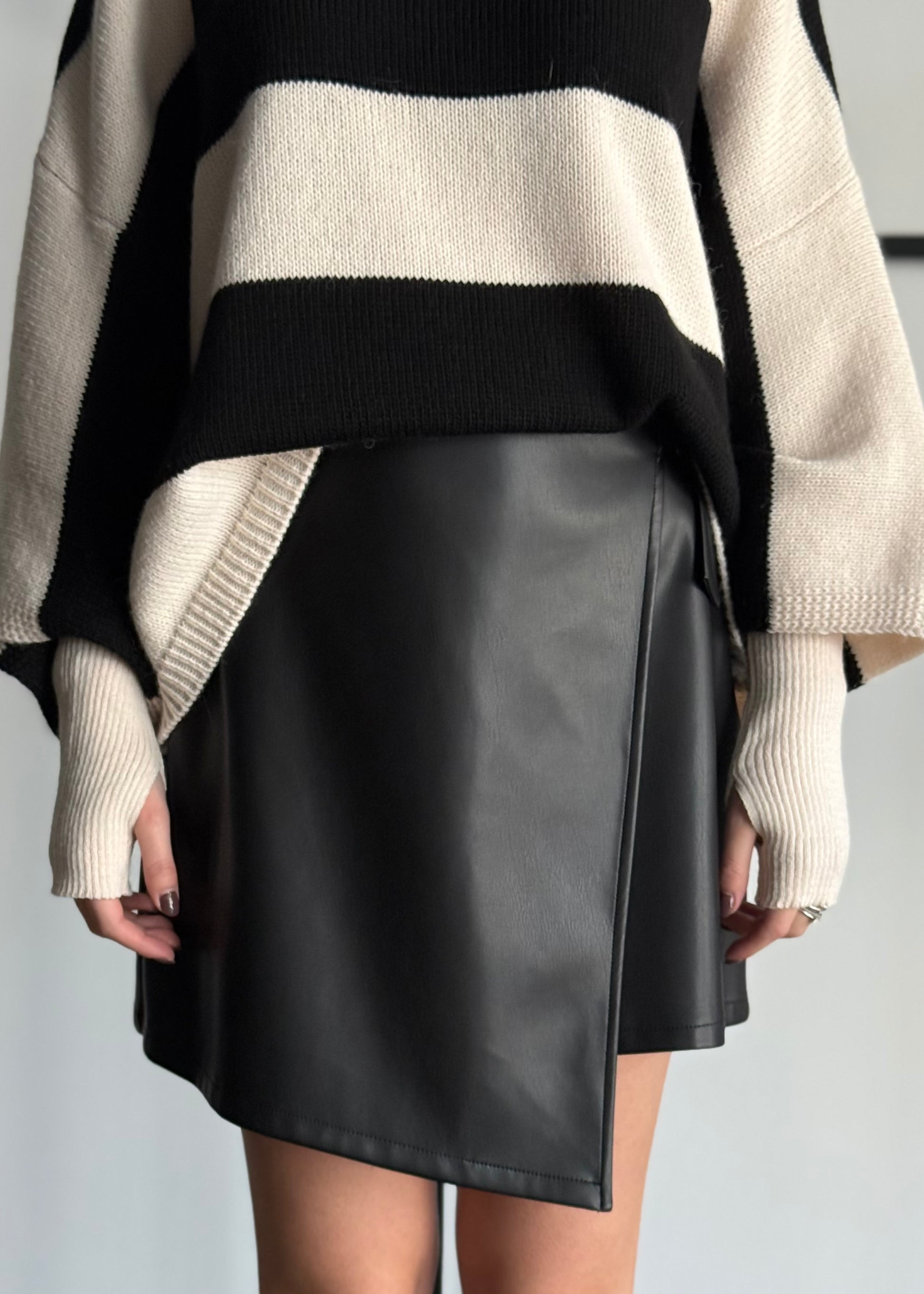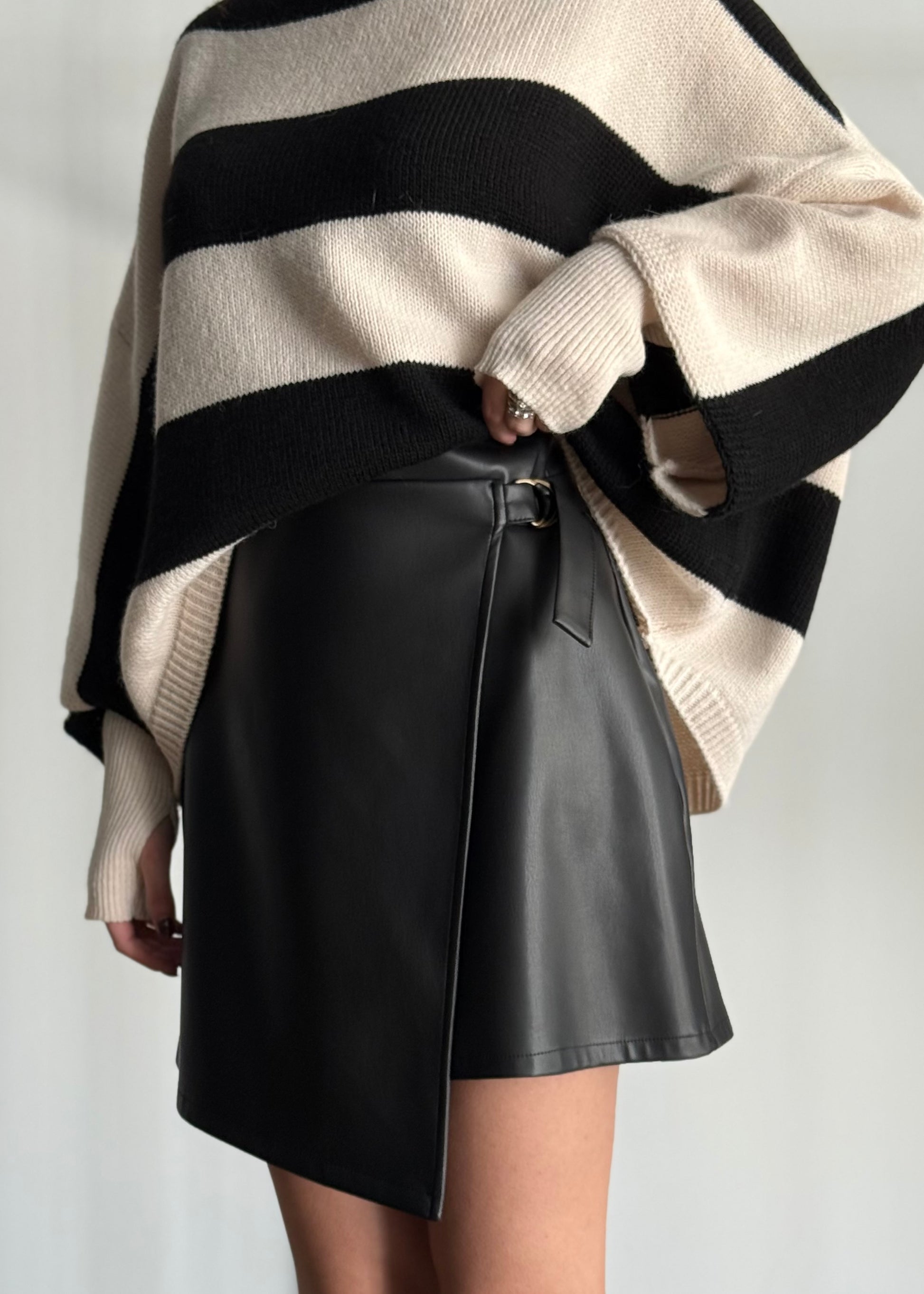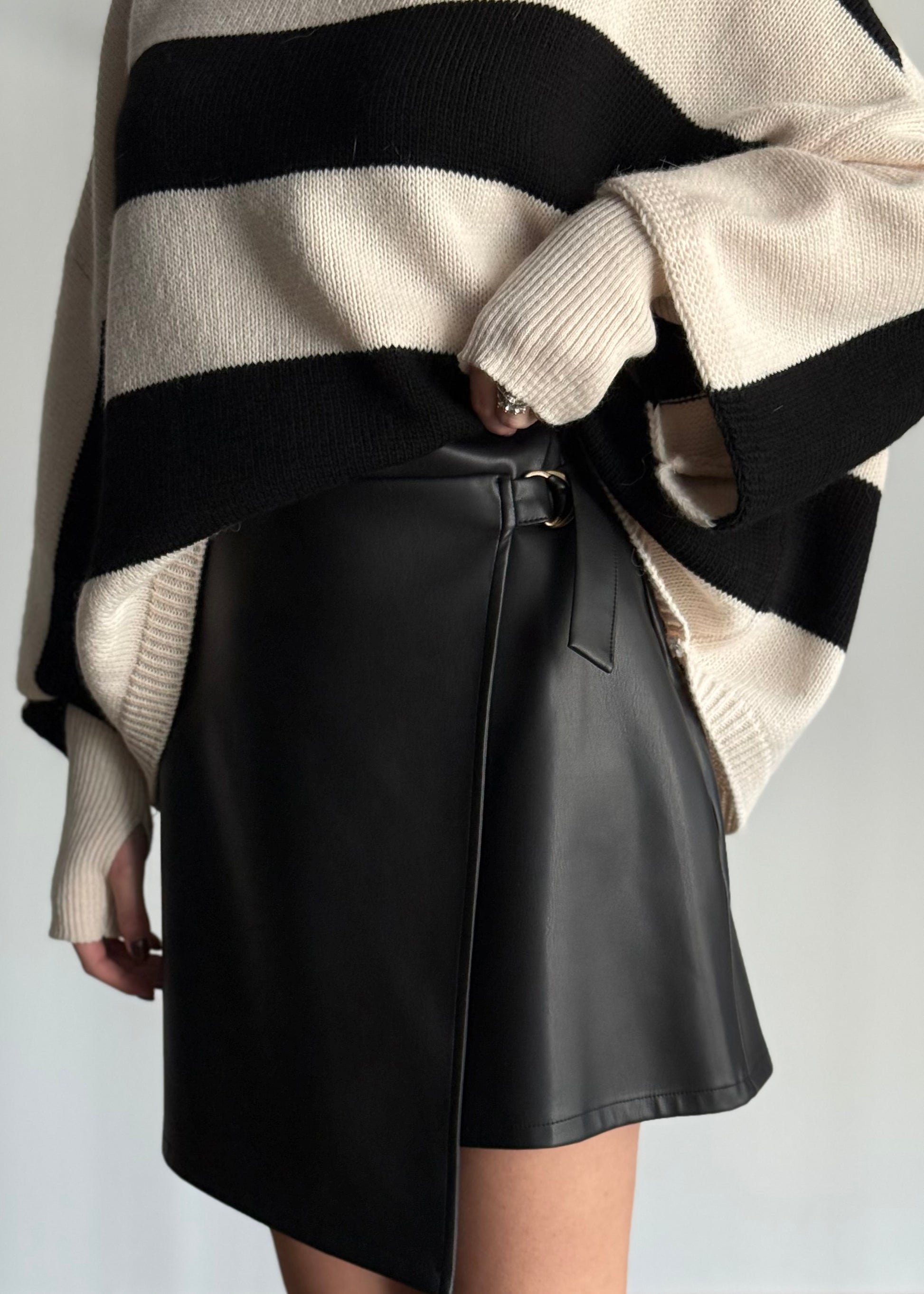 Moderna e grintosa, questa gonna corta in ecopelle nera è il capo ideale per creare look contemporanei e di carattere. Il design asimmetrico effetto wrap, con apertura frontale leggermente obliqua, dona un tocco sofisticato e slancia la figura.
