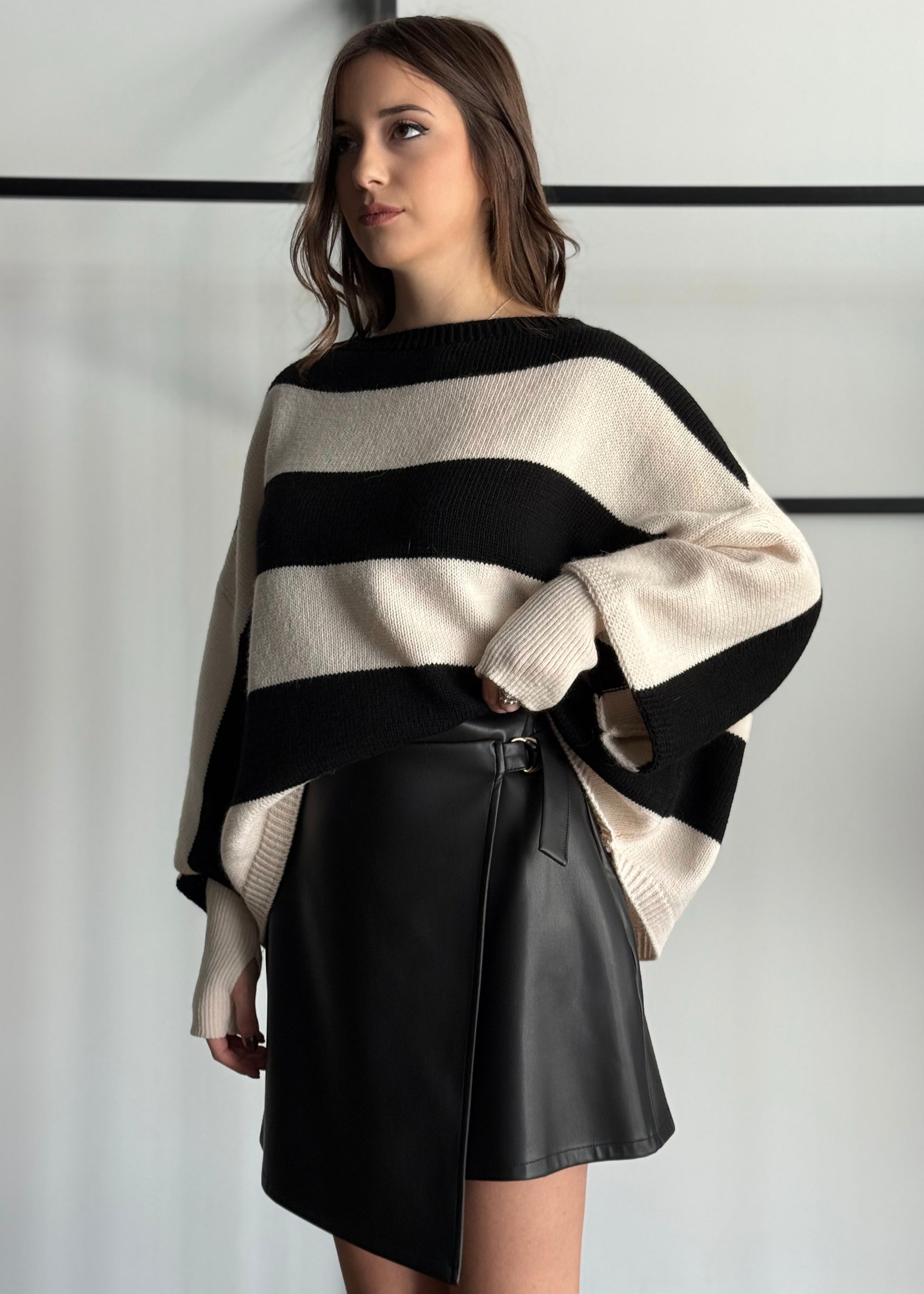 Realizzata in ecopelle morbida e liscia al tatto, mantiene una linea strutturata che valorizza la silhouette senza risultare rigida. Perfetta da abbinare a maglioni oversize, camicie o body per un look chic e versatile.