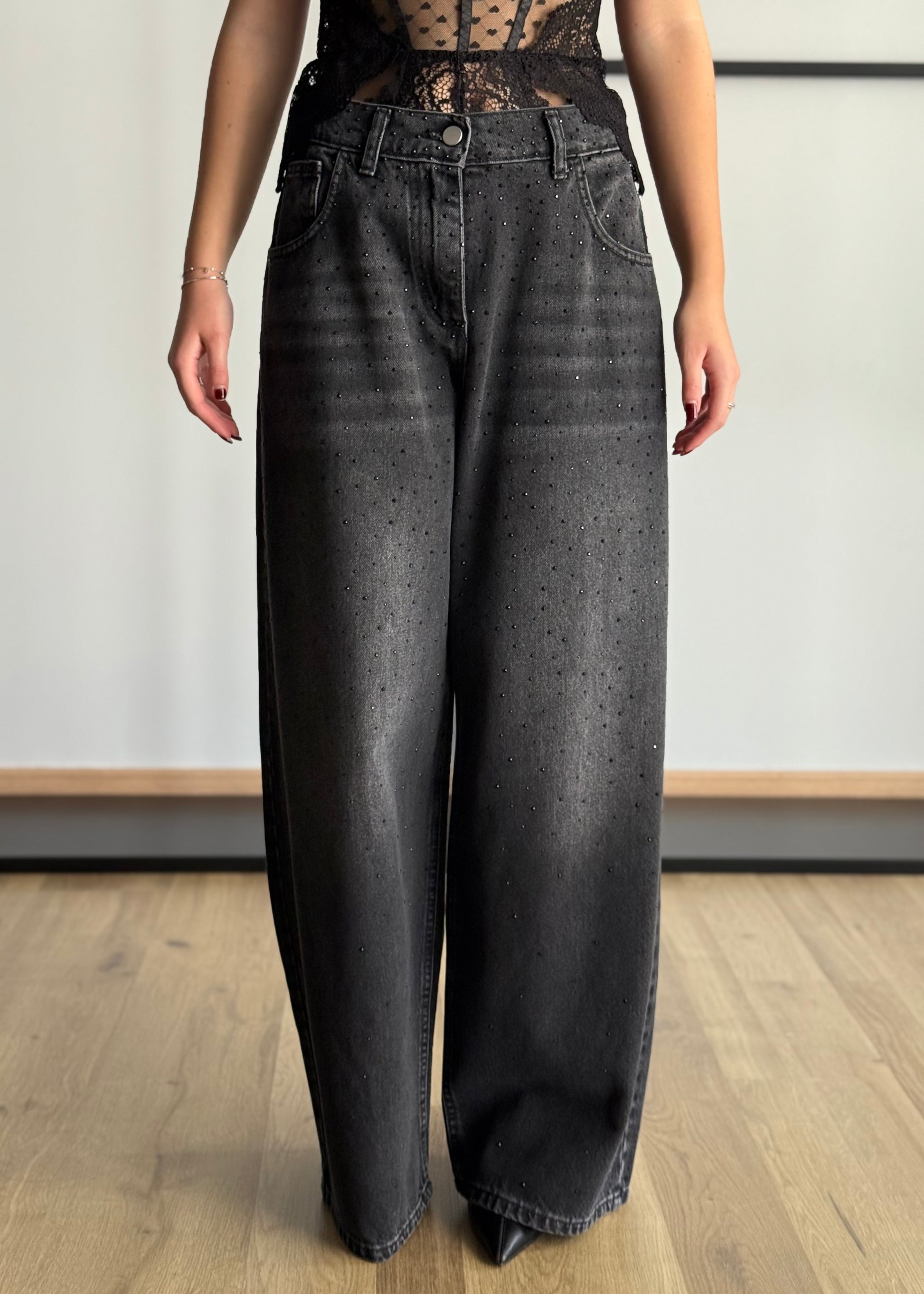 Jeans a gamba larga in denim nero washed, impreziositi da micro strass applicati sul davanti per un tocco luminoso e sofisticato. Il modello presenta vita regolare, chiusura con bottone e zip, tasche frontali e tasche applicate sul retro. Perfetto per creare outfit casual-chic con una nota di originalità.
