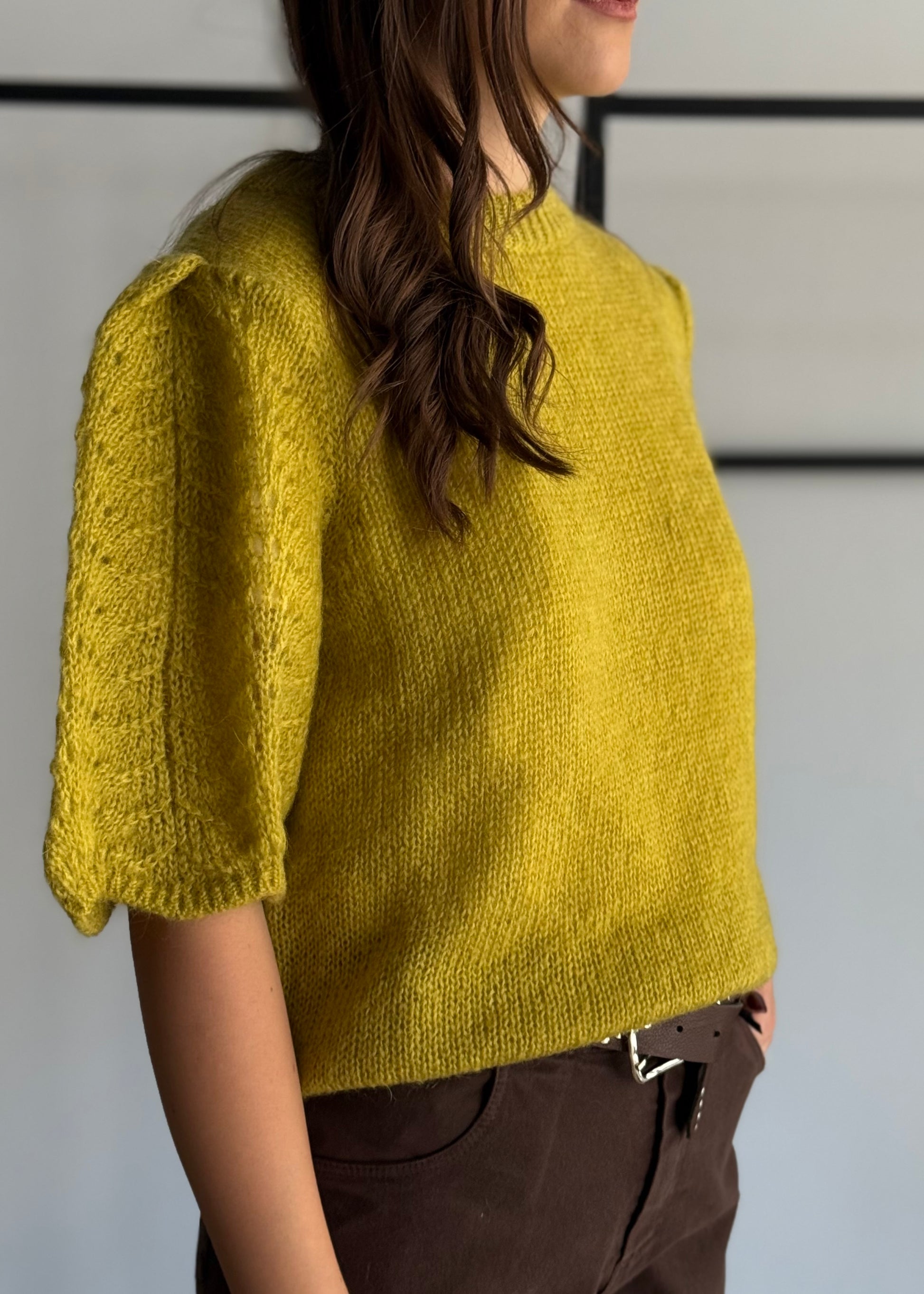 Maglia leggermente corta dal design moderno, caratterizzata da maniche corte a sbuffo con lavorazione a treccia che aggiunge volume e texture. Realizzata in maglia soffice e calda, presenta uno scollo tondo a coste e un fit leggermente morbido. Perfetta per dare un tocco vivace e originale ai look autunnali e invernali.