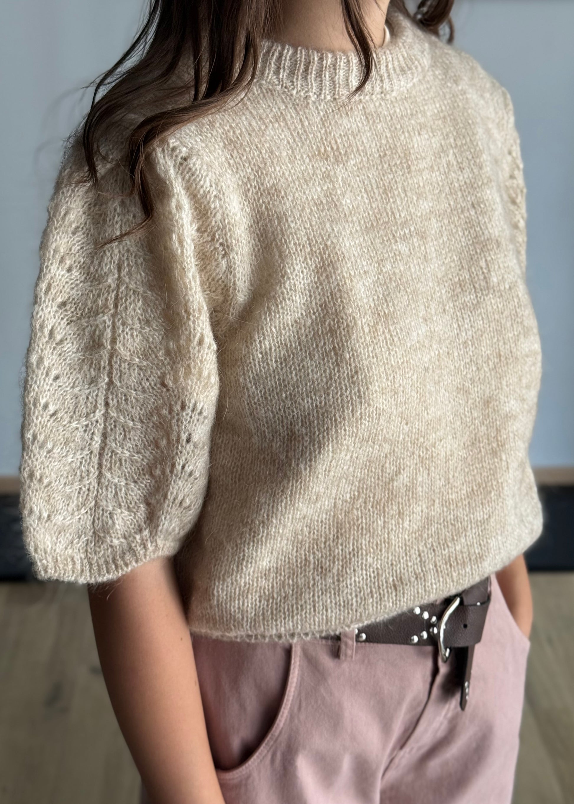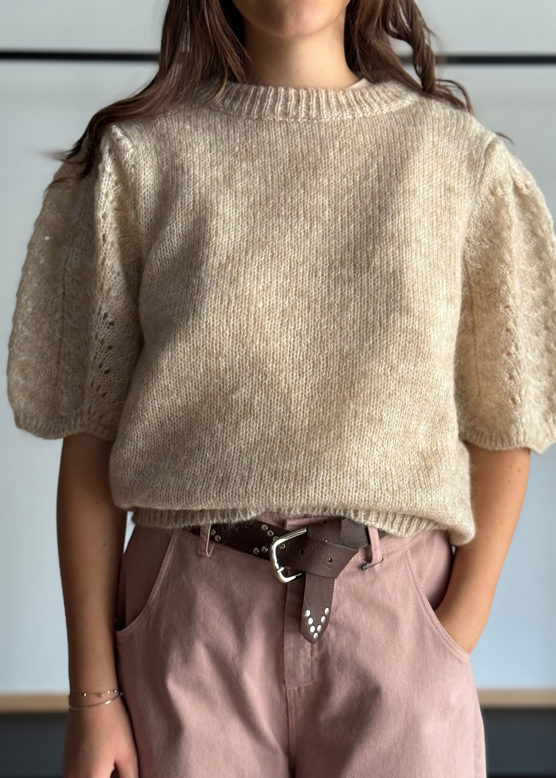 Maglia corta dal design moderno, caratterizzata da maniche corte a sbuffo con lavorazione a treccia che aggiunge volume e texture. Realizzata in maglia soffice e calda, presenta uno scollo tondo a coste e un fit leggermente morbido. Perfetta per dare un tocco vivace e originale ai look autunnali e invernali.