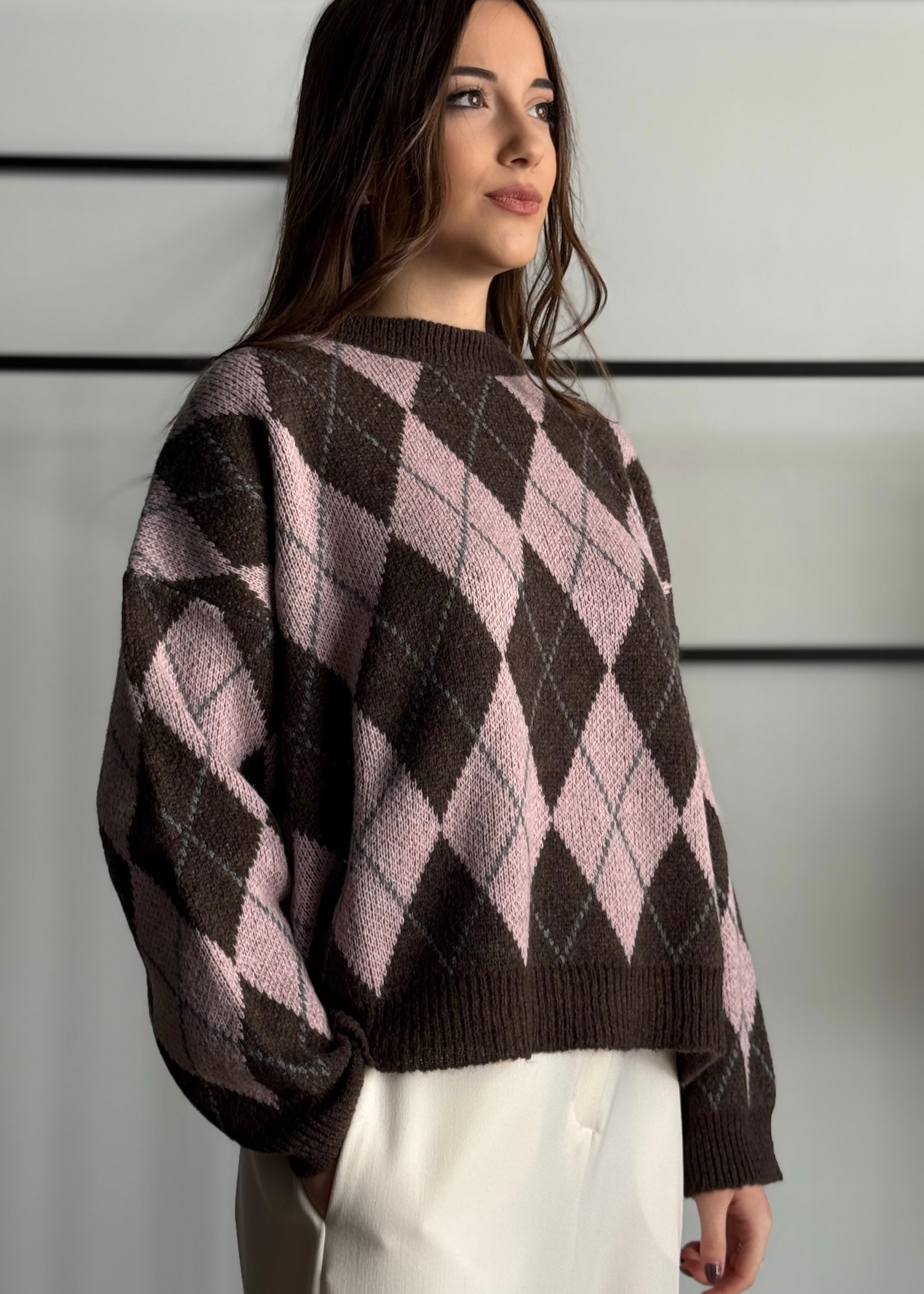 Elegante e moderna, questa maglia over girogola è il capo perfetto per un look casual-chic. Il design a stampa rombi nei toni moro, pink e grigio dona un tocco grafico e raffinato, mentre la vestibilità oversize garantisce comfort e libertà di movimento.