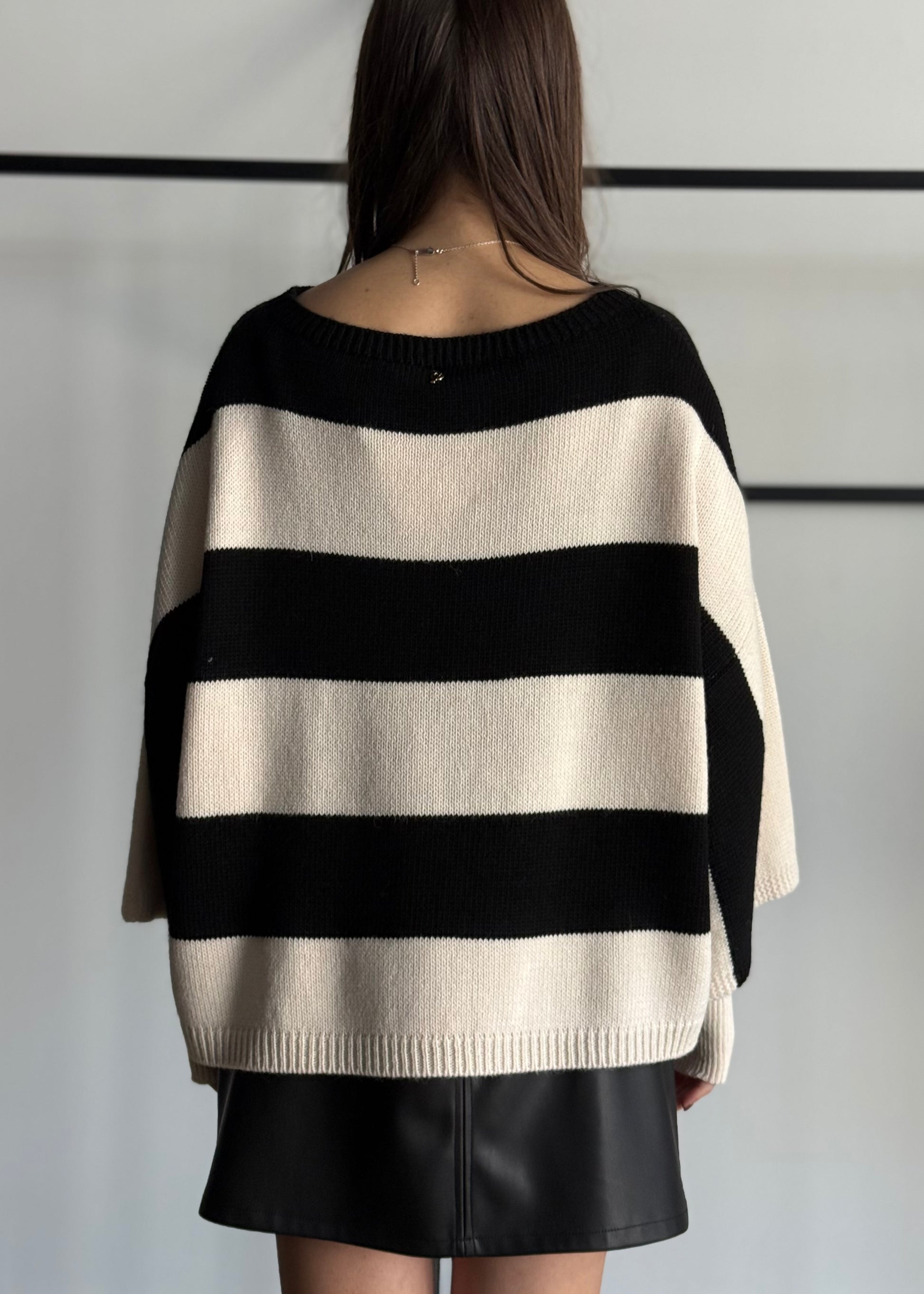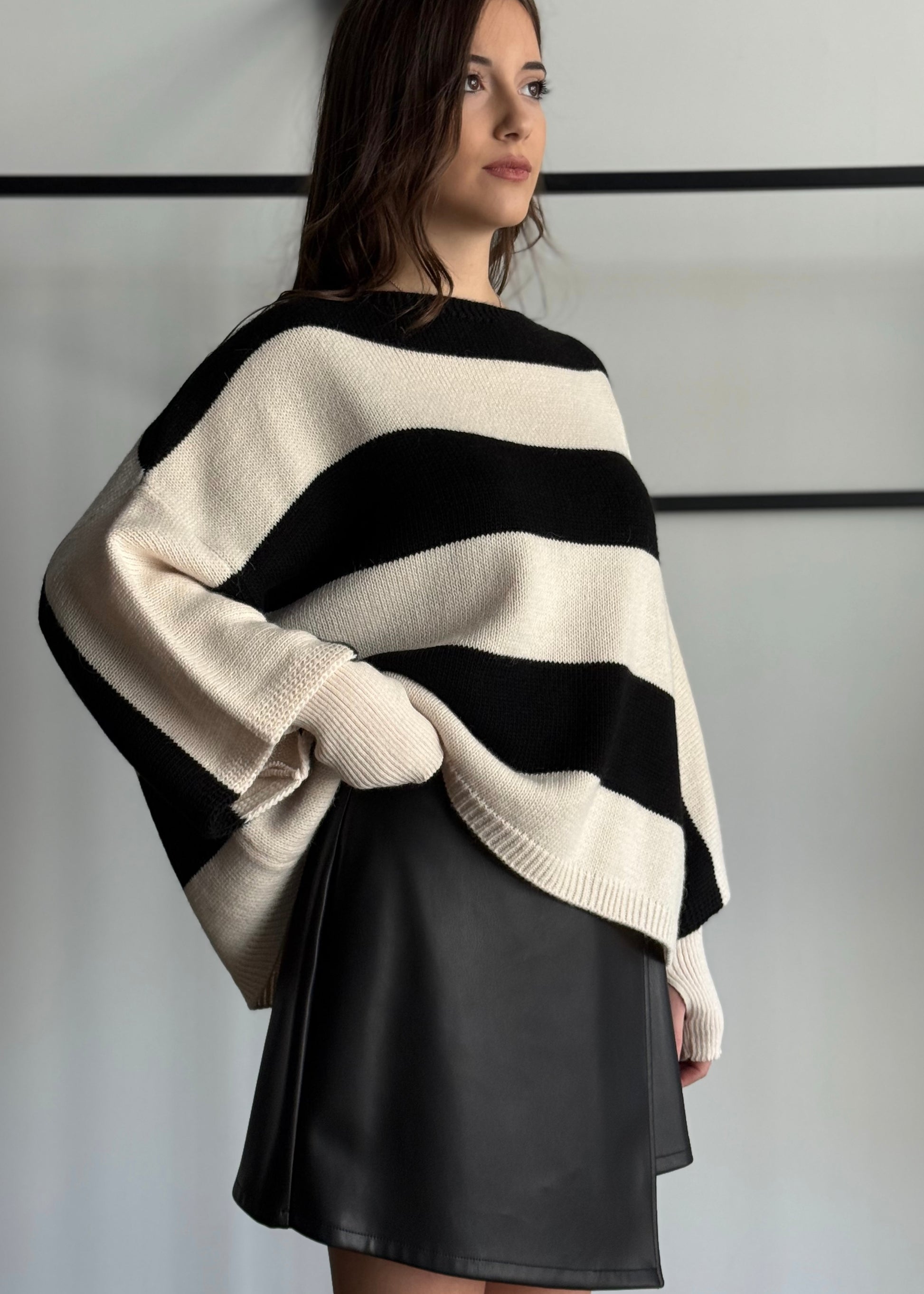 Un capo trendy e super versatile: questa maglia oversize a righe larghe in bianco panna e nero è perfetta per creare look moderni e di carattere. La linea ampia e morbida dona un effetto relaxed molto chic, mentre i manicotti coordinati inclusi completano l’outfit rendendolo unico e ricercato.