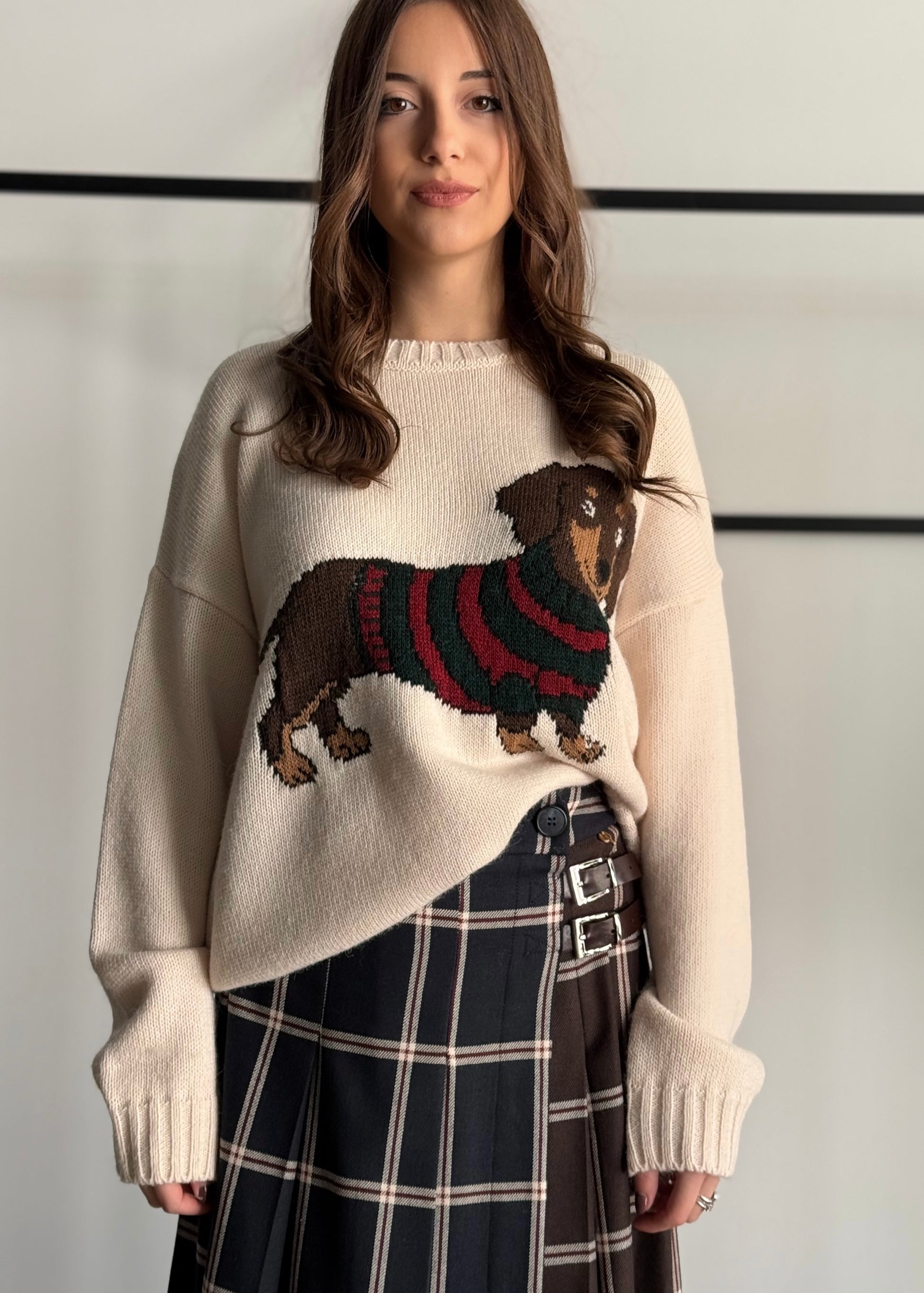 Aggiungi un tocco di simpatia e stile ai tuoi outfit con questo maglione oversize color panna, caratterizzato da un’adorabile lavorazione jacquard che raffigura un bassotto con maglioncino a righe. Morbido, caldo e super confortevole, è il capo perfetto per look casual e rilassati.