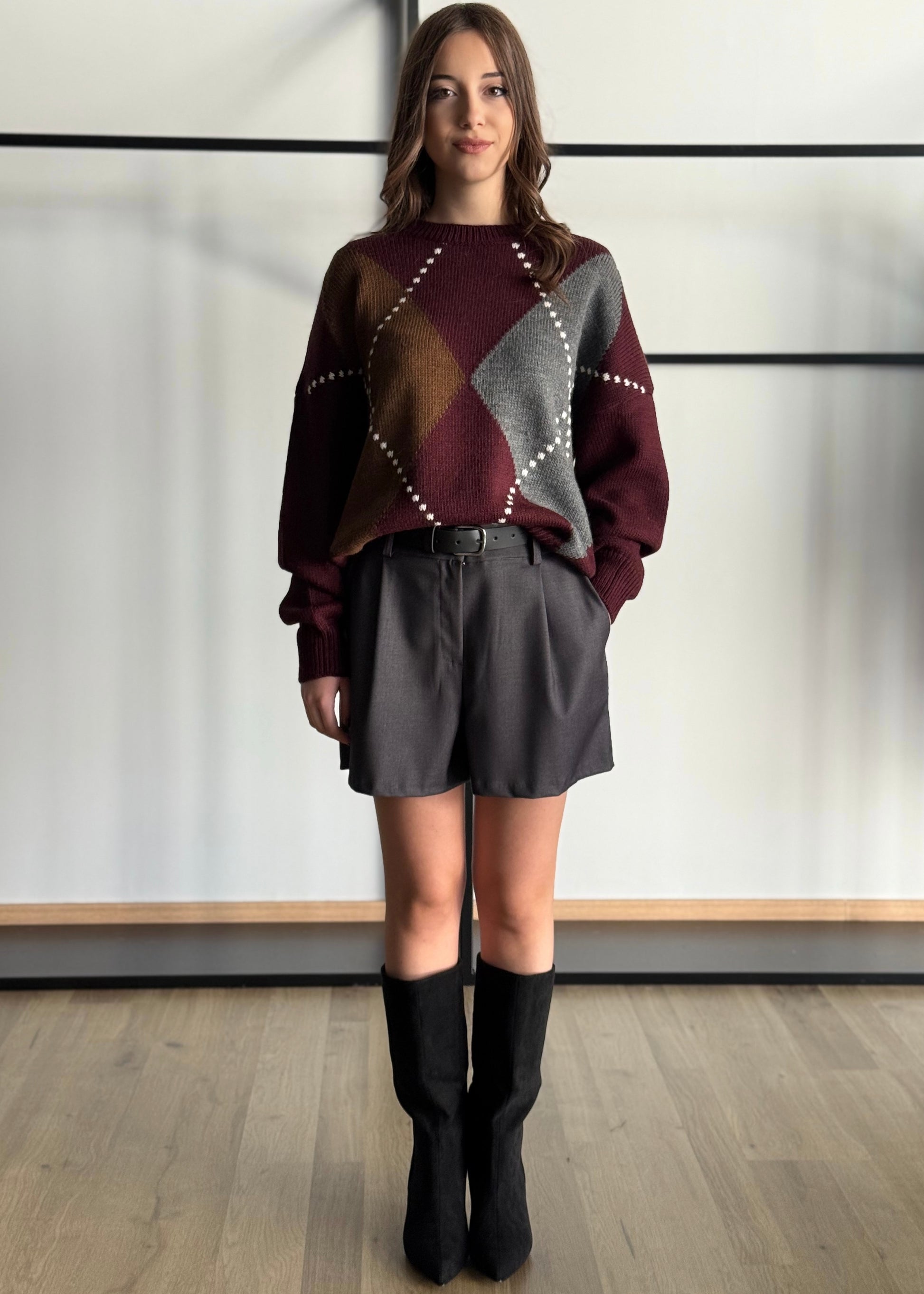 Un maglione dallo stile moderno che richiama il classico motivo argyle, rivisitato in chiave contemporanea.
