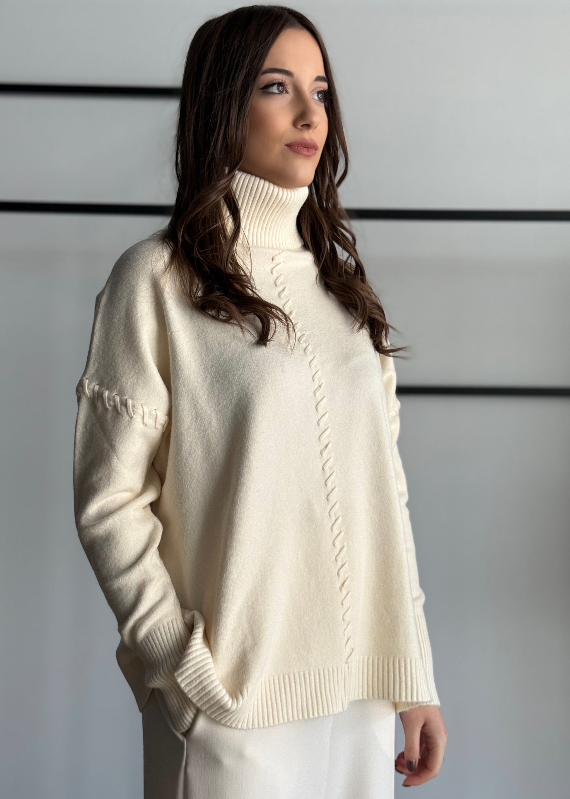 Aggiungi un tocco di eleganza rilassata al tuo guardaroba con questo maglione dolcevita in morbida maglia color latte. Il design presenta una linea leggermente over, spalle scese e dettagli lavorati sul fronte e lungo le maniche, che donano carattere senza rinunciare alla semplicità.