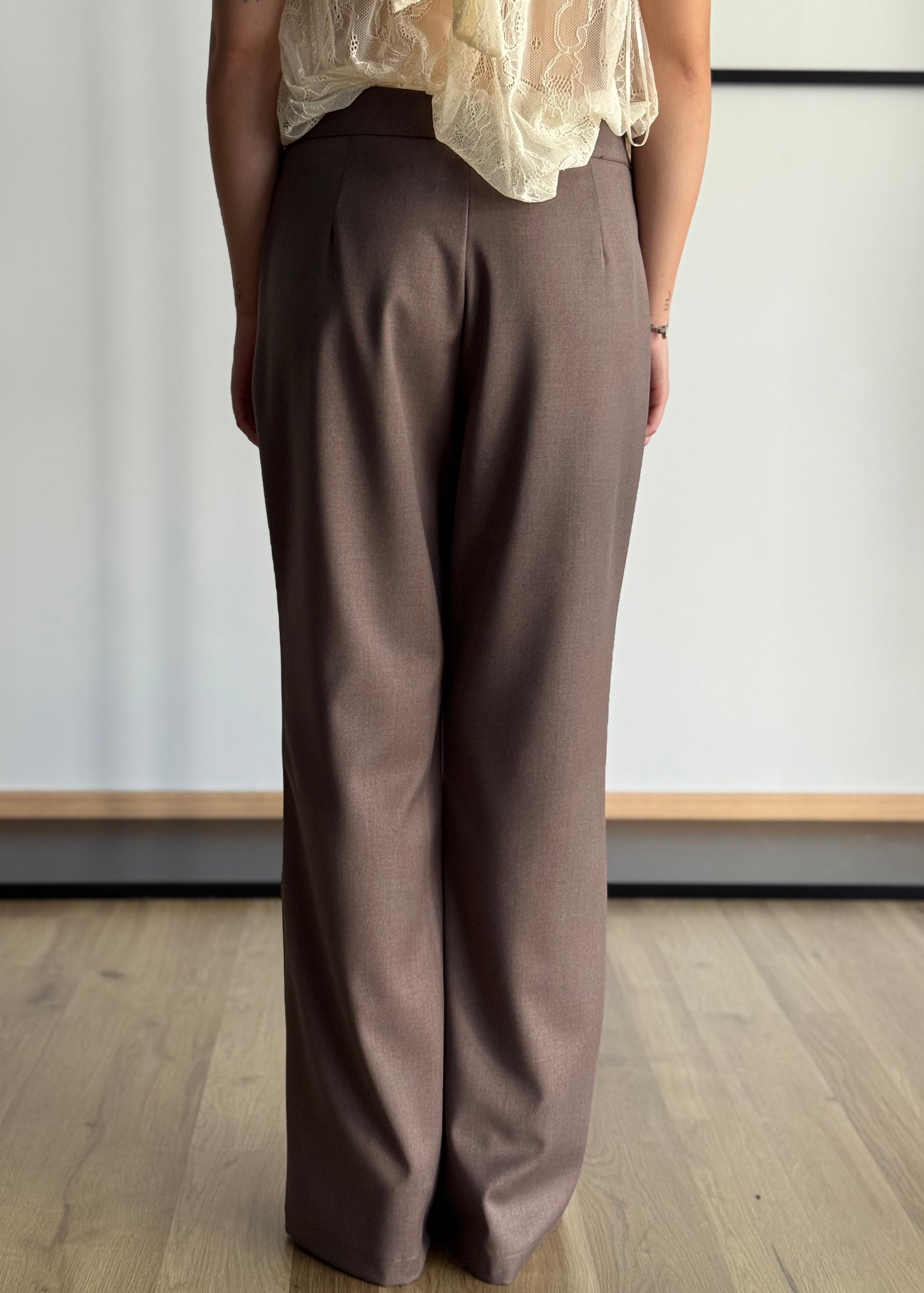 Questo pantalone in tessuto liscio color taupe unisce eleganza e versatilità. La linea pulita con gamba dritta leggermente svasata valorizza la silhouette senza rinunciare al comfort, mentre la fascia piatta in vita senza tasche né dettagli visibili dona un aspetto essenziale e raffinato. Perfetto da abbinare a camicie o blazer per un look formale e professionale, si presta anche a combinazioni più casual con maglie morbide o top leggeri, rendendolo un capo immancabile nel guardaroba quotidiano.