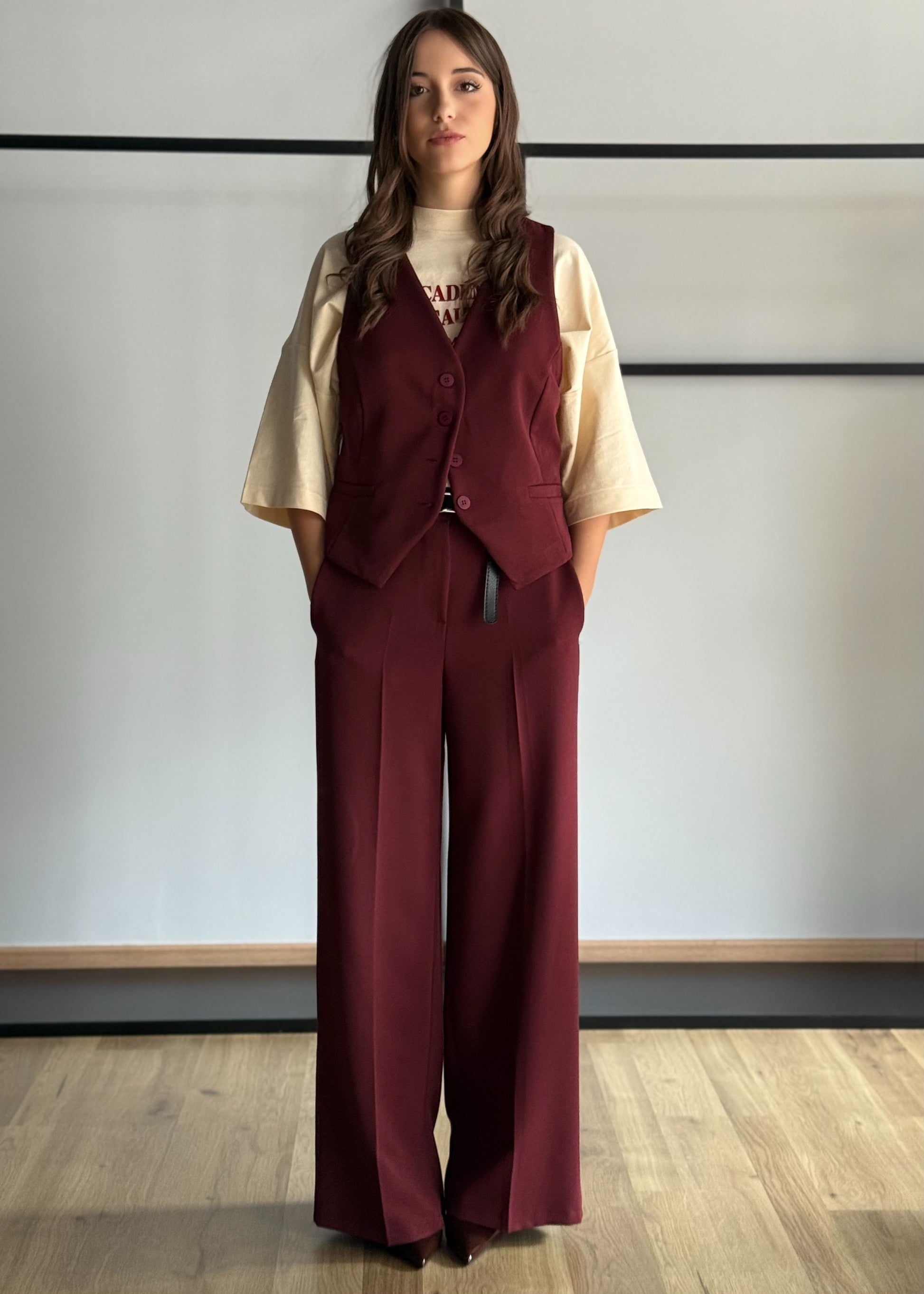 Pantaloni a gamba larga in tessuto fluido color vino scuro con vita elasticizzata sul retro per il massimo comfort. Tasche laterali funzionali e cintura sottile in ecopelle nera con fibbia metallica. Un capo elegante e versatile, perfetto sia per look da ufficio che per outfit serali chic.