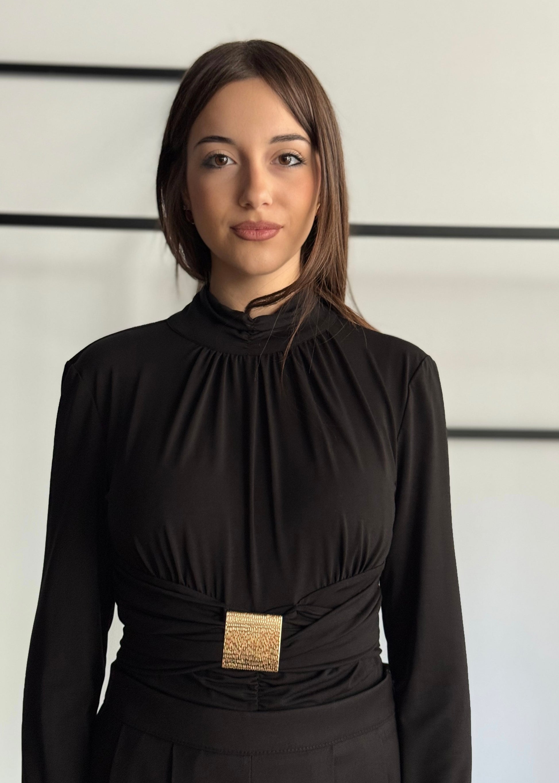 Realizzato in un tessuto morbido e fluido, presenta un raffinato drappeggio frontale che valorizza il busto e un dettaglio centrale dorato che dona luminosità al punto vita.