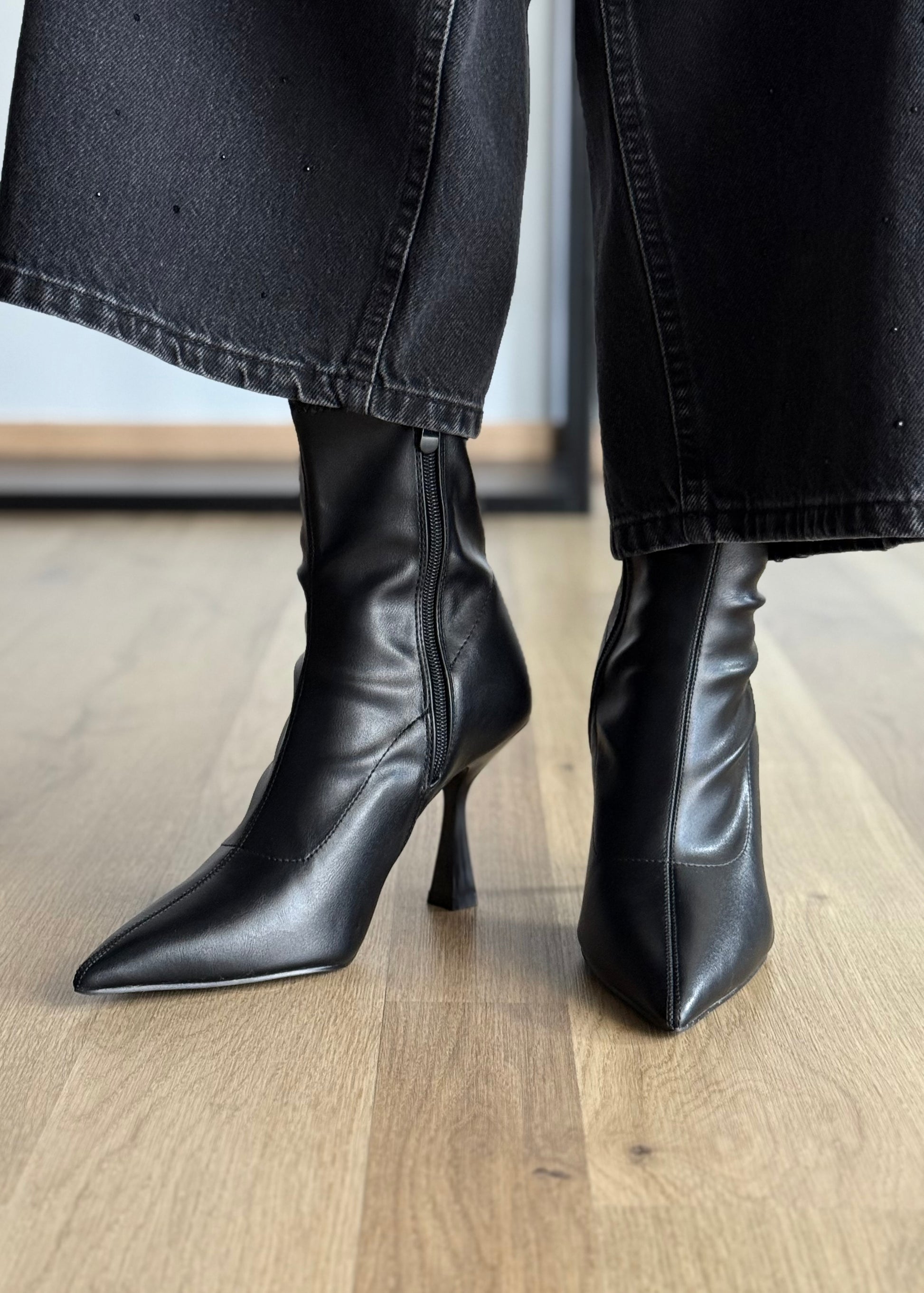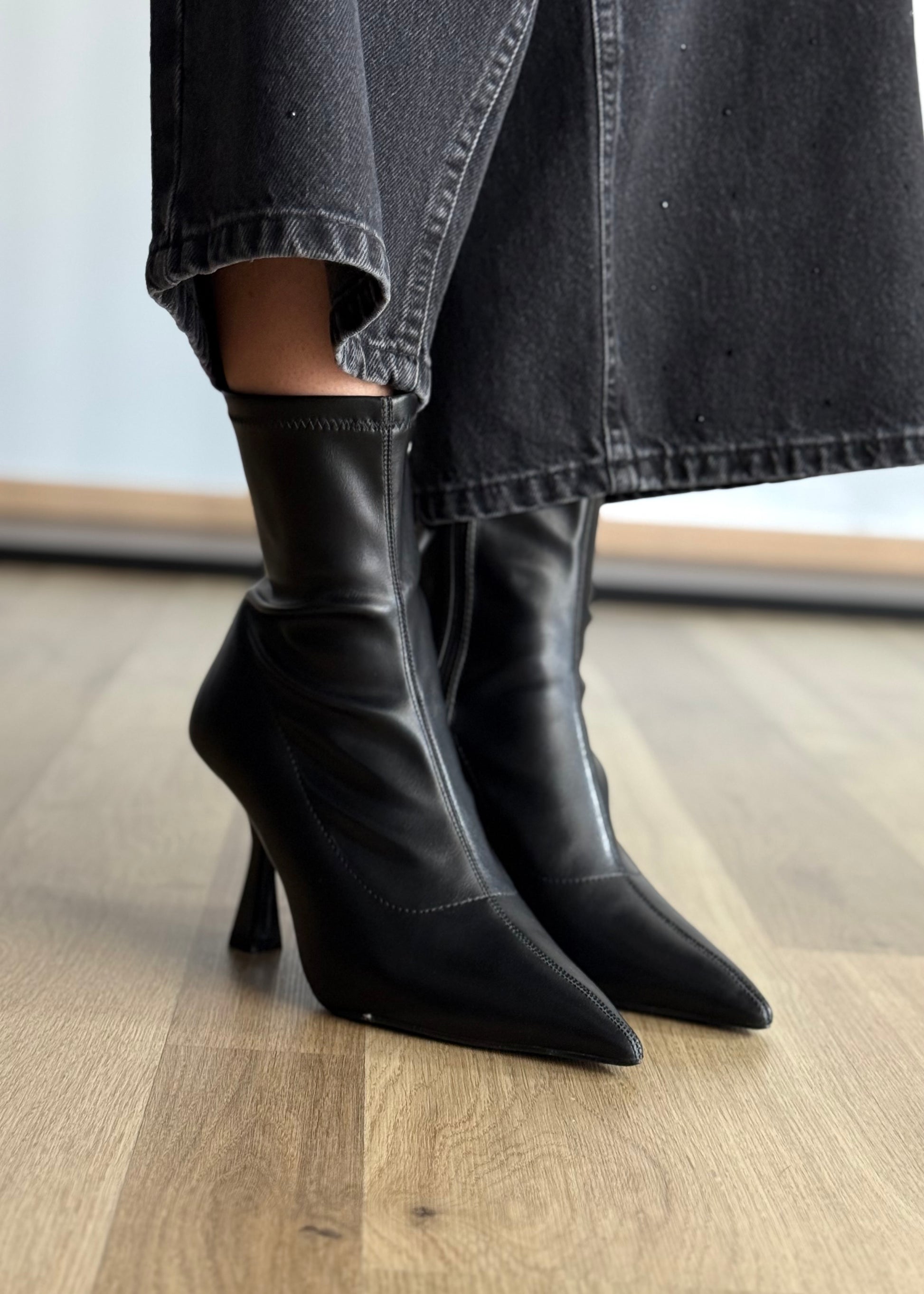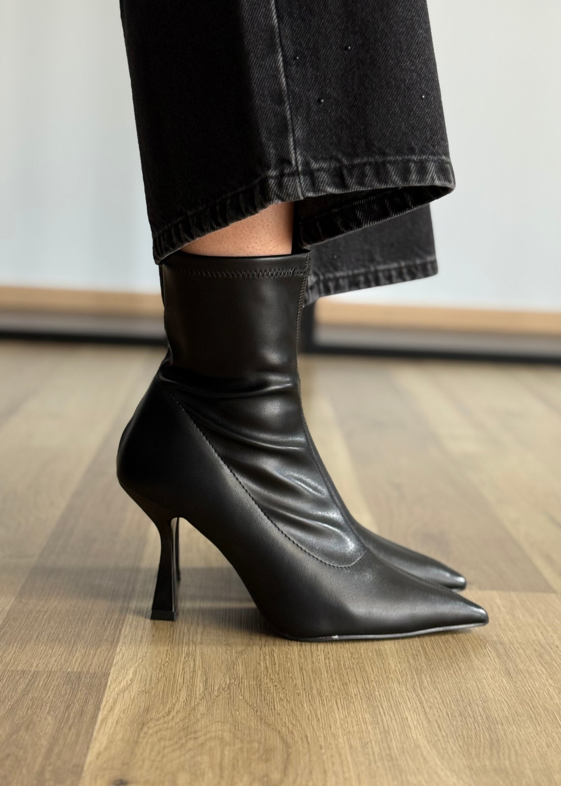 Stivaletti a calza in ecoppelle nera dal design affusolato con punta a lancia e tacco a rocchetto. Eleganti e femminili, si adattano perfettamente alla caviglia per un look moderno e sofisticato, ideale sia di giorno che di sera.