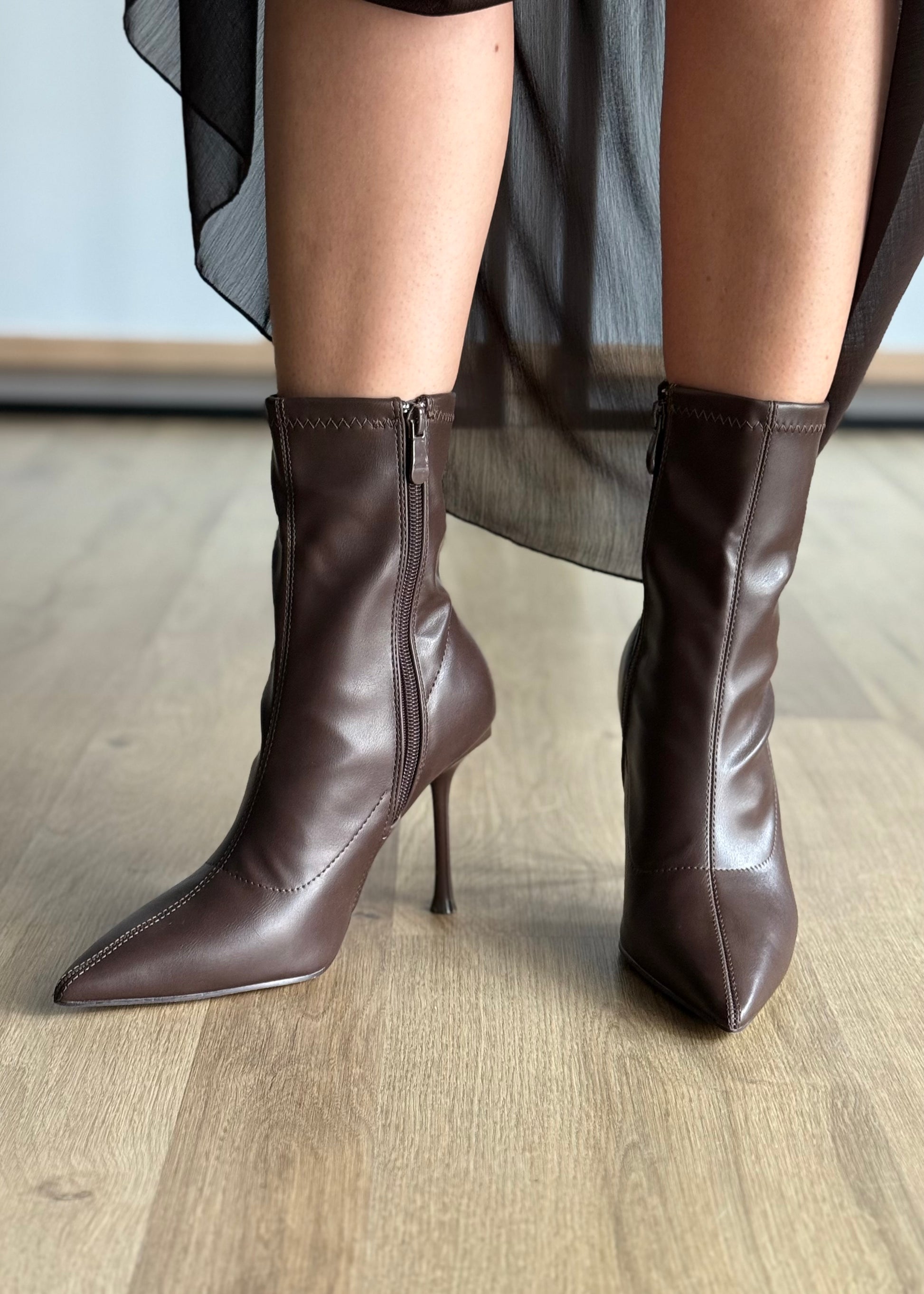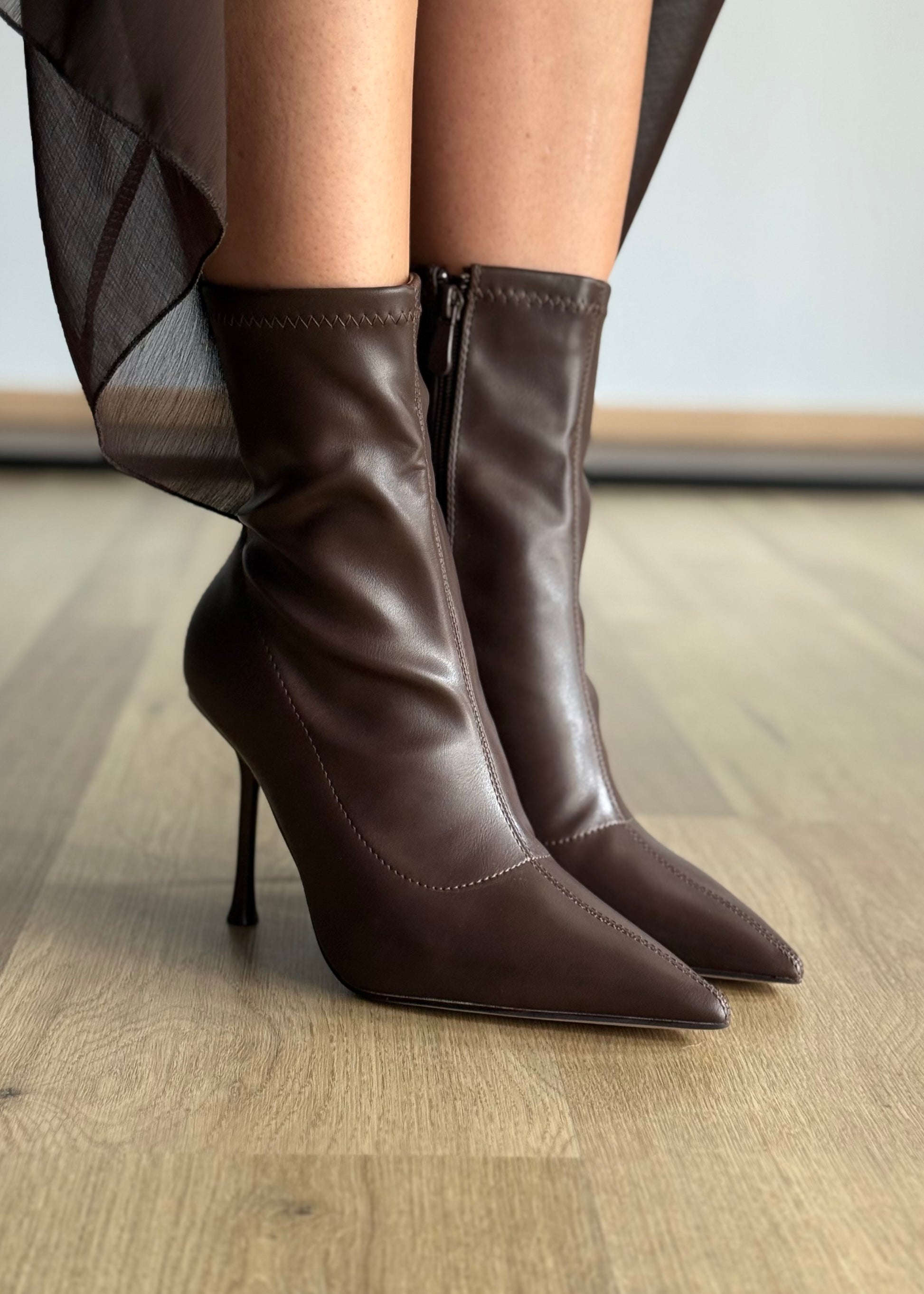 Stivaletti a calza in ecopelle moro dal design affusolato con punta a lancia e tacco a spillo. Eleganti e femminili, si adattano perfettamente alla caviglia per un look moderno e sofisticato, ideale sia di giorno che di sera.