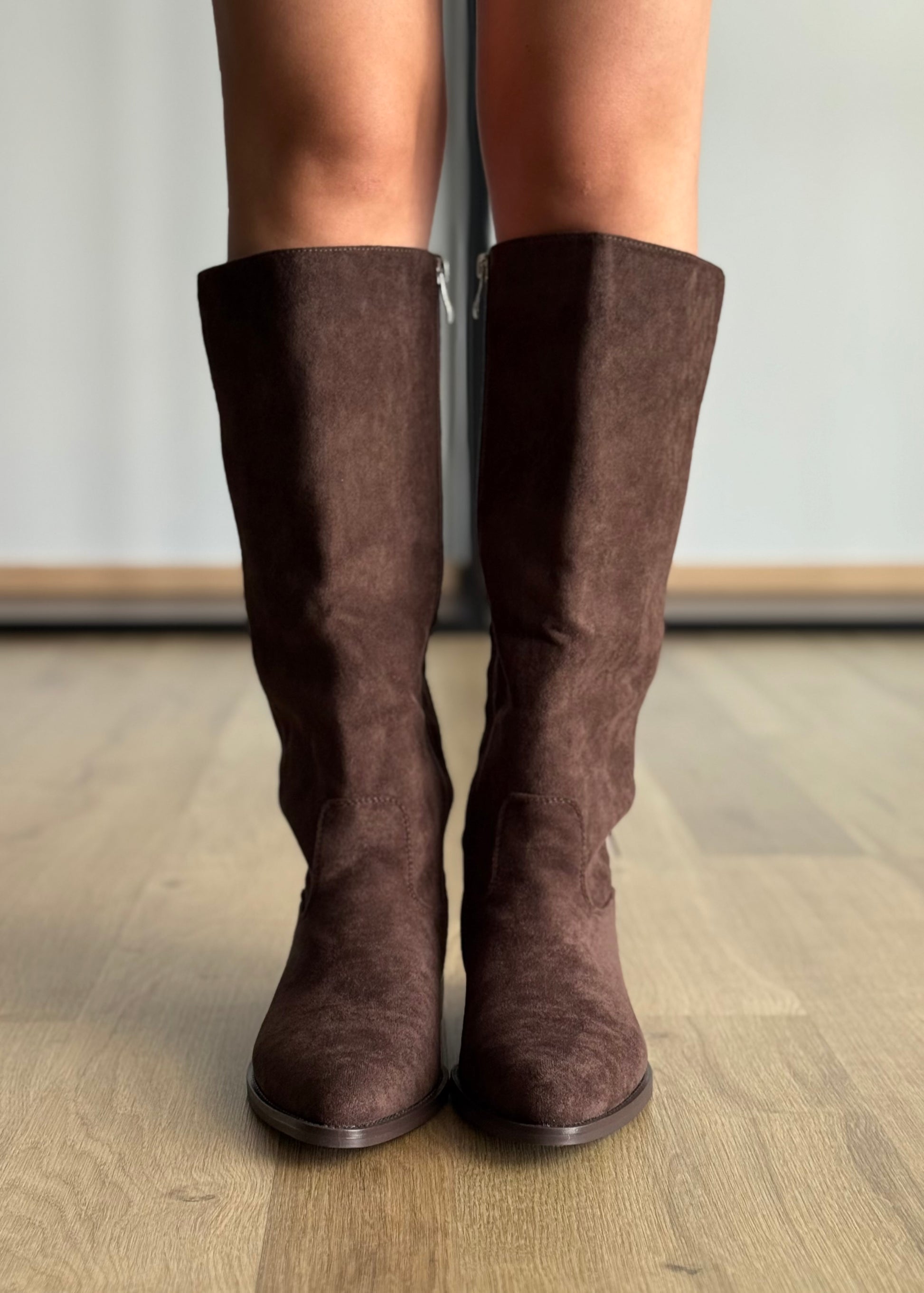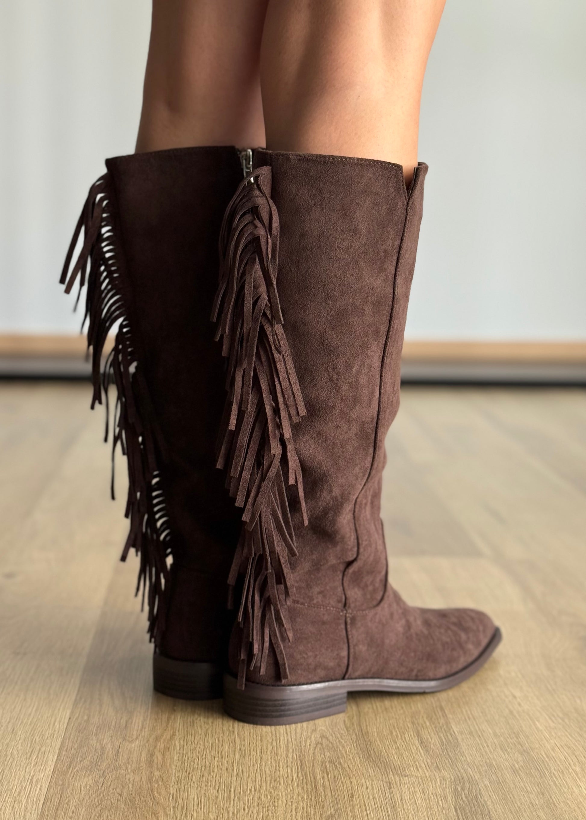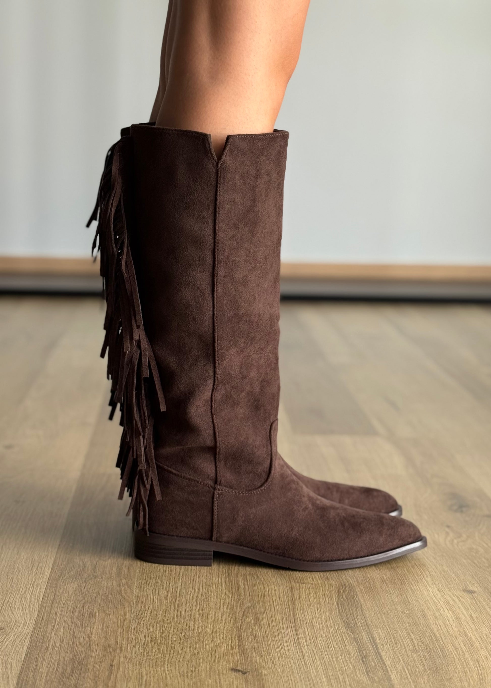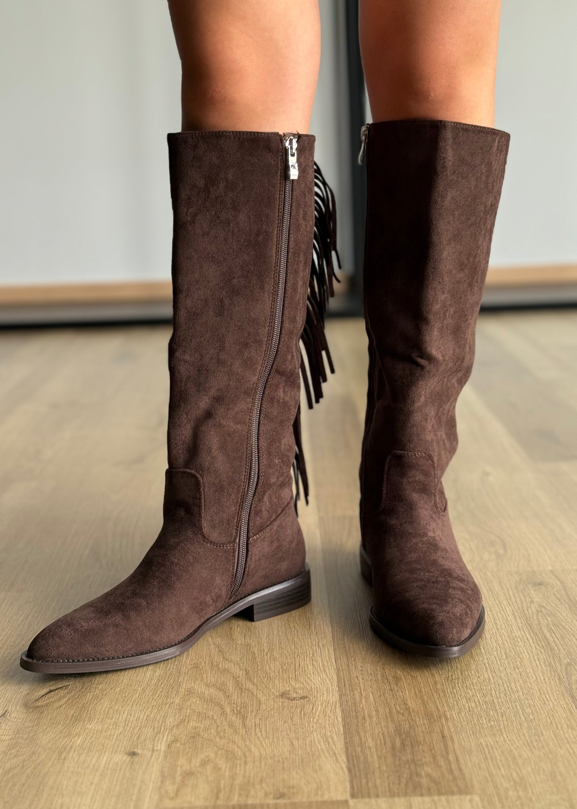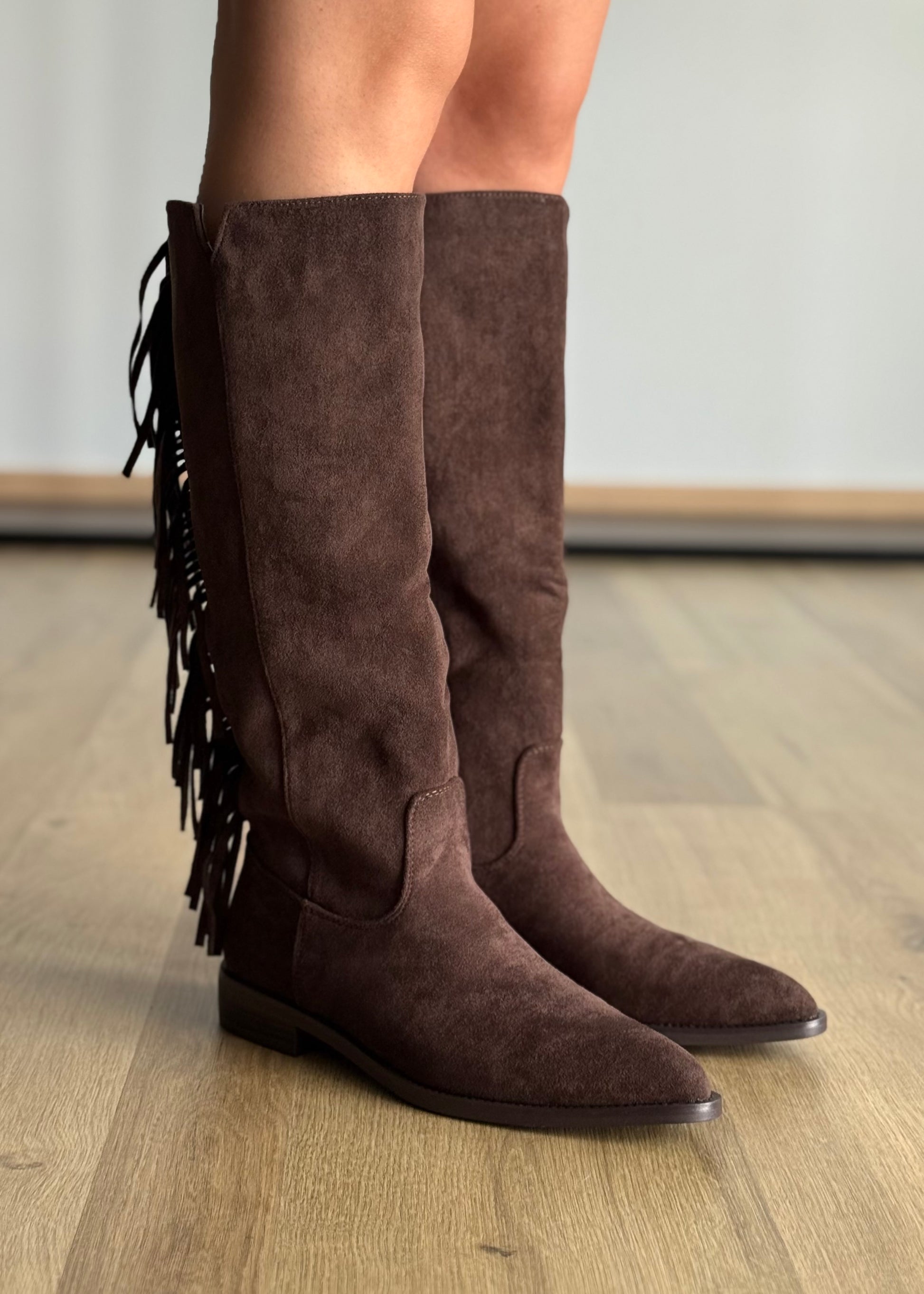 Stivali alti in morbido tessuto effetto camoscio, con punta affusolata e piccolo tacco basso. Dettaglio di frange che donano un tocco western e chiusura con pratica zip interna. Un modello grintoso e versatile, perfetto da abbinare sia a jeans che a vestiti fluidi.