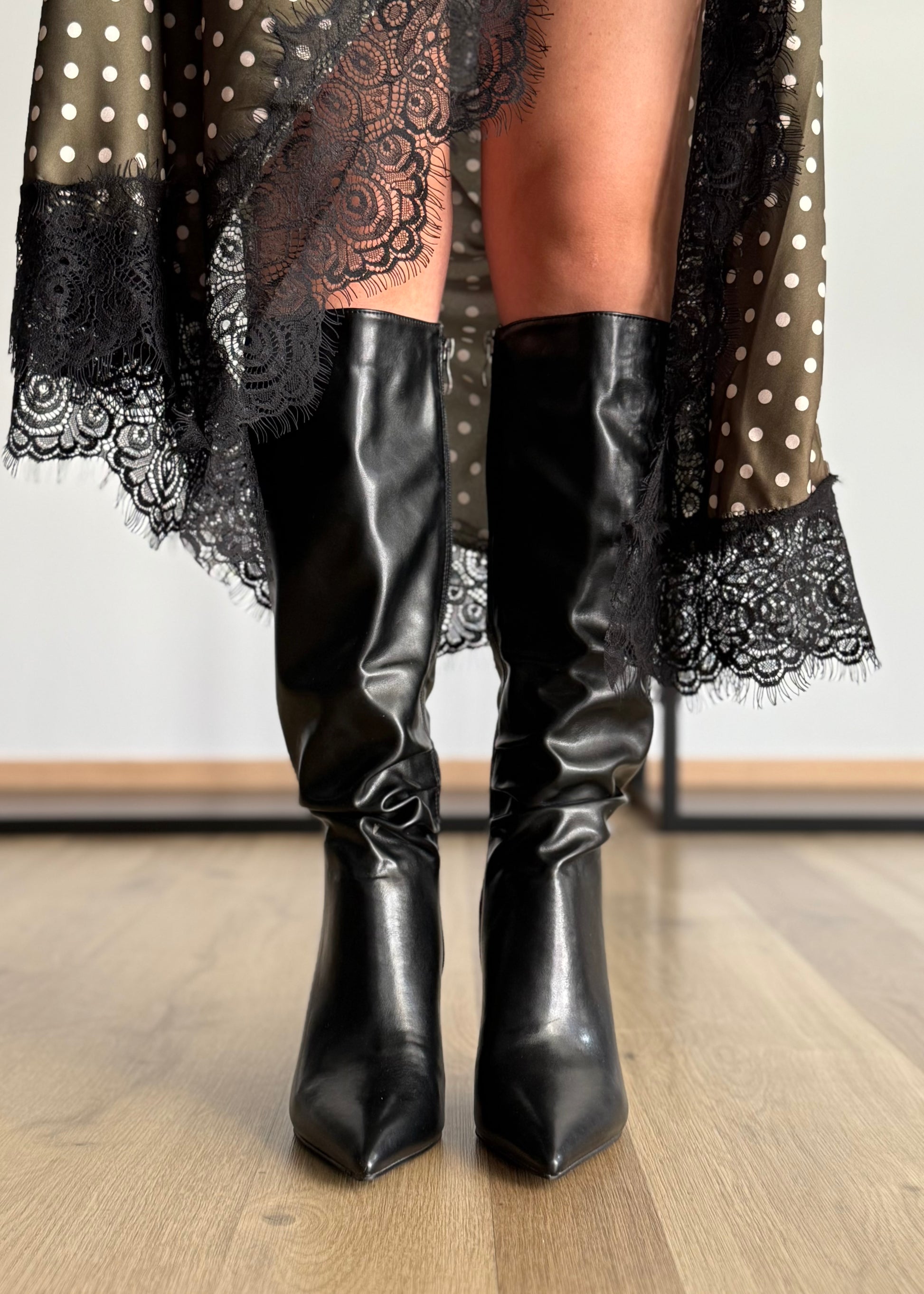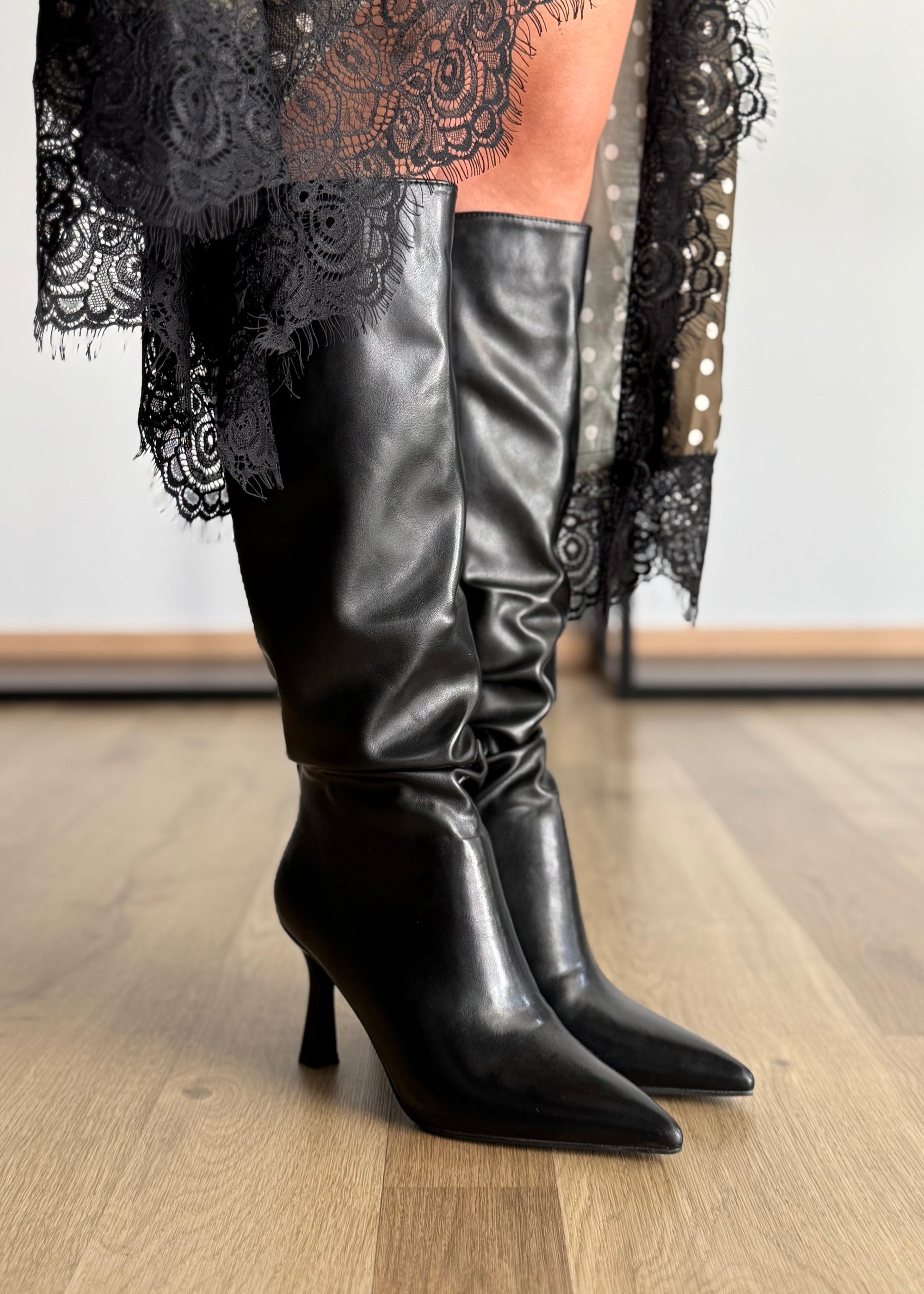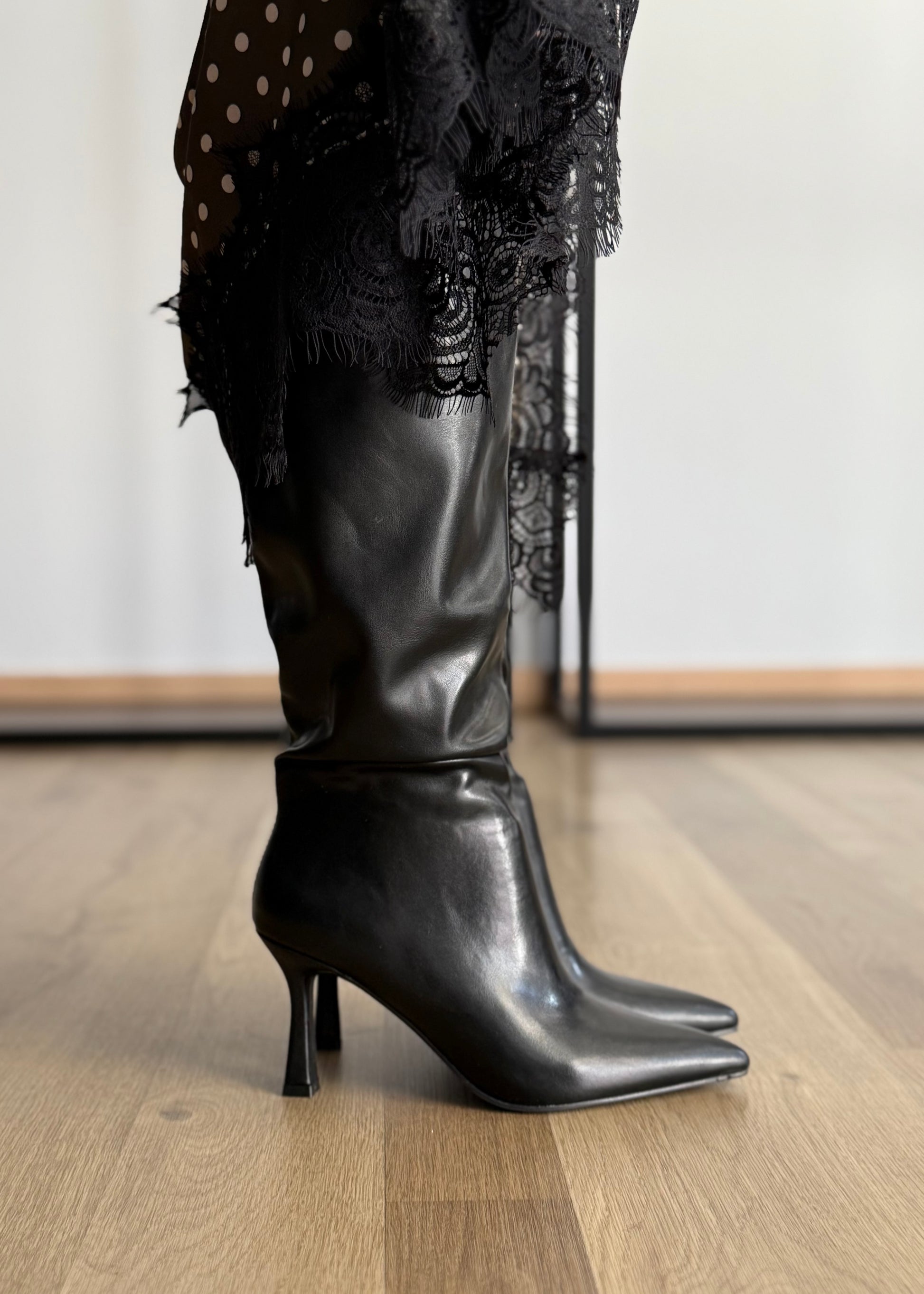 Stivali alti in ecopelle nera con punta affusolata e tacco a rocchetto. La linea elegante e la vestibilità morbida sulla gamba li rendono perfetti per un look sofisticato e femminile, ideale sia con abiti che con pantaloni.