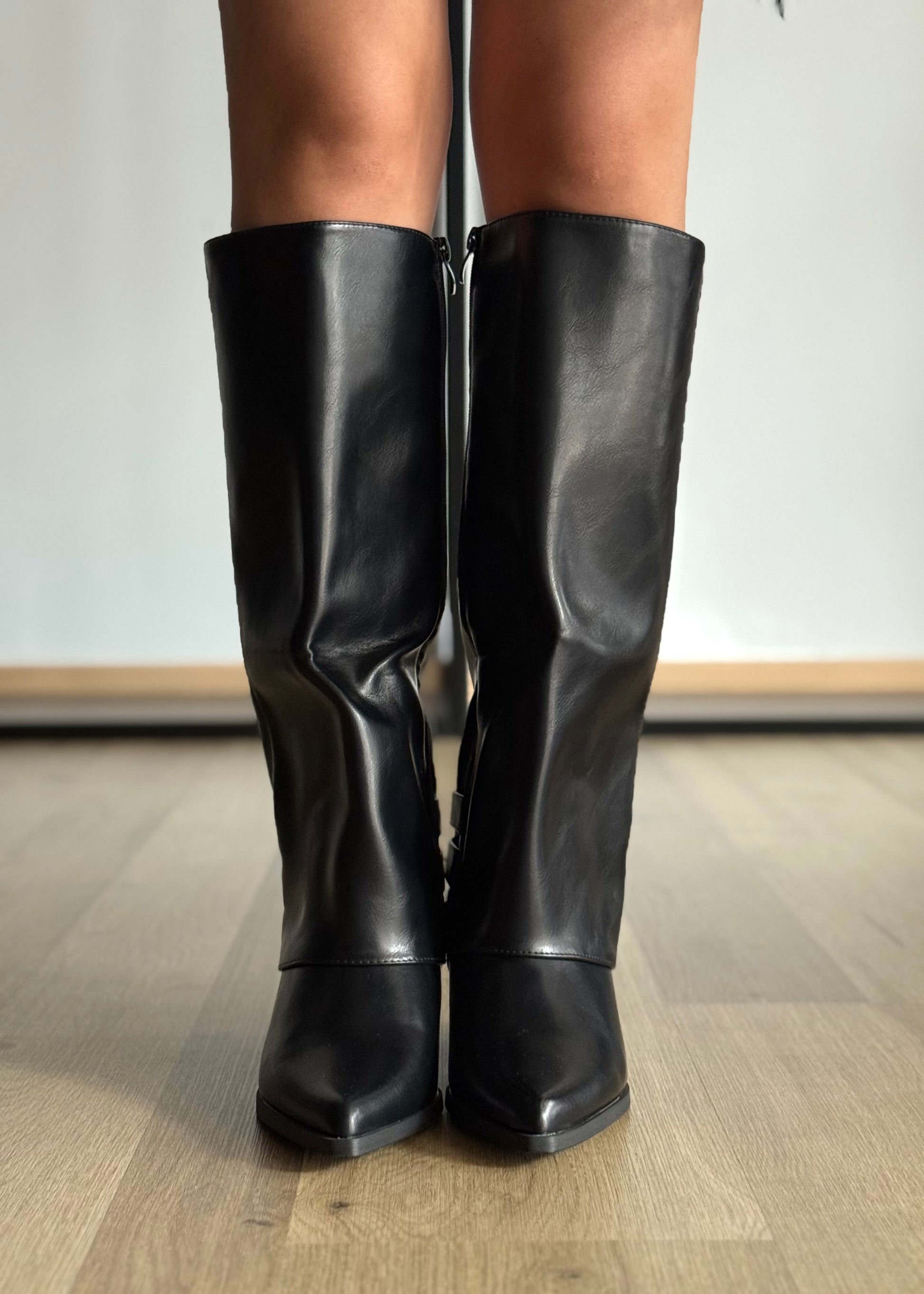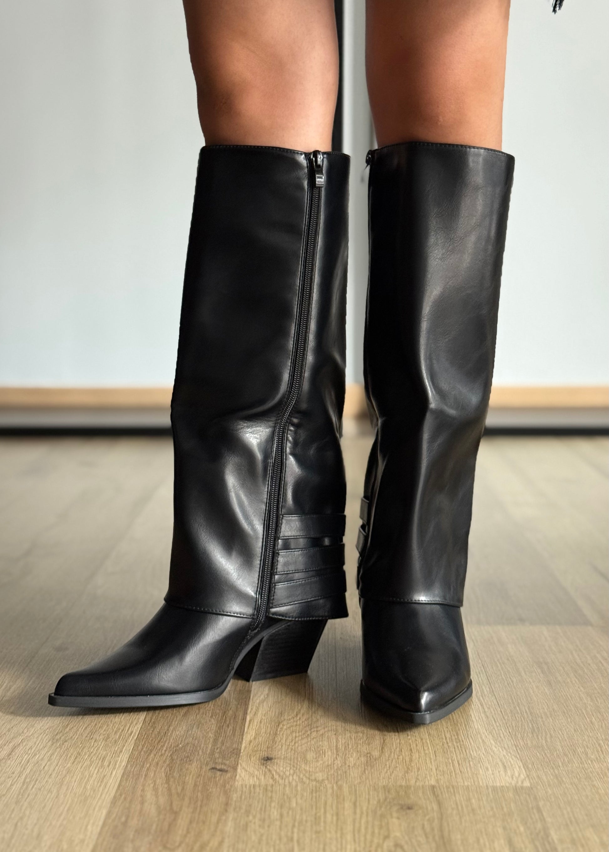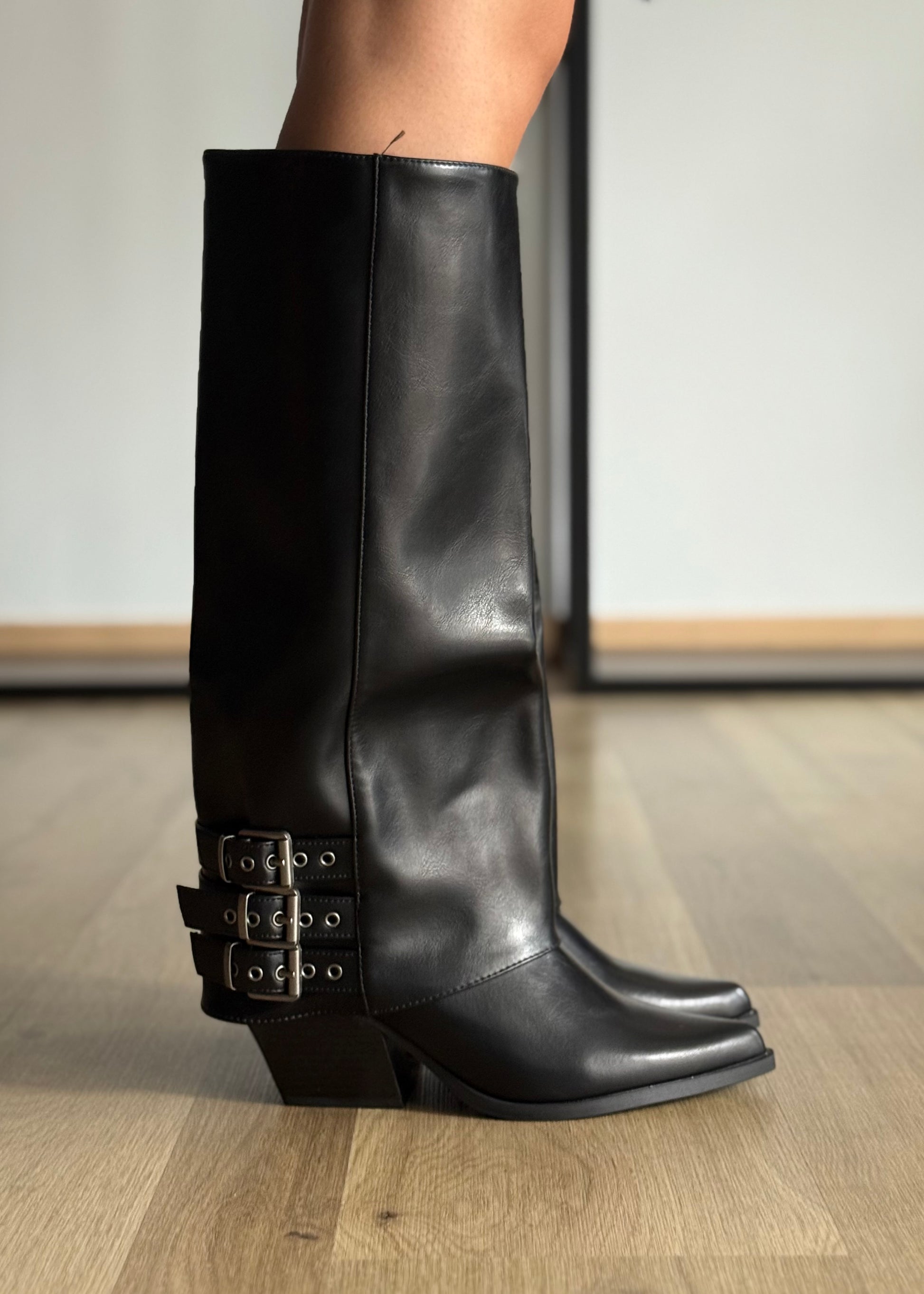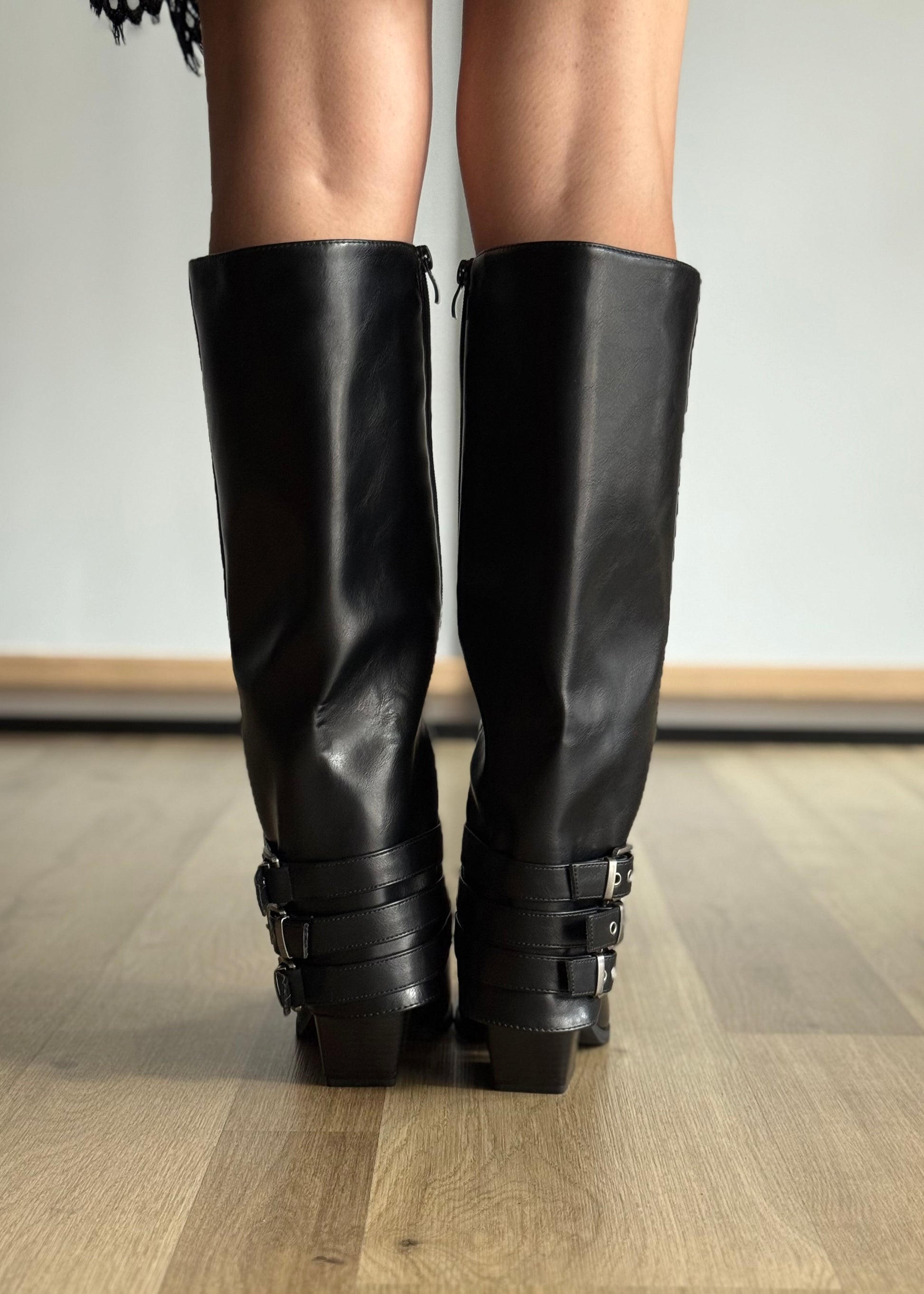 Stivali alti in ecoppelle nera dal design elegante e deciso, con punta e tacco strutturato. I cinturini multipli con fibbie laterali donano carattere e modernità, rendendoli perfetti per look sofisticati e di tendenza.