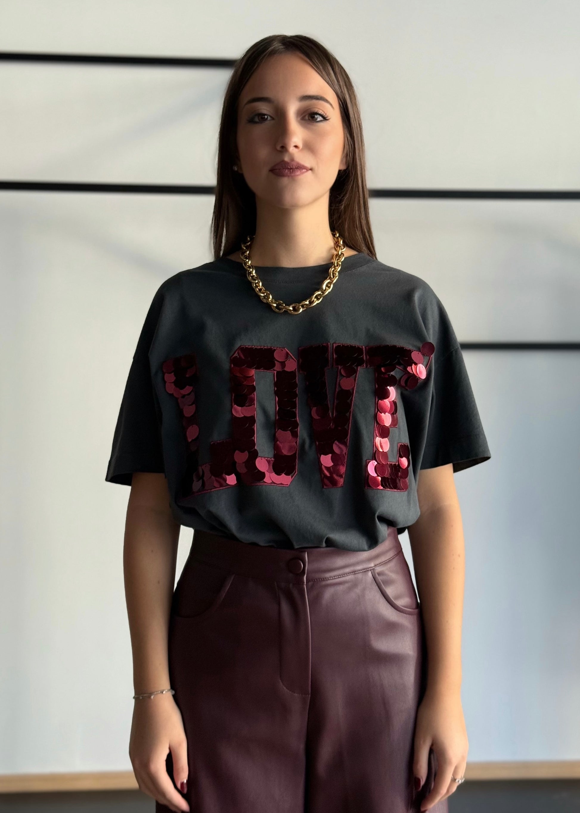 T-shirt a maniche corte in cotone leggero color grigio scuro, impreziosita dalla scritta “LOVE” sul davanti realizzata con paillettes bordeaux. Un capo casual ma di forte impatto, perfetto per aggiungere un tocco luminoso e giocoso agli outfit quotidiani. Da indossare con jeans, pantaloni o gonne per un look moderno e trendy.