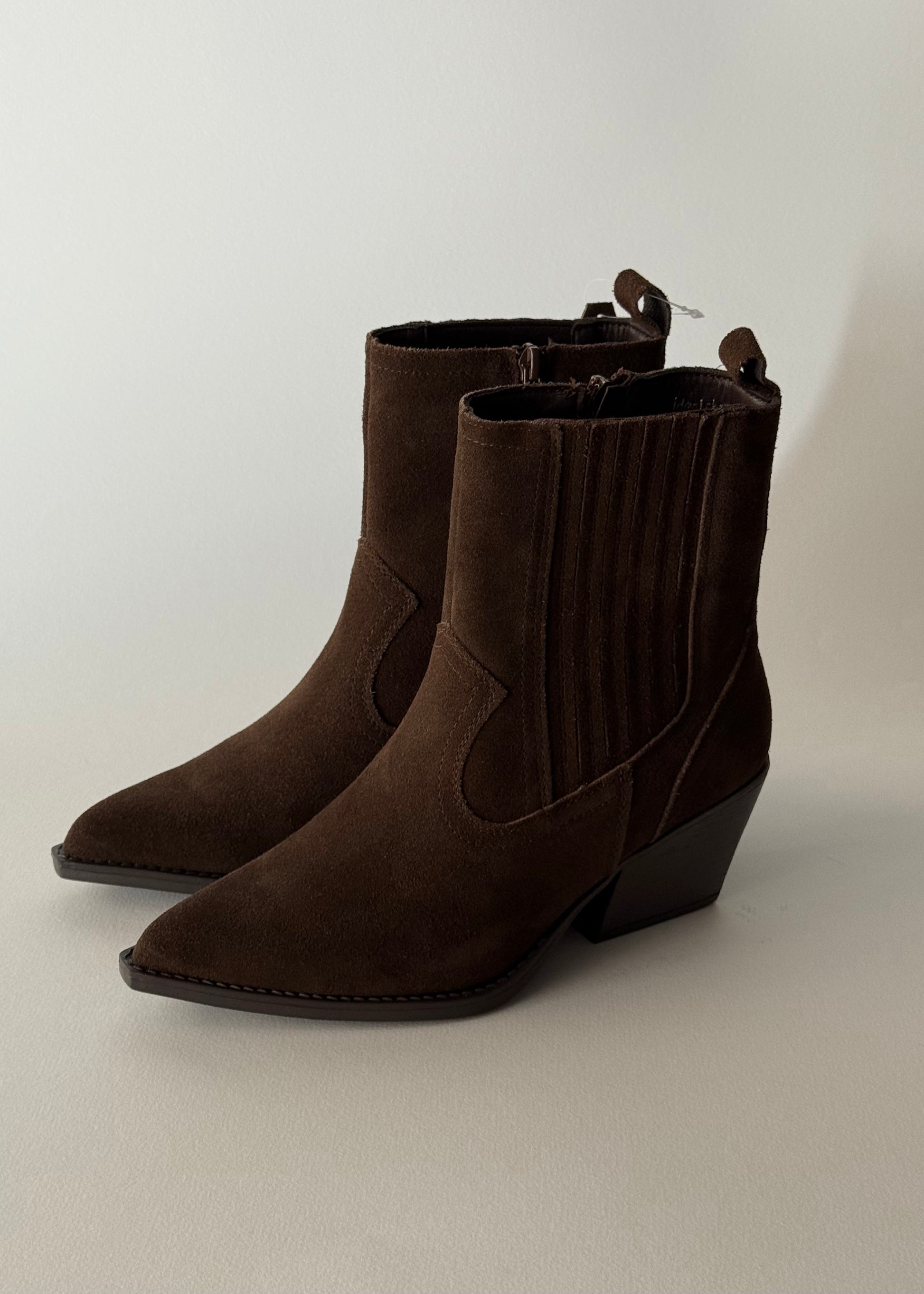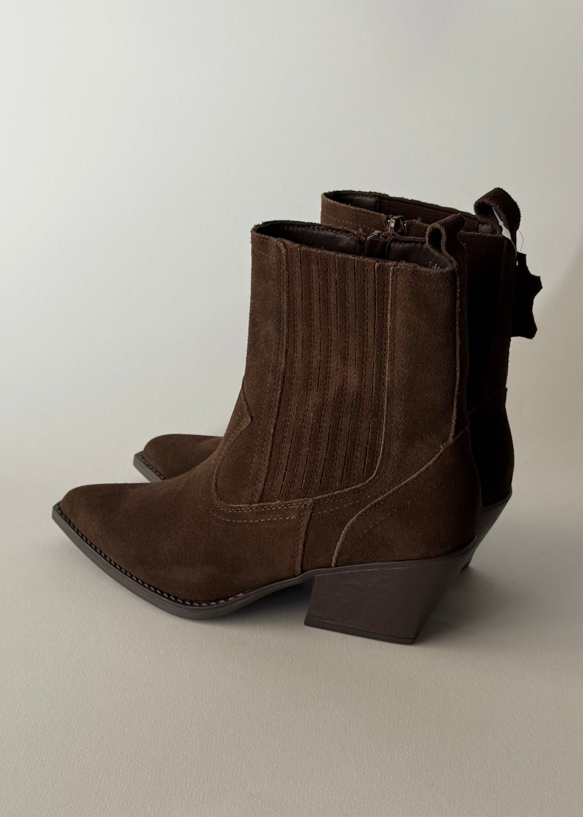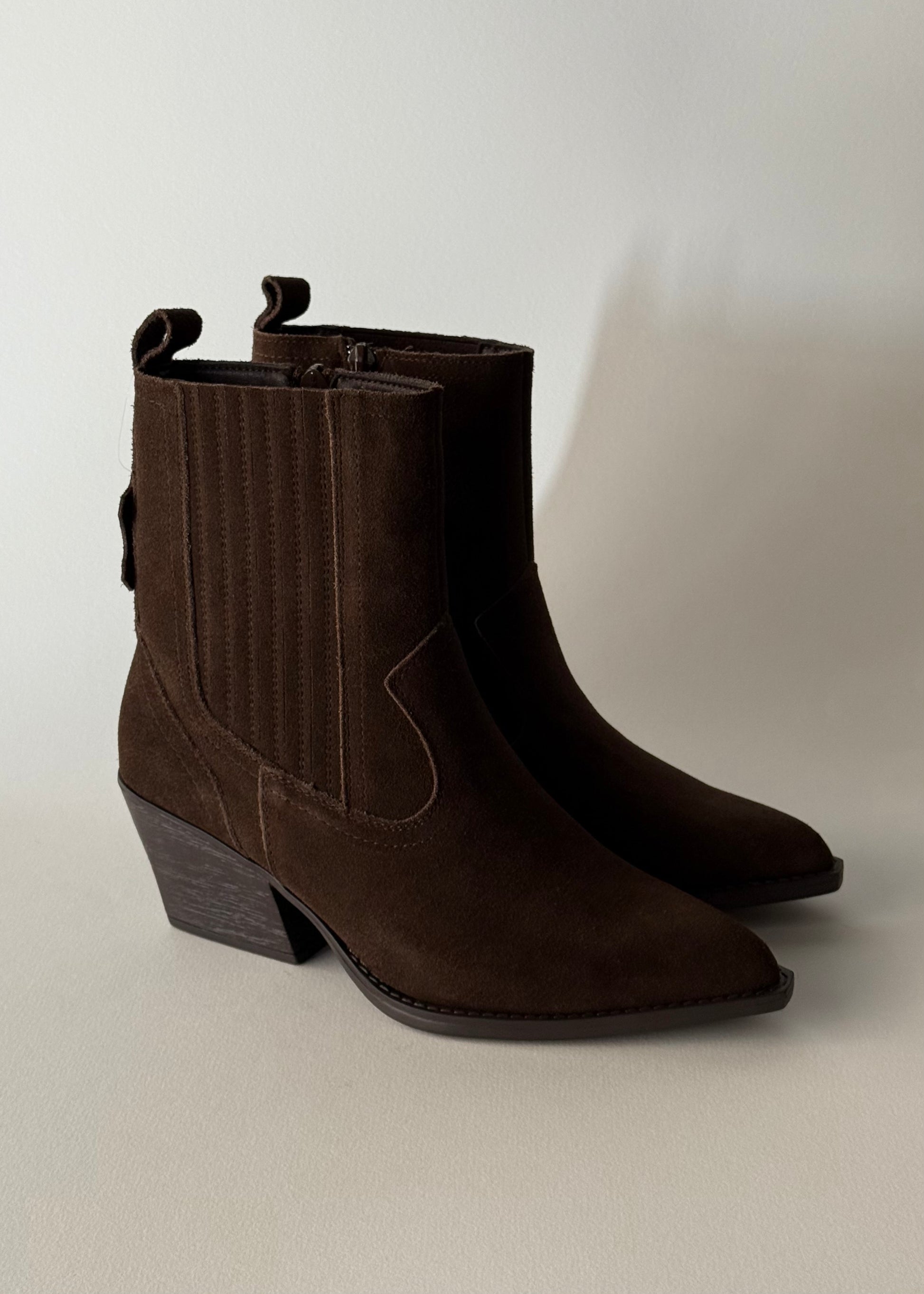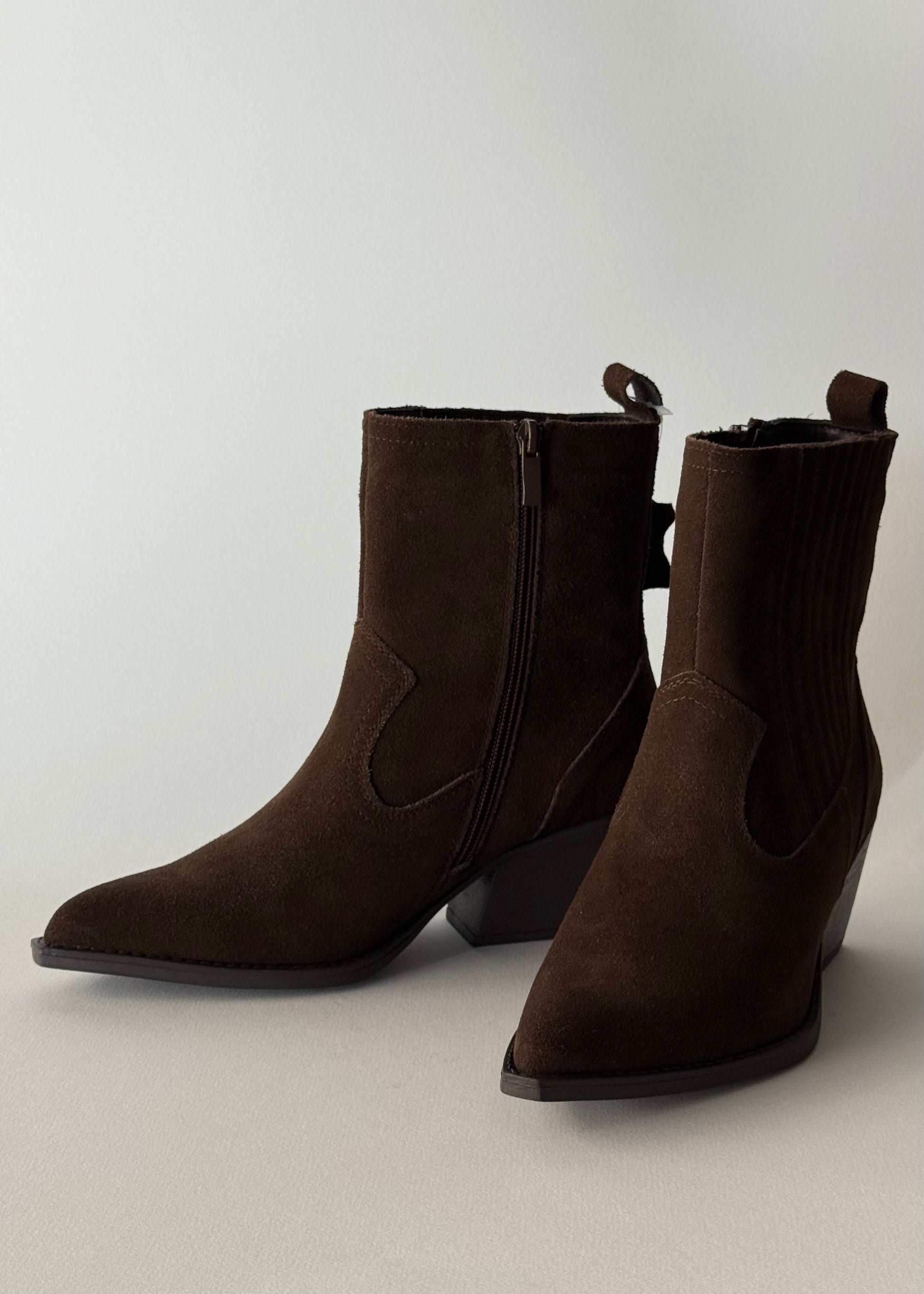 Aggiungi un tocco deciso e senza tempo ai tuoi outfit con questi eleganti stivali texani in camoscio marrone. Il design a punta slanciata e il tacco medio squadrato donano una silhouette femminile e grintosa, ideale per look casual, boho o urban chic.