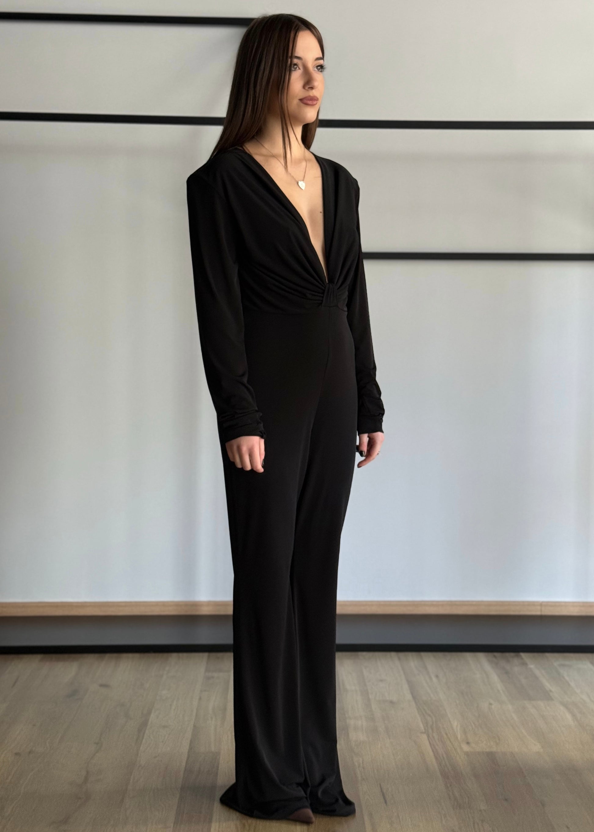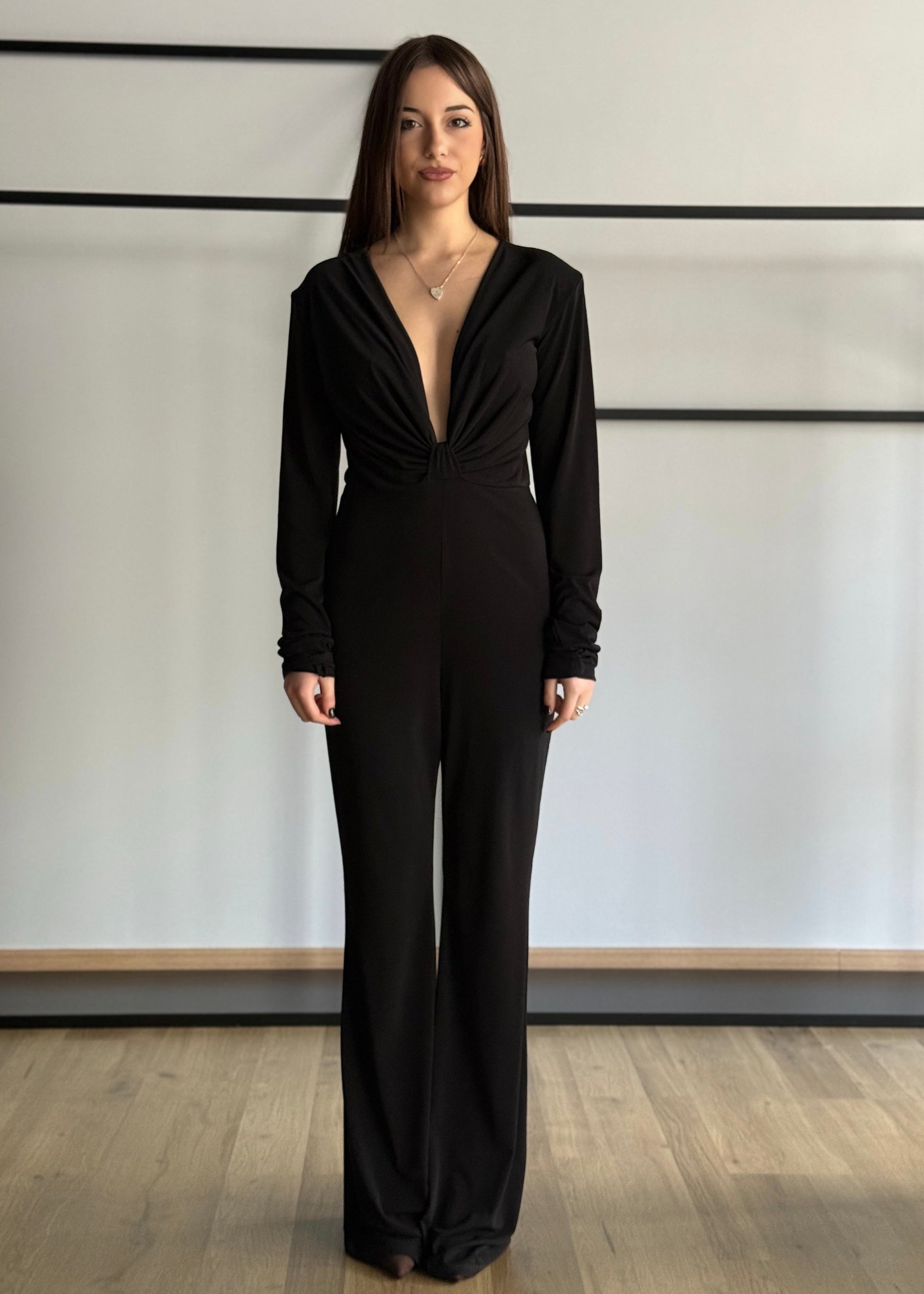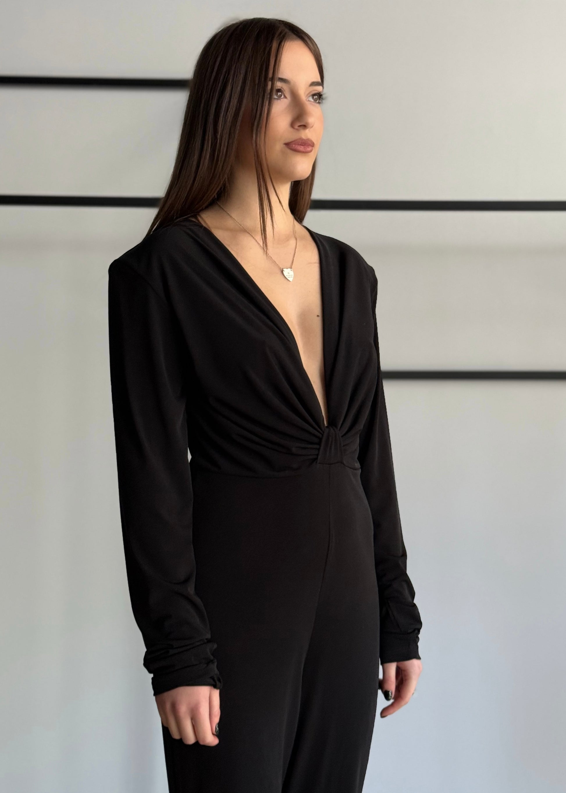 Seduzione ed eleganza si incontrano in questa tuta nera a maniche lunghe, pensata per valorizzare la silhouette con classe. Il suo punto forte è il profondo scollo a V che incornicia il décolleté con un raffinato drappeggio, raccolto da un delicato nodo centrale che dona armonia e slancia la figura.