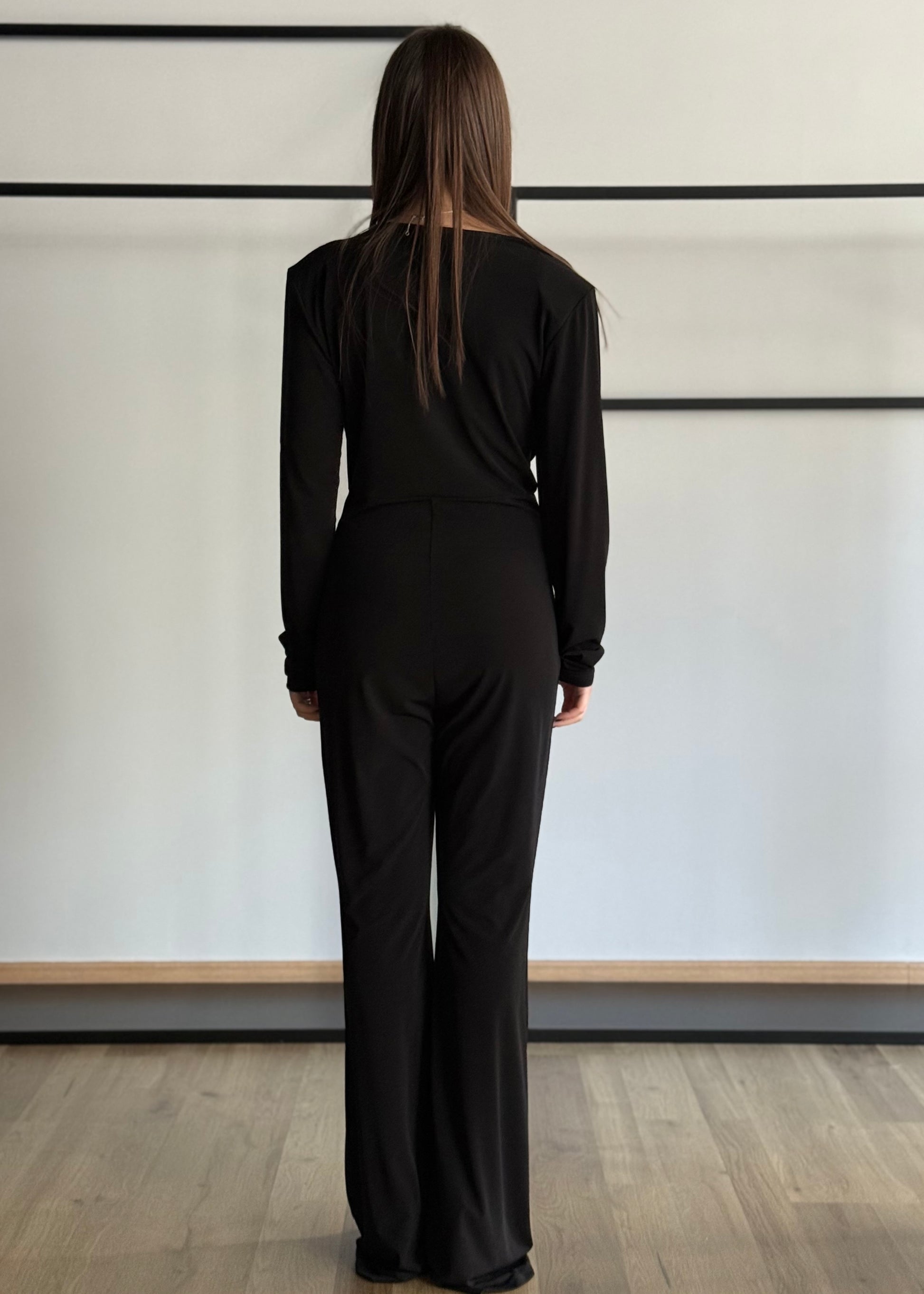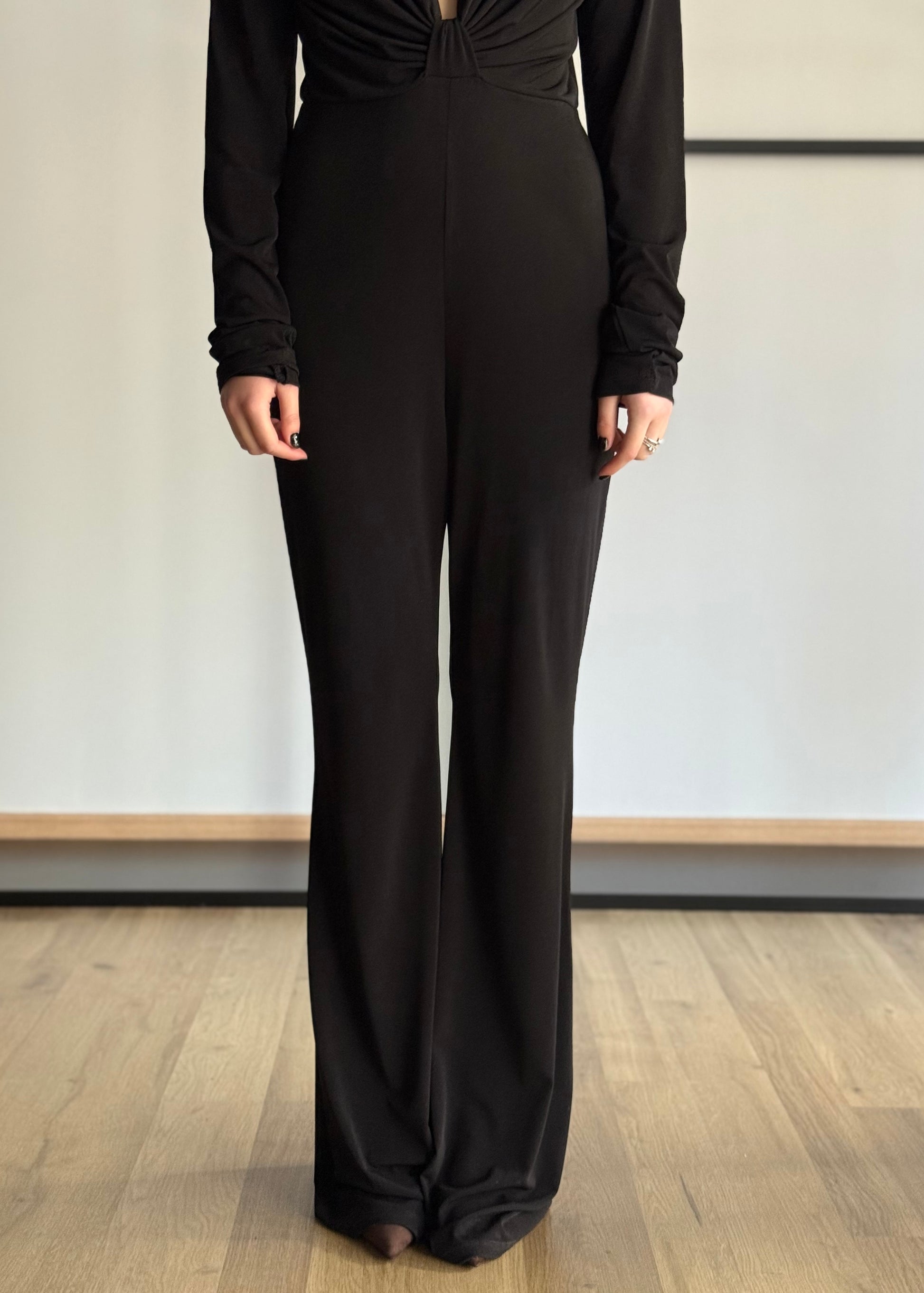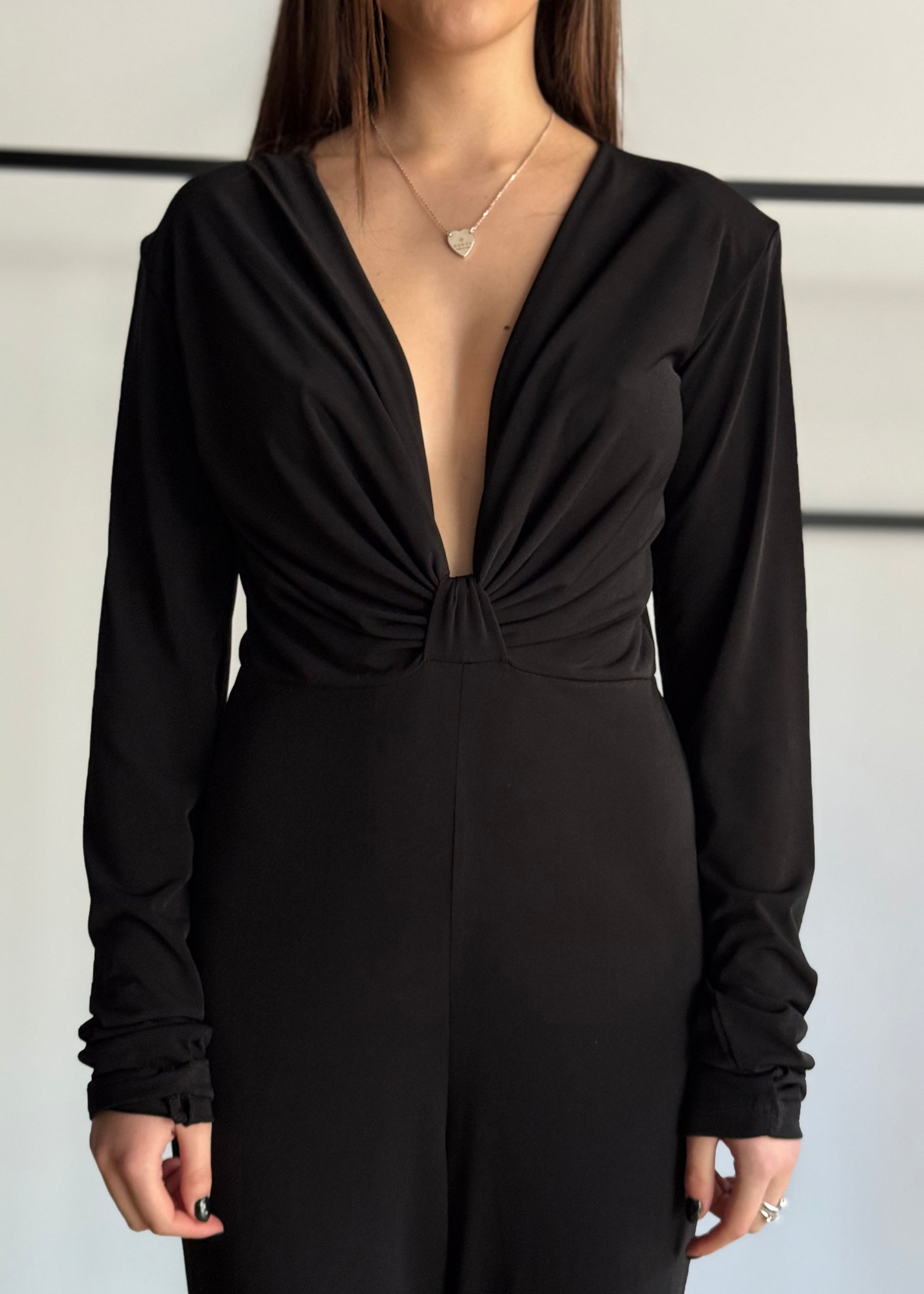 Seduzione ed eleganza si incontrano in questa tuta nera a maniche lunghe, pensata per valorizzare la silhouette con classe. Il suo punto forte è il profondo scollo a V che incornicia il décolleté con un raffinato drappeggio, raccolto da un delicato nodo centrale che dona armonia e slancia la figura.